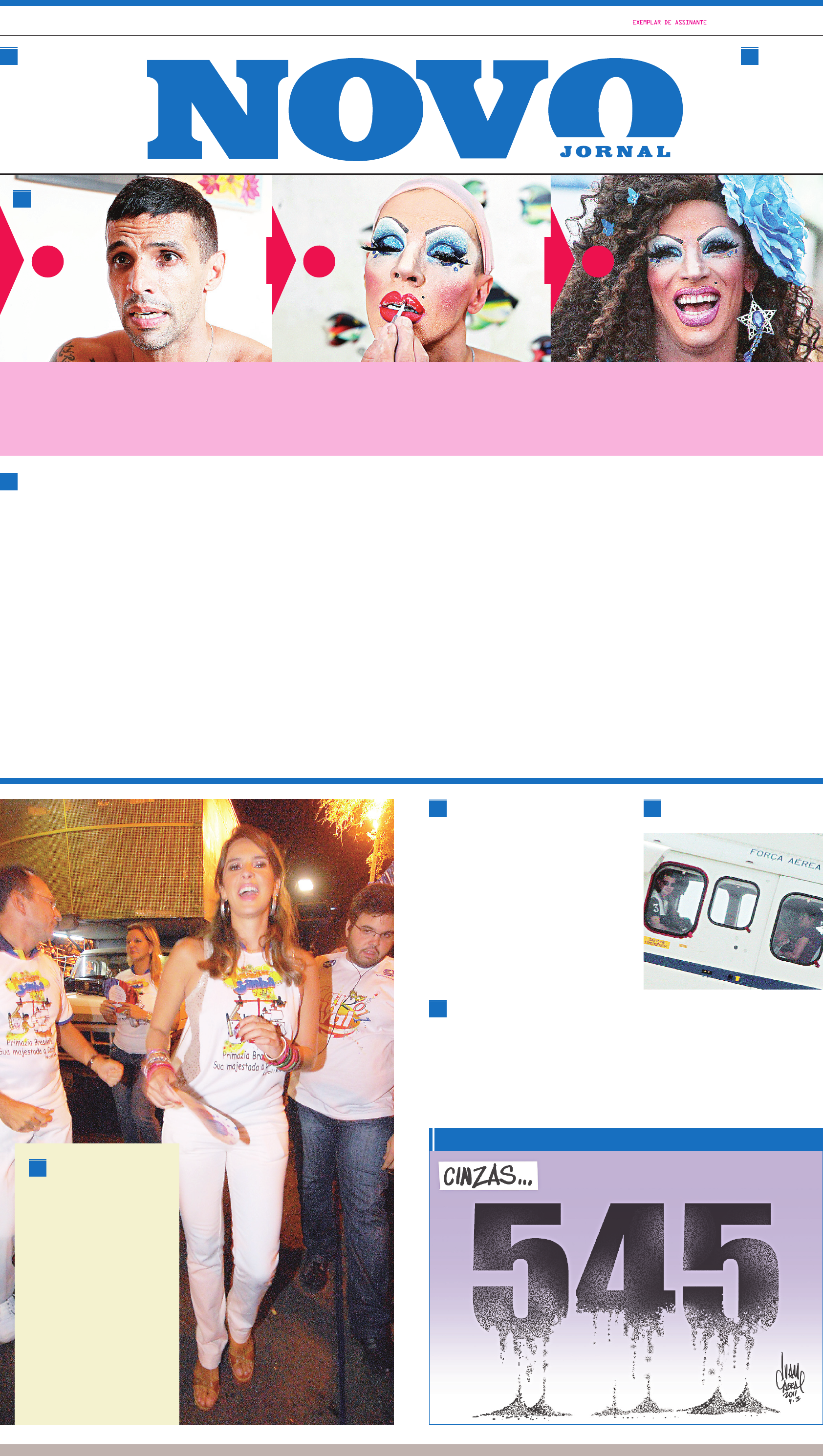 MUITO PRAZER, Shakira completou 15 anos como apresentadora do desfi le das Kengas. Ao subir no palco de um dos mais tradicionais eventos do carnaval natalense, os milhares de foliões saudaram com “parabéns a você” o ator Zilmar Júnior, 45 anos, estudante de enfermagem e que recentemente derrotou um câncer. É ele quem dá vida à drag queen que esbanja alegria no reinado de momo e nas boates da cidade. 09 CIDADES Ano 2 / N° 400 / Natal, QUARTA-FEIRA 9 de março de 2011www.novojornal.jor.br R$ 1,50 16 ESPORTES 04 RODA VIVA FLÁVIO LOPES ASSUME COMANDO DO AMÉRICA E JÁ PEDE REFORÇOS NOS TRÊS SETORES NOVO SECRETARIADO DE MICARLA SERÁ SUBMETIDO A UM PRIMEIRO TESTE AMANHÃ IVAN CABRAL APERTEM OS CINTOS, OS ESTRANGEIROS SUMIRAM EX-SECRETÁRIO DE MICARLA RESPONDE POR IMPROBIDADE A BELA ENTRE OS BAMBAS DILMA VAI EMBORA SEM DAR CHANCE PARA OS PAPARAZZI O Rio Grande do Norte, que chegou a receber 21 voos charters do exterior por semana, hoje mantém apenas dois. Os estrangeiros estão preferindo outros estados nordestinos. A vereadora Júlia Arruda (PSB) deu um brilho especial ao desfi le das escolas de samba de Natal. Ela saiu na Malandros dos Samba ao lado do colega vereador Raniere Barbosa (PRB). 07 ECONOMIA 08 GERAL 05 POLÍTICA 08 GERAL 08 GERAL / PERIGO / LEVANTAMENTO PARCIAL DIVULGADO PELA POLÍCIA RODOVIÁRIA FEDERAL INDICA AUMENTO DE 161% NO NÚMERO DE ACIDENTES NESTE ANO NAS ESTRADAS FEDERAIS DO RN EM COMPARAÇÃO COM O ANO PASSADO - 56 CONTRA OS 21 DE 2010. DADOS SERÃO FECHADOS HOJE JORGE ARAÚJO / FOLHAPRESS CARNAVAL DOS ACIDENTES ▶ Produção começa quase três horas antes da apresentação ▶ Em casa, ouve música religiosa enquanto se maquia ▶ Alegria é o tom marcante da personagem criada há 19 anos 1. 2. 3. FOTOS: IVANÍZIO RAMOS / NJ SHAKIRA, DRAG QUEEN MAGNUS NASCIMENTO / NJ 2 / NOVO JORNAL / NATAL, QUARTA-FEIRA, 9 DE MARÇO DE 2011 Últimas Editor Marcos Bezerra E-mailpauta@novojornal.jor.br Fones84 3201.2443 / 3221.3438 ▶ Plataforma de exploração de petróleo: OPEP deve aumentar oferta DIVULGAÇÃO / PETROBRAS Um acidente, na tarde de ontem, atrapalhou o trânsito no cruzamento da Avenida Prudente de Morais com a Rua Mipibu, próximo à Praça Cívica, bairro do Tirol. O motoris- ta do veículo Chevrolet Kadett, placa MXR-6005, perdeu o controle da direção e capotou. Segundo o comandante da Polícia Militar, coronel Francisco Canindé Araújo, o condu- tor estava alcoolizado, mas, apesar da gravidade do aciden- te, não corre risco de morte. Com leves escoriações, o aci- dentado foi levado ao Hospital Walfredo Gurgel. ANASTÁCIA VAZ / NJ ANASTÁCIA VAZ / NJ O último dia de Carnaval marcou o início das comemo- rações dos 10 anos da Casa da Ribeira e do Centro Cultu- ral do Sol. A Rua Frei Miguelinho foi tomada por centenas de pessoas que puderam assistir shows das bandas Camas- tra (RJ), Bacrueira (PB), Camarones Orquestra Guitarrísti- ca (RN) e DuSouto(RN). As atrações começaram a subir ao palco por volta das 17h. A comemoração neste fi nal de car- naval é apenas o início de uma série de festividades que a Casa da Ribeira e o Centro Cultural pretendem promover durante todo o ano. CARNAVAL NO DIA DO ANIVERSÁRIO MOTORISTA CAPOTA NA PRUDENTE COM A MULHER E CONTRA A MISÉRIA / PRESIDENTE / EM MENSAGEM ÀS MULHERES, DILMA ROUSSEFF DIZ QUE A POBREZA TEM ‘CARA FEMININA’; GOVERNO INVESTE NA MULHER PARA AJUDAR NA POLÍTICA DE ELIMINAÇÃO DA MISÉRIA FOLHAPRESS EM MENSAGEM DIVULGADA ontem por ocasião do Dia Internacional da Mulher, a presidente Dilma Rousseff afi rmou ter como “obje- tivo fundamental” a “erradicação da pobreza extrema”. Ela disse estar convencida de que uma política bem-suce- dida de eliminação da miséria deve ser focada na mulher e na criança. “No Brasil, a pobreza tem cara: ela é muito feminina, está ligada às mulheres. Quanto mais pobre a família, maior a chance de que ela seja chefi ada por uma mulher. Estou convencida de que uma política bem-sucedida de eliminação da miséria deve ser focada na mulher e na criança.” Segundo Dilma, programas como o Minha Casa Minha Vida, o Pronaf (Programa Nacional de Fortalecimento da Agricultura Familiar) Mulher ou o Bolsa Fa- mília são efi cientes porque privi- legiam as mulheres. “No Dia Internacional da Mu- lher, quero ressaltar que a elimi- nação da discriminação de gê- nero e a valorização das mulhe- res e das meninas são estratégias indispensáveis para alcançar- mos êxito em nossa luta contra a pobreza.” A presidente destacou a Lei Maria da Penha como sinal de progresso no combate à violên- cia contra as mulheres. “Mas ainda há muito por fa- zer. Temos o compromisso sa- grado de enfrentar essa ques- tão, intensifi cando e ampliando as medidas adotadas no governo passado. O Brasil que queremos, e que vamos ter, é um país sem violência. É um país com água, com luz, com saneamento, com educação de qualidade e empre- go digno para todos. É um país rico, em que as mulheres e os ho- mens têm as mesmas oportuni- dades e privilégios, contribuindo juntos para o desenvolvimento e o criando seus fi lhos com digni- dade e com orgulho.” ▶ Mosaico com mulheres simples e que marcaram o Brasil, como Ruth Cardoso: aposta na sensibilidade feminina ARQUIVO / ABR MAIS EM GERAL 8 FOLHAPRESS A ESCOLA DE samba Vai-Vai ven- ceu o Carnaval de São Paulo des- te ano e se consolidou como a maior campeã da competição, com 14 títulos. A última vitó- ria da agremiação havia sido em 2008. Com o enredo “A Música Venceu!’’, no qual homenageou o maestro João Carlos Martins, a Vai-Vai fez 269,5 dos 300 pon- tos possíveis. Em segundo lugar fi cou a Acadêmicos do Tucuru- vi e em terceiro a Unidos da Vila Maria. As agremiações Nenê de Vila Matilde e Unidos do Peru- che acabaram rebaixadas. Tradicional escola do bairro Bixiga, no centro paulistano, a Vai-Vai usou alegorias gigantes e fantasias luxuosas que empol- garam o Anhemb