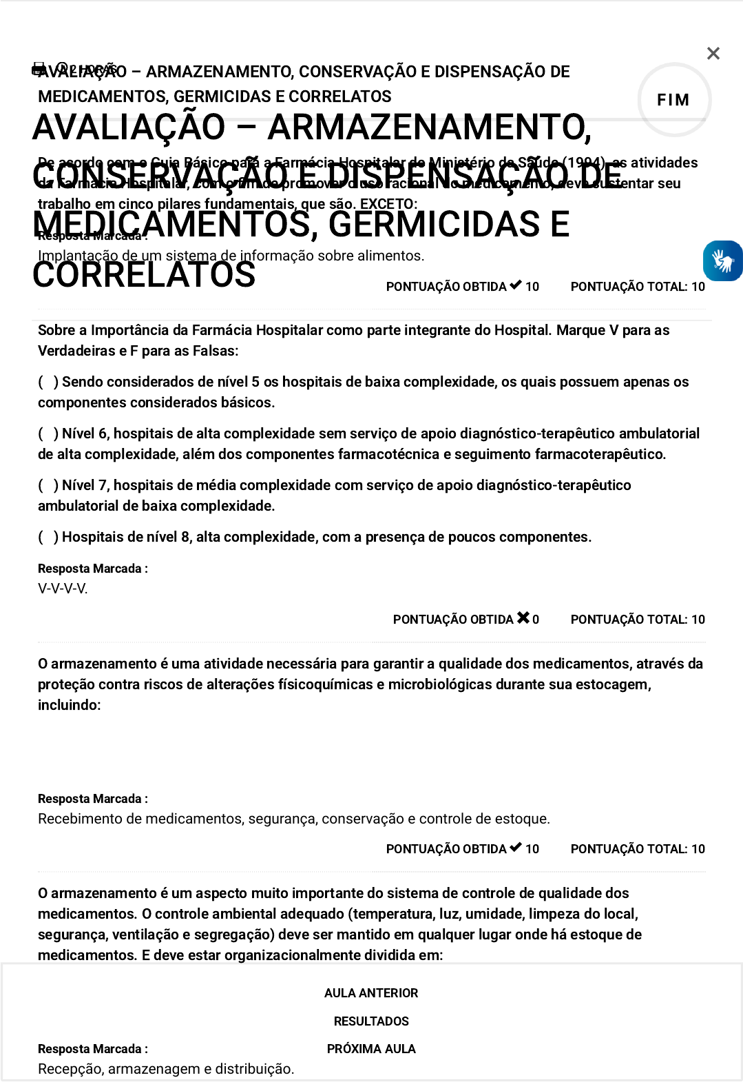 2 HORAS AVALIAÇÃO – ARMAZENAMENTO, CONSERVAÇÃO E DISPENSAÇÃO DE MEDICAMENTOS, GERMICIDAS E CORRELATOS F I M AULA ANTERIOR RESULTADOS PRÓXIMA AULA AVALIAÇÃO – ARMAZENAMENTO, CONSERVAÇÃO E DISPENSAÇÃO DE MEDICAMENTOS, GERMICIDAS E CORRELATOS PONTUAÇÃO TOTAL: 10PONTUAÇÃO OBTIDA 10 De acordo com o Guia Básico para a Farmácia Hospitalar do Ministério da Saúde (1994), as atividades da Farmácia Hospitalar, com o fim de promover o uso racional do medicamento, deve sustentar seu trabalho em cinco pilares fundamentais, que são. EXCETO: Resposta Marcada : Implantação de um sistema de informação sobre alimentos. PONTUAÇÃO TOTAL: 10PONTUAÇÃO OBTIDA 0 Sobre a Importância da Farmácia Hospitalar como parte integrante do Hospital. Marque V para as Verdadeiras e F para as Falsas: ( ) Sendo considerados de nível 5 os hospitais de baixa complexidade, os quais possuem apenas os componentes considerados básicos. ( ) Nível 6, hospitais de alta complexidade sem serviço de apoio diagnóstico-terapêutico ambulatorial de alta complexidade, além dos componentes farmacotécnica e seguimento farmacoterapêutico. ( ) Nível 7, hospitais de média complexidade com serviço de apoio diagnóstico-terapêutico ambulatorial de baixa complexidade. ( ) Hospitais de nível 8, alta complexidade, com a presença de poucos componentes. Resposta Marcada : V-V-V-V. PONTUAÇÃO TOTAL: 10PONTUAÇÃO OBTIDA 10 O armazenamento é uma atividade necessária para garantir a qualidade dos medicamentos, através da proteção contra riscos de alterações físicoquímicas e microbiológicas durante sua estocagem, incluindo: Resposta Marcada : Recebimento de medicamentos, segurança, conservação e controle de estoque. O armazenamento é um aspecto muito importante do sistema de controle de qualidade dos medicamentos. O controle ambiental adequado (temperatura, luz, umidade, limpeza do local, segurança, ventilação e segregação) deve ser mantido em qualquer lugar onde há estoque de medicamentos. E deve estar organizacionalmente dividida em: Resposta Marcada : Recepção, armazenagem e distribuição. × https://ava.educaminas.com.br/membros/01429982225/course/course-results/?action=402014 AULA ANTERIOR RESULTADOS PRÓXIMA AULA AVALIAÇÃO – ARMAZENAMENTO, CONSERVAÇÃO E DISPENSAÇÃO DE MEDICAMENTOS, GERMICIDAS E CORRELATOS PONTUAÇÃO TOTAL: 10PONTUAÇÃO OBTIDA 10 De acordo com o Guia Básico para a Farmácia Hospitalar do Ministério da Saúde (1994), as atividades da Farmácia Hospitalar, com o fim de promover o uso racional do medicamento, deve sustentar seu trabalho em cinco pilares fundamentais, que são. EXCETO: Resposta Marcada : Implantação de um sistema de informação sobre alimentos. PONTUAÇÃO TOTAL: 10PONTUAÇÃO OBTIDA 0 Sobre a Importância da Farmácia Hospitalar como parte integrante do Hospital. Marque V para as Verdadeiras e F para as Falsas: ( ) Sendo considerados de nível 5 os hospitais de baixa complexidade, os quais possuem apenas os componentes considerados básicos. ( ) Nível 6, hospitais de alta complexidade sem serviço de apoio diagnóstico-terapêutico ambulatorial de alta complexidade, além dos componentes farmacotécnica e seguimento farmacoterapêutico. ( ) Nível 7, hospitais de média complexidade com serviço de apoio diagnóstico-terapêutico ambulatorial de baixa complexidade. ( ) Hospitais de nível 8, alta complexidade, com a presença de poucos componentes. Resposta Marcada : V-V-V-V. PONTUAÇÃO TOTAL: 10PONTUAÇÃO OBTIDA 10 O armazenamento é uma atividade necessária para garantir a qualidade dos medicamentos, através da proteção contra riscos de alterações físicoquímicas e microbiológicas durante sua estocagem, incluindo: Resposta Marcada : Recebimento de medicamentos, segurança, conservação e controle de estoque. O armazenamento é um aspecto muito importante do sistema de controle de qualidade dos medicamentos. O controle ambiental adequado (temperatura, luz, umidade, limpeza do local, segurança, ventilação e segregação) deve ser mantido em qualquer lugar onde há estoque de medicamentos. E deve estar organizacionalmente dividida em: Resposta Marcada : Recepção, armazenagem e distribuição. https://ava.educaminas.com.br/membros/01429982225/course/course-results/?action=402014