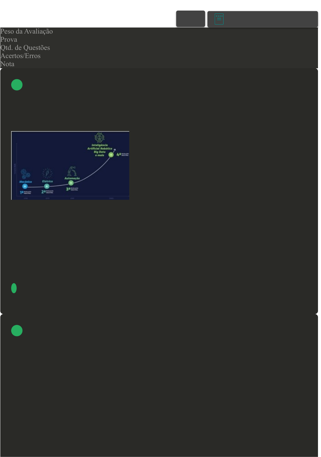 08/05/2023, 13:09 Avaliação I - Individual about:blank 1/7 Prova Impressa GABARITO | Avaliação I - Individual (Cod.:825401) Peso da Avaliação 1,50 Prova 63579369 Qtd. de Questões 10 Acertos/Erros 10/0 Nota 10,00 As indústrias precisaram evoluir para continuarem competitivas no mercado. A evolução industrial é uma constante e cada vez mais os engenheiros e técnicos deverão acompanhar estes novos desafios que o mercado impõe. Esta evolução dos modelos de transformação industrial está apresentada de forma resumida na figura a seguir, na qual são apresentadas as principais eras da Revolução Industrial (representadas no infográfico Complexidade x Tempo). Assinale a alternativa CORRETA que corresponde diretamente com a ideia de evolução industrial: A A maior demanda de profissionais de manutenção pode ser observada entre a primeira e a segunda Revolução Industrial, uma vez que houve extrema necessidade de profissionais com conhecimentos na área de eletrotécnica. B A necessidade crescente de pessoas qualificadas para lidar com as novas tecnologias é responsável pelo crescimento exponencial entre a terceira e a quarta Revolução Industrial. C Houve um crescimento linear na evolução industrial, sendo necessária também uma adaptação dos procedimentos de manutenção todas as etapas desde a primeira Revolução até a quarta. D Sempre houve preocupação com a manutenção industrial, ou seja, ela sempre existiu, entretanto não era vista como uma técnica direcionada à manutenção, era tão somente algo necessário para o funcionamento das máquinas. Levando em consideração os dois tipos manutenção industrial: a Manutenção Corretiva e a Manutenção Preventiva, sabe-se que ambas possuem diferentes conceitos e aplicações na indústria. Sobre o exposto, classifique V para as sentenças verdadeiras e F para as falsas: ( ) A manutenção não planejada é muito indesejada em nível organizacional, também é conhecida como manutenção corretiva, já que ela tem como objetivo corrigir problemas que ocorreram nos equipamentos. ( ) Podemos classificar as manutenções planejadas em preventiva e preditiva. ( ) Manutenção preventiva foco prever os possíveis problemas preventivamente baseada em conhecimentos prévios de manuais, fornecedores e outras técnicas matemáticas que buscam prever as condições de cada componente dos equipamentos produtivos. ( ) Na manutenção não planejada é desenvolvido um conjunto de procedimentos e ações de forma antecipada, que buscam manter os equipamentos em funcionamento, gerando a maior disponibilidade possível do equipamento para a produção. ( ) A manutenção de falha inesperada e a manutenção considerada de forma ocasional fazem parte VOLTAR A+ Alterar modo de visualização 1 2 08/05/2023, 13:09 Avaliação I - Individual about:blank 2/7 da manutenção não planejada. Assinale a alternativa que apresenta a sequência CORRETA: A V - V - F - F - V. B V - V - V - F - V. C F - V - F - F - F. D V - F - F - V - V. Gurski (2002) classifica a história da manutenção industrial em três principais eras: Primeira Geração, Segunda Geração e Terceira Geração. Sobre o exposto, associe os itens, utilizando o código a seguir: I- Primeira Geração. II- Segunda Geração. III- Terceira Geração. ( ) A paralisação da produção era uma preocupação generalizada, já que diminui a capacidade de produção, aumenta os custos e afeta a qualidade dos produtos. ( ) A indústria era pouco mecanizada, os equipamentos eram simples e, na sua maioria, superdimensionados. Aliado a tudo isto, devido à conjuntura econômica da época, a questão da produtividade não era prioritária. ( ) Começa a se evidenciar a necessidade de mais disponibilidade, bem como maior confiabilidade: a indústria estava bastante dependente do bom funcionamento das máquinas. Isto levou à ideia de que falhas dos equipamentos poderiam e deveriam ser evitadas, o que resultou no conceito de manutenção preventiva. ( ) Não era necessária uma manutenção sistematizada; apenas serviços de limpeza, lubrificação e reparo após a quebra, ou seja, a manutenção era, fundamentalmente, corretiva. ( ) Aumentaram a demanda por todo tipo de produtos, ao mesmo tempo em que o contingente de mão de obra industrial diminuiu sensivelmente. Assinale a alternativa que apresenta a sequência CORRETA: FONTE: GURSKI, Carlos Alberto. Noções de confiabilidade e manutenção industrial. 2002. Disponível em: http://www.tecnicodepetroleo.ufpr.br/apostilas/petrobras/confiabilidade_e_manutencao.pdf. Acesso em: 28 dez. 2013. A II - III - I - I - I. B I - II - III - II - III. C II - I - III - III - II. D III - I - II - I - II. 3 08/05/2023, 13:09 Avaliação I - Individual about:blank 3/7 Segundo a NBR 5462, o conceito de manutenção é definido como a combinação de todas as ações técnicas e administrativas, incluindo as de supervisão, destinadas a manter ou recolocar um item em um estado no qual possa desempenhar uma função requerida. A norma ainda apresenta uma nota que diz que a manutenção pode incluir uma modificação do item. Conforme a NBR 5462 - Confiabilidade e mantenabilidade, associe os itens utilizando o código a seguir: I- Manutenção preventiva. II- Manutenção corretiva. III- Manutenção programada. IV- Manutenção deferida. V- Manutenção controlada/Manutenção preditiva. ( ) Manutenção que permite garantir uma qualidade de serviço desejada, com base na aplicação sistemática de técnicas de análise, utilizando-se de meios de supervisão centralizados ou de amostragem, para reduzir ao mínimo a manutenção preventiva e diminuir a manutenção corretiva. ( ) Manutenção efetuada em intervalos predeterminados, ou de acordo com critérios prescritos, destinada a reduzir a probabilidade de falha ou a degradação do funcionamento de um item. ( ) Manutenção preventiva efetuada de acordo com um programa preestabelecido. ( 