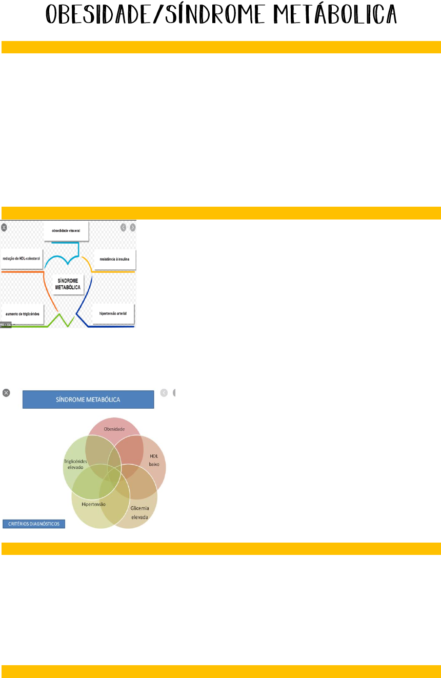 IESC VI CAROLINA FERREIRA O QUE É OBESIDADE? COMO MEDIR? -É um agravo multifatorial originado pelo balanço energético positivo favorecendo ao acúmulo de gordura corporal -Acarreta repercussões na saúde como perda importante na qualidade de vida bem como aumento de comorbidades -As causas incluem influências genéticas, ambientais e sociais. -O acúmulo de gordura pode ser mensurado por meio do índice de massa corpórea(IMC). -Prevalência: H: excesso de peso 57,3% e obesidade 17,5% M: excesso de peso 59,8% e obesidade 25,2% Crianças de 5-9 anos: meninos sobrepeso 34,8% e obesidade 16,6%; meninas sobrepeso 32% e obesidade 11,8% SÍNDROME METABÓLICA -É um conjunto de fatores que, associados, vão levar ao ↑do risco de problemas cardiovasculares: obesidade, hipertensão, dislipidemia e glicemia aumentada. -Tem como base a resistência à ação da insulina -Fatores de risco: ↑ da circunferência abdominal: em homens > que 94 cm e nas mulheres, > que 80 cm; baixo HDL : em homens menos que 40mg/dl e nas mulheres menos do que 50mg/dl; triglicerídeos elevados : 150mg/dl ou superior; pressão sanguínea alta: 135/85 mmHg ou superior glicose elevada: 110mg/dl ou superior. ANAMNESE -Idade de início, -Maior e < pesos alcançados, -História familiar -Tentativas de emagrecimento(sucessos e recaídas) -Padrão alimentar -Sintomas psiquiátricos, doenças endócrinas.(transtorno do BINGE) -Uso de medicamentos. - Dados que avaliam as possíveis causas e as repercussões psicológicas. EXAME FÍSICO -IMC-estimativa prática -Bioimpedância IESC VI CAROLINA FERREIRA -Em crianças: curva de percentil (sobrepeso 85-95% e obesidade acima de 95%); curvas da OMS (caderneta) -Medida da circunferência abdominal em adultos c/ IMC menos 35%; Homem normal < 94 cm e mulheres < que 80 cm -Sinais de doenças associadas a obesidade secundaria PLANO DE CUIDADO IESC VI CAROLINA FERREIRA IESC VI CAROLINA FERREIRA IESC VI CAROLINA FERREIRA