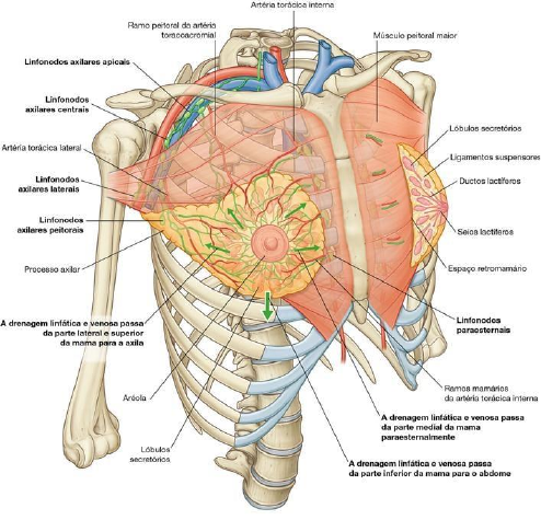 - Mamas Femininas - | #2 Módulo | Anatomia das Mamas As mamas são glândula sudoríparas modificadas na fáscia superficial, anterior aos músculos peitorais maior e menor e parede torácica anterior. Consistem em ductos e lóbulos secretórios associados. Na mulher não lactante, o componente predominante das mamas é o tecido adiposo. As mamas estão localizadas na fáscia profunda do músculo peitoral maior e outros músculos circundantes. Uma camada de tecido conjuntivo frouxo (espaço retromamário) separa a mama da fáscia profunda e fornece algum grau de movimentação. A superfície de fixação de cada mama estende- se verticalmente das costelas 2 a 6, e transversalmente do esterno até a linha axilar média. Suprimento arterial: Lateralmente, vasos da artéria axilar média – torácica superior, toracoacromial, torácica lateral e artéria subescapular. Medialmente, ramos da artéria torácica interna. Drenagem venosa: As veias responsáveis pela drenagem sanguínea das mamas correm paralelamente às artérias até as veias axilares, torácica interna e intercostal. Drenagem linfática: Via vasos linfáticos que drenam lateral e superiormente para os linfonodos axilares (que drenam para os troncos subclávios). Via vasos linfáticos que drenam para os linfonodos paraesternais (que drenam para os troncos broncomeadiastinais). Via vasos linfáticos que drenam para os linfonodos intercostais (que drenam para o ducto torácico ou para os troncos broncomeadiastinais). Lesões Epiteliais Benignas As lesões epiteliais benignas são classificadas em três grupos: 1. Alterações mamárias não proliferativas: não estão associadas a aumento do risco de câncer de mama. a. Cistos. b. Fibrose. c. Adenose. 2. Doença mamária proliferativa: provavelmente não são reais precursoras do carcinoma. a. Hiperplasia epitelial. b. Adenose esclerosante. c. Papiloma. Figura 1 — Adenose Esclerosante Figura 2 — Papiloma 3. Hiperplasia atípica: é uma proliferação clonal que tem algumas, mas não todas, características histológicas necessárias para o diagnóstico do carcinoma in situ. Está associada com o aumento moderado do risco de carcinoma. a. Hiperplasia ductal atípica: consiste em uma proliferação relativamente monomórfica de células espaçadas regularmente. b. Hiperplasia lobular atípica.: consiste em células idênticas àquelas do carcinoma lobular in situ, mas as células não preenchem ou distendem mais de 50% dos ácinos em um lóbulo. Figura 3 — Hiperplasia ductal atípica Carcinomas Mamários Principais tumores malignos da mama. Ocupa o primeiro lugar tanto em incidência quanto em letalidade, segundo estimativas do INCA. Clinicamente, manifesta-se por: nódulo palpável, anormalidades mamográficas, achado incidental em fragmentos de mama retirados por outra razão, pelo encontro de células malignas na investigação de derrames papilares ou por suas metástases. Fatores de risco: Idade, dieta, sedentarismo, obesidade, etilismo, histórico familiar, influências hormonais, lesões epiteliais proliferativas atípicas, menarca precoce, menopausa tardia, nuliparidade, radioterapia prévia. Etiologia e patogênese: 1. Estimulação estrogênica. 2. Inativação de genes supressores de tumor (BRCA-1, BRCA-2, TP53 e PTEN). 3. Amplificação do gene HER2. 4. Outras alterações em: STK11, MLH1 e MLH2. Adenocarcinoma Carcinoma ductal: In situ: é o tipo de carcinoma in situ mais frequente na mama. A lesão é formada por células coesas, com distribuição segmentar e confinada ao sistema ducto-lobular. Invasivo: Carcinoma lobular: In situ: Invasivo: apresenta maior tendência a multicentricidade, bilateralidade e recidiva sistêmica com metástases em locais pouco usuais (p. ex. cavidade abdominal, pleura, meninges, estômago). As lesões são firmes e estreladas. As células são pequenas e homogêneas com crescimento difuso, infiltrando-se no estroma em forma de fila indiana, no qual as células se dispõem entre as fibras colágenas. Figura 4 — Carcinoma lobular invasivo CA ductal CA lobular Expressão da E-caderina POSITIVO NEGATIVO Perfil Molecular A avaliação de perfis de expressão gênica por teste moleculares identifica subtipos moleculares associados a comportamentos e cursos clínicos diversos. Podem ser: RH positivo e HER2 negativo: tipo luminal (mais comum). RH positivo e HER2 positivo. RH negativo e HER2 positivo. Triplo negativo (negativo para receptores hormonais e HER2). Disseminação Carcinomas invasivos disseminam-se por invasão local e pelas vias linfáticas e sanguínea. Metástases linfáticas ocorrem inicialmente nos linfonodos do nível inferior da axila. Skip metástases e envolvimento das cadeias mamária interna e supraclavicular, sem comprometimento axilar prévio, são raras. Metástases sistêmicas ocorrem em pulmões, ossos (metástase osteolíticas), fígado, suprarrenais, ovários e sistema nervoso central. Mamografia Mamografia utiliza ampola de raio-x com molibdênio e ródio. A compressão da mama é necessária para aproximar o tecido do filme, diminuindo assim a dispersão e melhorando a resolução. Incidências: Craniocaudal (observa-se quadrantes laterais acima e mediais em baixo). Médio-lateral oblíqua (onde é possível observar o músculo peitoral maior, quadrantes superiores acima e inferiores em baixo). Classificação BIRADS: Quando se encontra BIRADS 0 em uma mamografia com nodulação, é necessário solicitar USG ou RMN. A escolha do método de biópsia (guiada por USG, mamografia ou RMN) é aquele em que é possível verificar melhor o nódulo suspeito. Quando se encontra BIRADS 2 em uma mamografia, entende-se que foi encontrada um achado benigno. Quando se encontra BIRADS 3 em uma mamografia, entende-se que foi encontrada dois achados benignos. Quando se encontra BIRADS 4 em uma mamografia, entende-se que foi encontrada um achado de malignidade. Quando se encontra BIRADS 5 em uma mamografia, entende-se que f