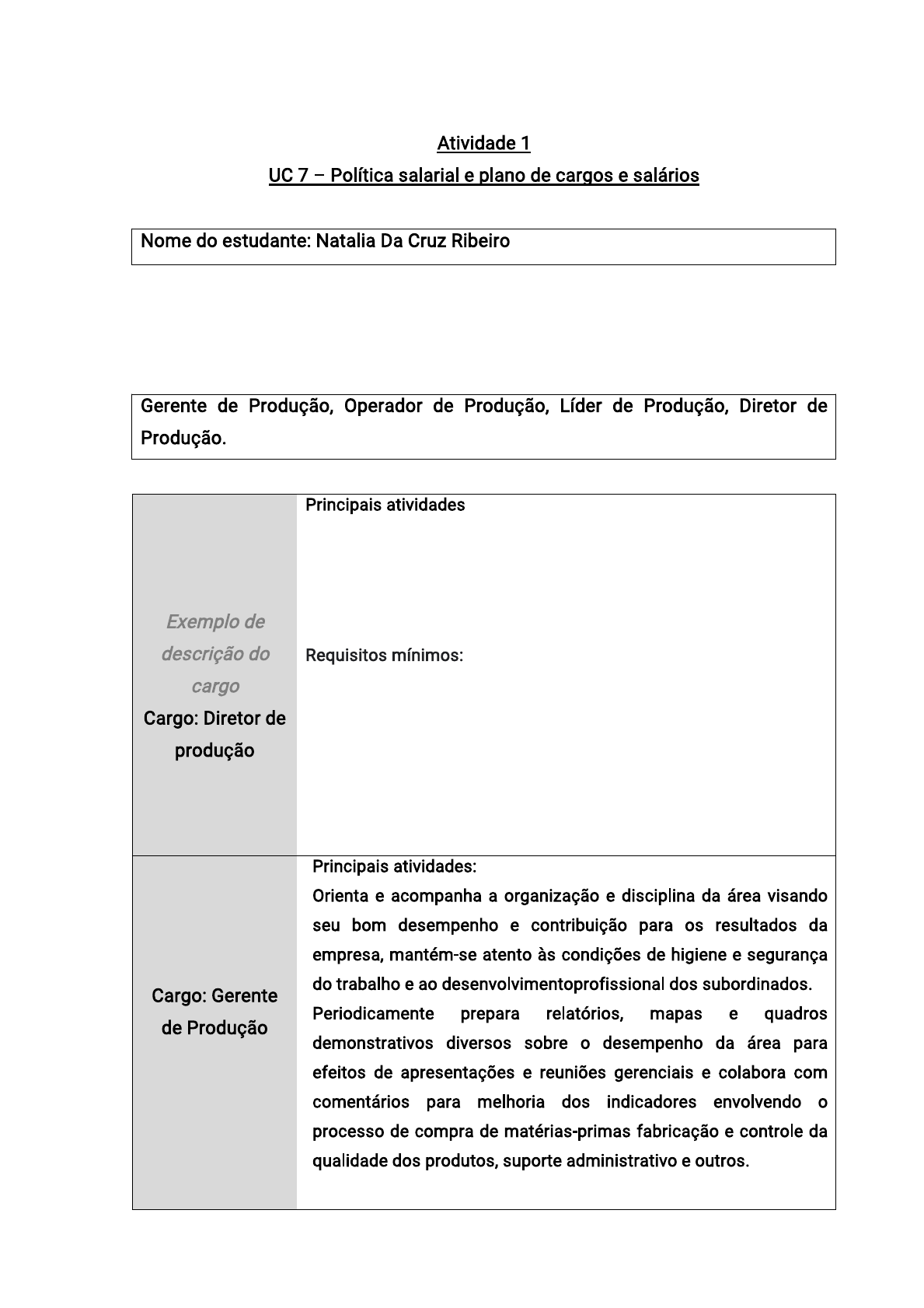 Atividade 1 UC 7 – Política salarial e plano de cargos e salários Nome do estudante: Natalia Da Cruz Ribeiro Pesquise em sites de vagas de emprego as principais atividades e os requisitos mínimos exigidos para os seguintes cargos: Gerente de Produção, Operador de Produção, Líder de Produção, Diretor de Produção. Exemplo de descrição do cargo Cargo: Diretor de produção Principais atividades: Planejar, organizar e controlar as atividades de fabricação dos produtos da empresa, formulando e recomendando políticas e programas de produção. Requisitos mínimos: Graduação em engenharia mecânica ou de produção Gestão de equipes e liderança Planejamento estratégico Conhecimentos em KPI Fluência em outros idiomas Soft skills Cargo: Gerente de Produção Principais atividades: Orienta e acompanha a organização e disciplina da área visando seu bom desempenho e contribuição para os resultados da empresa, mantém-se atento às condições de higiene e segurança do trabalho e ao desenvolvimentoprofissional dos subordinados. Periodicamente prepara relatórios, mapas e quadros demonstrativos diversos sobre o desempenho da área para efeitos de apresentações e reuniões gerenciais e colabora com comentários para melhoria dos indicadores envolvendo o processo de compra de matérias-primas fabricação e controle da qualidade dos produtos, suporte administrativo e outros. Requisitos mínimos: Experiência comprovada como gerente de produçãoProfundos conhecimentos em gestão de produçãoCompreensão dos padrões de qualidade e regulamentos de saúde e segurançaConhecimento dos conceitos de avaliação de desempenho e orçamentoExperiência na preparação de relatórios sobre as principais métricas de produçãoProficiência em MS Office e softwares ERPNotáveis habilidades de comunicaçãoExcelentes habilidades organizacionais e de liderançaAtenção aos detalhesSólidas habilidades de tomada de decisão e uma abordagem orientada para resultadosBacharelado em Administração de Empresas ou área relacionada terá preferência. Cargo: Operador de Produção Principais atividades: Operar e cuidar de máquinas que aplicam matéria corantes e tintas ao cabedal Fazer a revisão e reparar as máquinas Operar e cuidar de máquinas que marcam padrões e fazem cortes. Requisitos mínimos: Ensino médio completo Experiência profissional com produção Habilidade para realizar trabalhos manuais Cargo: Líder de Produção Principais atividades: Responsável por supervisionar todo o processo de produção, verificando o funcionamento dos equipamentos, distribuindo o serviço a ser executado e acompanhando o trabalho dos operadores. Requisitos mínimos: Graduação em Gestão da Produção Engenharia de ProduçãoCursos com prática em Programas de operação Industrial. Organize os cargos descritos anteriormente no organograma a seguir e justifique por que o organograma circular ou radial é o mais indicado para a Azadelta. Observe que o organograma deve ser estruturado de acordo com o grau de responsabilidade dos cargos. Justificativa: Modelo que mais se adequa à empresa Azadelta. Oganograma circular ou radial de uma empresa diz respeitoao trabalho em equipe, ou seja, à unicidade dos times dentro da companhia. A ideia principal do organograma circular é destacar o trabalho colabora vo em equipe e reduzir distâncias entre os cargos. O modelo circular possui uma con guração mais inclusiva, com a economia de espaço na representação dos departamentos e dos trabalhadores