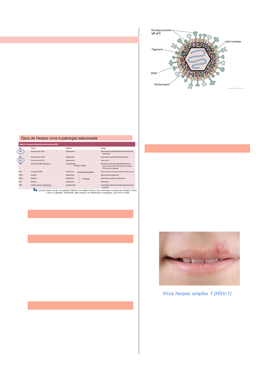 MAD11 - Prof: Karina Rafaela Petrin 30/09/2022 Herpes Vírus 1 e 3 “Ao contrário do amor, a herpes é para sempre” Sistema tegumentar: - Herpes vírus 1: labial - Herpes vírus 3: herpes zoster Perguntas: Qual o material genético do vírus Herpes? R: DNA Onde ele faz a transcrição e tradução? R: tradução no citoplasma e transcrição no núcleo, isso é ruim pois ele fica dentro do nosso núcleo e não temos a possibilidade de tirar ele de lá, uma vez que o núcleo é fechado e não tem como ficar entrando e saindo. Porque ele é considerado latente? R: Pois ele não pode sair do núcleo, chamar de latente quer dizer que ele estará sempre lá e pode ser ativado a qualquer momento. Quando eu tenho o primeiro contato com o vírus Herpes tipo 1? R: desde criança, a partir de um contato direto através de beijo na mão e o bebe leva na boca. Quadros clínicos: 1) HSV oral recorrente: Um estudante de medicina de 22 anos de idade, estudando para as provas, sente dor localizada na borda labial e 24 horas depois apresenta lesão vesicular única no local. R: O vírus estava latente, e o estudante por estar em um momento de stress teve sua imunidade abaixada, fazendo com o vírus saísse da latência. HSV oral recorrente: Uma mulher de 32 anos de idade manifesta recorrência de lesões vesiculares ulcerativas, com prurido, na região da boca após ter sido exposta à luz UV enquanto esquiava. As lesões regridem em 8-10 dias. 1 Herpes MAD11 - Prof: Karina Rafaela Petrin 30/09/2022 R: Devido à luz UV, ela teve a imunidade abaixada e o vírus saiu da latência. Queda da imunidade: Citocinas inflamatórias não estão mais presentes e dai isso avisa o vírus da herpes que ele pode ser ativado, logo ele sai do período de latência. E ela sempre volta ao mesmo lugar. Gênero simplexvirus: HHV-1 Tipo 1: gosta de fibroblasto, células epiteliais, mucosa etc. Quando TCD8 e Intérferon (inflamatória) caiem, o vírus sai da latência. Tipo 1: apenas no nervo trigêmeo, está no rosto e acaba afetando toda a face. Pode causar: paralisia Bell. Tratamento: fisioterapia e acupuntura (leva tempo) Essa paralisia: ocorre quando sai da latência, ou seja, quando estiver saindo do nervo para poder se replicar indo em direção a boca ele pode acabar desenvolvendo a paralisia, porém essa não era a intenção dele, mas como foi um stress forte, acabou desenvolvendo. É sempre na mesma região, pois fica no nervo trigêmeo. Dentro da vesícula não se tem pus, e a diferença dela para uma bolha é o tamanho, pois a vesícula é bem pequena. Herpes tipo 3: HHV-3 Se contamina com a zóster através da varicela (catapora). 2 MAD11 - Prof: Karina Rafaela Petrin 30/09/2022 Vírus da varicela-zóster (VZV) - Patogênese: - fica nas células sensoriais das costelas e mucosa. - Infecção primária: varicela (catapora); - Transmissão: contato direto, secreções respiratórias, contato com as lesões, fômites; - Exantema papo-vesiculares (degeneração progressiva das células epiteliais com formação de vesículas); - Comum em crianças, mas pode ocorrer em adultos; - Lesões : couro cabe ludo e face, espalhando-se para o tronco de maneira centrípeta; - Intenso prurido em todo o corpo - Formação de crosta, período que dura de 24 a 48h; Vacina: vírus atenuado logo você não terá a catapora, apenas a zóster. Zóster: secundária Catapora: primária Herpes zoster - Infecção secundária: - Resultante da reativação do vírus latente da varicela zoster em indivíduos após infecção prévia; - Reativação envolve os pontos de alojamento do vírus latente (gânglios sensitivos) e suas áreas de inervação; - Manifestações: erupção vesiculosa, em área bem definida, acompanhando o trajeto do nervo infectado; 3 MAD11 - Prof: Karina Rafaela Petrin 30/09/2022 - Lesão cutânea é acompanhada por intensa dor e hipersensibi l idade devido à inflamação dos nervos; - A remissão das lesões demora, normalmente 4 semanas. Se já tiver tido catapora, ainda sim é interessante tomar a vacina para diminuir a gravidade da zoster, que pode ser ainda contraída. Vírus da varicela-zóster (VZV): Afeta principalmente indivíduos idosos ou imunocompromet idos, podendo gerar c omp l i c a ções g raves c omo l e s ões hemorrágicas, pneumonias e encefalites. 15 a 20% da população pode ter um episódio de herpes-zoster durante a vida (vacinados ou não) 4