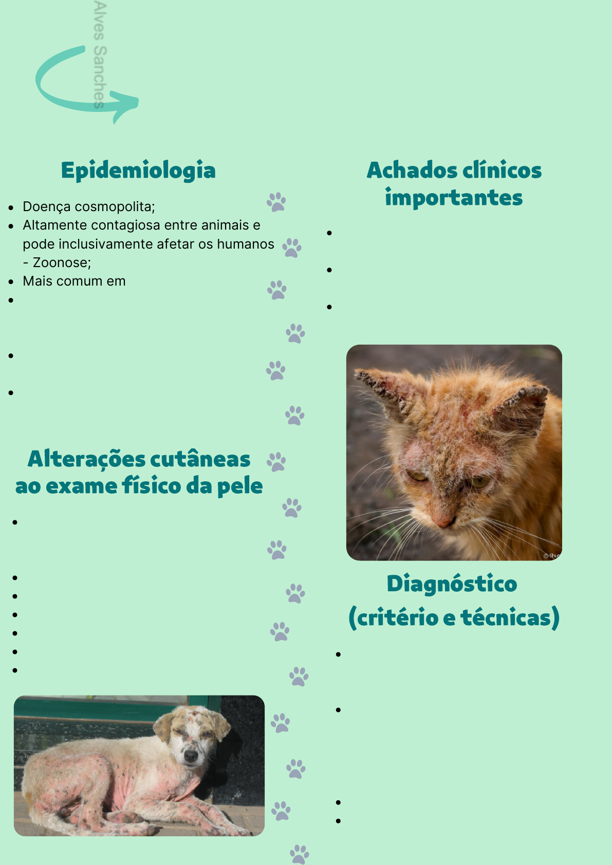 Sarna sarcóptica Epidemiologia Alterações cutâneas ao exame físico da pele Achados clínicos importantes Diagnóstico (critério e técnicas) Doença cosmopolita; Altamente contagiosa entre animais e pode inclusivamente afetar os humanos - Zoonose; Mais comum em cães; Acomete também gato, roedores e coelhos, equinos, ovinos, caprinos e bovinos; Sem predileção por raça, sexo e idade, podendo acometer à todos; Existem diversas subespécies de S. scabiei, dependendo da adaptação ao respectivo hospedeiro. Dermatose parasitária causada pelo ácaro Sarcoptes scabiei e o contágio é pelo contato direto com animais afetados. Sempre há infecção bacteriana secundária (pústulas); Perda de pelos nas regiões ventral axilar, cotovelos e calcanhares; Apresenta pequenas crostas hemorrágicas. Infecção ocorre principalmente dentro e ao redor das orelhas, cabeça, face, membros e abdômen Erupções cutâneas Crostas amareladas Escoriações Eritema Prurido intenso Alopecia Baseado no histórico clínico do paciente (lesões cutâneas em locais sugestivos, coceira noturna); Se necessário, poderá ser feita uma confirmação laboratorial pelo achado do ácaro, em material coletado pela raspagem da pele do paciente, examinado ao microscópio; Teste de arrancamento do pelo; Tricograma;
