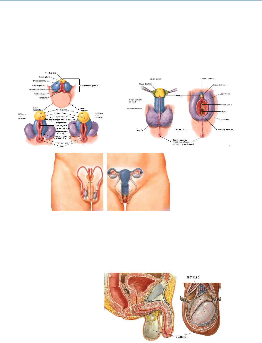 SISTEMA GENITAL INTRODUÇÃO: Conceito: É um conjunto de órgãos responsáveis pela produção de gametas e hormônios sexuais secundários, tendo como finalidade a reprodução da espécie. Divisão: - Sistema genital masculino - Sistema genital feminino SISTEMA GENITAL MASCULINO: ESCROTO (ou bolsa testicular): - Conceito: É uma dobra de pele situada na região anterior do períneo, onde estão alojados os testículos, epidídimos e início do cordão ou funículo espermático. - Estrutura: Pele Dartos (músculo liso) Septo Rafe TESTÍCULO: – Conceito: É a gônada masculina produtora de gametas (espermatozoides) e hormônio sexuais (testosterona). Encontra-se alojado no escroto e é uma glândula mista. – Morfologia externa: – Faces: lateral e medial – Margens ou bordas: anterior e posterior – Polos: superior e inferior – Envoltórios: São expansões do peritônio e dos músculos abdominais que foram trazidos na descida do testículo procedente da cavidade abdominal. – Albugínea (externamente - camada fibrosa) – Túnicas vaginais - Visceral - Parietal – Túnica espermática interna – Túnica cremastérica – Túnica espermática externa – Morfologia interna: - Albugínea: capa fibrosa que envolve o testículo externamente. - Túbulos seminíferos: tubo enovelado onde são produzidos os gametas (espermatozoides) e hormônios (testosterona). - Tubos retos: retificação dos tubos seminíferos. - Rede testicular: confluência dos tubos retos. - Ductos eferentes: ductos que saem do testículo, levando espermatozoides até o epidídimo. EPIDÍDIMO: - Conceito: É uma estrutura constituída por um ducto enovelado que abraça o testículo na sua margem posterior. É o local de armazenamento e maturação dos espermatozoides. - Partes: Cabeça (porção dilatada aonde chegam os ductos eferentes) Corpo (porção maior) Cauda (porção final que se continua com o ducto deferente) DUCTO DEFERENTE: - Conceito: É um ducto musculomembranoso que conduz os espermatozoides do epidídimo à uretra. - Trajeto: Escroto, canal inguinal, cavidade abdominal, cavidade pélvica. - Ampola do ducto deferente: Dilatação do ducto deferente próximo ao encontro com o ducto da vesícula seminal. Armazena os espermatozoides. - Ducto ejaculatório: União do ducto deferente com o ducto da vesícula seminal que ocorre no interior da próstata. FUNÍCULO ESPERMÁTICO: – Conceito: É uma estrutura em forma de cordão que vai do testículo até a cavidade abdominal, passando pela região inguinal. - Estrutura: - Ducto deferente - Componentes vasculares: arteira testicular, veias testiculares (plexo pampiniforme) e artéria do ducto deferente. - Componentes nervosos - Componentes musculares: Músculo Cremaster (obliquo interno do abdome) URETRA: - Porções: - Prostática - Membranosa - Esponjosa ou peniana - Curvaturas: - Membranosa - Peniana PÊNIS: - Conceito: É o órgão responsável pela deposição do sêmen no sistema genital feminino. - Partes: – Raiz (prende-se ao osso do quadril): ramos e bulbo. – Corpo: Corpos cavernosos: tecido lacunar. Corpo esponjoso: tecido lacunar, contendo no seu interior a uretra (a glande é a dilatação anterior do corpo esponjoso). - Albugínea: membrana fibrosa que envolve o pênis externamente. - Prepúcio: pele que recobre a glande do pênis. - Frênulo GLÂNDULAS ANEXAS: - Conceito: São glândulas produtoras do líquido seminal, que nutrirá os espermatozoides e permitir o seu deslocamento. - Funções: produção do líquido seminal - Tipos: - Vesículas seminais - Próstata - Bulbouretrais SISTEMA GENITAL FEMININO: OVÁRIOS: – Conceito: É a gônada feminina produtora de gametas (óvulo) e hormônios sexuais (estrógeno e progesterona). É uma glândula mista. São rosados e lisos quando jovens, tornam-se rugosos e acinzentados após sucessivas ovulações. – Situação: Cavidade pélvica; Lateralmente ao útero e logo abaixo da tuba uterina. – Morfologia externa - Faces: lateral e medial - Margens: mesovárica e livre - Extremidades: tubal e uterina – Morfologia interna: - Córtex: camada externa e folicular - Medula: camada interna e vascular – Ligamentos: suspensor, próprio do ovário e mesovário. TUBAS UTERINAS: - Conceito: É um órgão tubular muscular, situado entre o ovário e útero, onde ocorre a fecundação. - Porções: Intra-mural, istmo, ampola e infundíbulo (projeções: fímbrias ováricas). - Ligamentos: mesosalpinge. ÚTERO: – Conceito: É um órgão muscular cavitário, situado na cavidade pélvica (entre a bexiga e o reto), onde ocorre a gestação. – Morfologia Externa: – Porções: Fundo, corpo (onde ocorre a gestação), istmo e colo – Angulações: - Com a vagina - Entre o corpo e o colo - Parede uterina: - Endométrio: camada interna - Miométrio: camada média - muscular - Perimétrio: camada externa - Ligamentos: Largo e redondo do útero. VAGINA: - Conceito: É um órgão tubular muscular preparado para receber o pênis. - Fórnices: Fundo de saco vaginal ao redor do colo uterino. - Recessos laterais - Recesso anterior - Recesso posterior ou saco seminal – Hímen: Membrana de tecido conjuntivo situada na entrada do canal vaginal. VULVA: - Conceito: É um conjunto de estruturas que constituem a genitália externa. - Constituição: - Lábios maiores do pudendo - Lábios menores do pudendo - Vestíbulo da vagina: região que antecede a vagina: Óstio uretral externo Óstio da vagina Glândulas vestibulares - Clitóris: Órgão homólogo ao pênis. - APLICAÇÕES PRÁTICAS: 1. Epispádia 2. Hipospádia 3. Criptorquidia 4. Fimoses 5. Impotências 6. Vasectomias 7. Hímen complacente 8. Agenesia de vagina 9. Má formação uterina 10. Ligadura de tubas - EXERCÍCIOS DE FIXAÇÃO: 1. Conceitue escroto e descreva as estruturas que o compõem. 2. Faça uma analogia entre o escroto e os grandes lábios da vulva. 3. Cite os envoltórios testiculares. 4. Como se apresenta estruturalmente os testícul