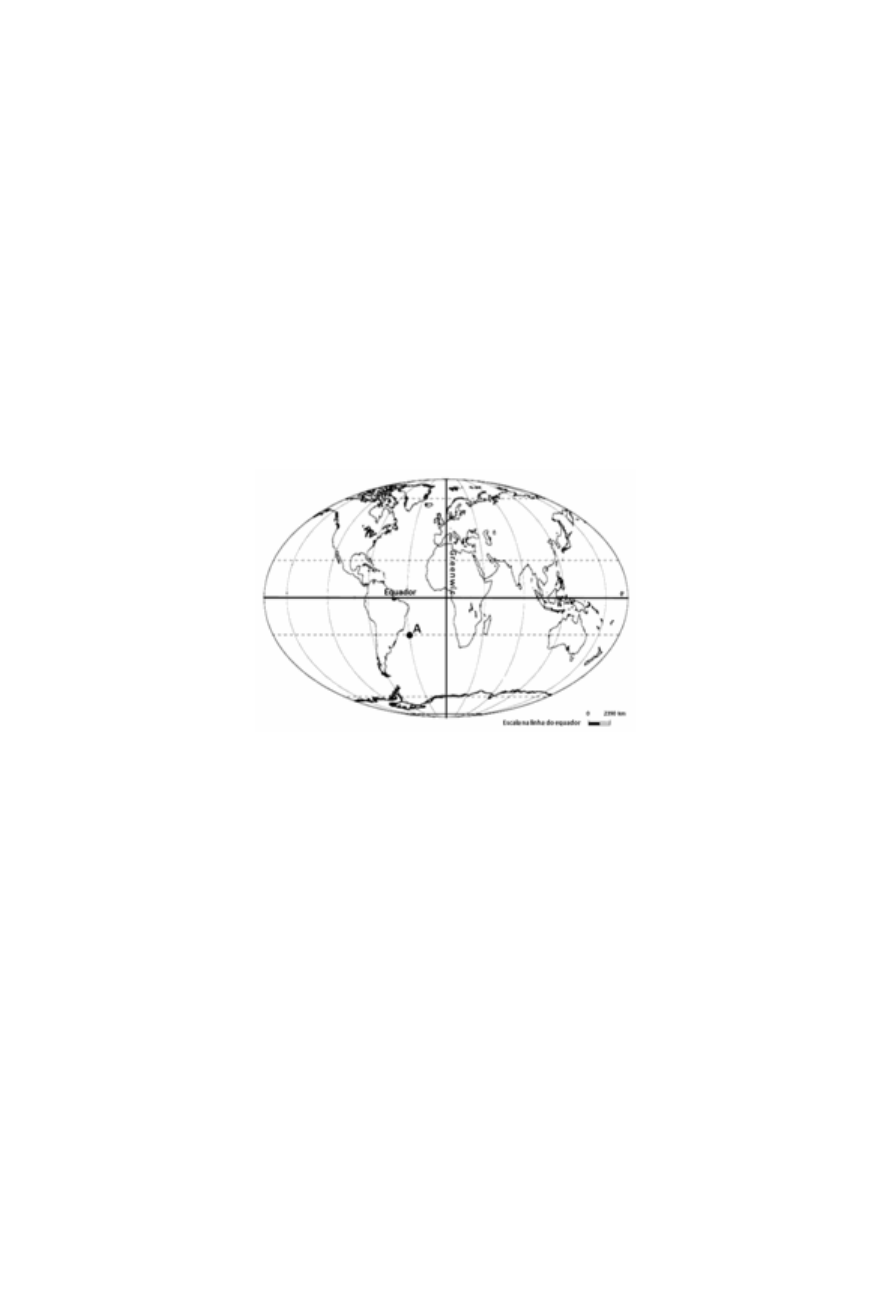 EXERCICIOS DE APLICAÇÃO: TEMA: BASE CARTOGRAFICA DA GEOGRAFIA URCA) Sobre as coordenadas geográficas, assinale o que for CORRETO. a) A linha do equador sendo o paralelo inicial de 0º, tem o seu oposto em 90°, o qual define a Linha Internacional da Data que, em alguns pontos, avança para oeste ou para leste para incluir alguns lugares na mesma data que outros. b) A linha do Equador e o meridiano de Greenwich definem, respectivamente, a divisão da terra em hemisférios meridional e setentrional e em hemisférios norte e sul. c) Os paralelos localizados a 66° 33’N e S definem, respectivamente, os trópicos de capricórnio e de câncer. d) Os meridianos definem os fusos horários do mundo, sendo que o meridiano de 45°W é o meridiano central do fuso horário que define a hora oficial de Brasília, que é a mesma do Ceará. e) Os paralelos localizados a 23° 27’N e S definem, respectivamente, os círculos polares Ártico e Antártico. (UFAL) Em geografia, chama-se hemisfério a uma metade da superfície da Terra limitada por um círculo máximo. A divisão da Terra pelo Equador forma dois hemisférios, assim como sua divisão pelo meridiano de Greenwich. O ponto A no mapa encontra-se no hemisfério a) norte oriental. b) boreal austral. c) meridional oriental. d) austral leste. e) sul ocidental. (UFAL) Em nossos dias, conhecer a hora em diferentes locais não é mais um problema, mas um século atrás era um problema muito complicado. Cada localidade utilizava o seu próprio tempo solar que variava de um minuto em 18 km de leste para oeste, a hora mais tardia estava situada a leste. Na época na qual 18 km constituía um longo trajeto, essas diferenças de horas geravam poucos problemas, pois essas pessoas não ultrapassavam essas distâncias rapidamente. Foi com o advento das estradas de ferro e a multiplicidade de horas municipais, que esse problema se tornou mais sério para os viajantes que com frequência eram obrigados a fazer correspondência entre um trem e outro, sendo obrigado a esperar o próximo trem durante, às vezes, horas. Isso gerou também o problema de segurança: dois trens que utilizassem referências temporais diferentes corriam o risco de circular na mesma via ferroviária em direções opostas. Disponível em: http://www.portaldoastronomo.org. Acesso em: 08/12/2013 Assim podemos afirmar que a hora local a) se refere a hora relativa ao movimento diurno aparente do sol daquela localidade. b) é determinada pelo governo de cada país, na tentativa de unificar o horário em seu território. c) é a distância de qualquer ponto da terra em relação ao meridiano de Greenwich. d) se refere a hora do meridiano principal de um fuso e se estende a 7°30’ a leste e a oeste. e) se diferencia da hora legal por ter uma lei que a determina e é aceita em toda uma área. (UFAL) Num modelo esférico, a latitude é medida em graus do arco da circunferência de um meridiano, medido a partir do Equador, tendo o centro do planeta como vértice. Já longitude é a medida em graus do arco da circunferência de um paralelo, medido a partir o meridiano de Greenwich, tendo o centro do planeta como seu vértice. Disponível em: http://www.atlasdemurcia.com. Acesso em: 27/11/2013 Sabendo que a determinação das coordenadas geográficas se baseia no princípio da medida da circunferência, podemos concluir que a) a longitude pode ir de 0°no Equador a 180°nos polos norte e sul. b) a latitude pode ir de 0° em Greenwich a 90° a leste e a oeste. c) a longitude pode ir de 0° no Equador a 180° a leste e a oeste. d) a latitude pode ir de 0° no Equador a 90° nos pólos norte e sul. e) a latitude pode ir de 0°em Greenwich a 180°nos polos norte e sul. (UEA) A capital amazonense já conta com um sistema que está auxiliando outras grandes capitais como Curitiba, Cuiabá, São Paulo, Campo Grande e Rio de Janeiro. O sistema foi elaborado a partir do aerolevantamento que gerou uma coleção de fotos digitais, denominadas ortofotos, criando uma base digital da cidade. Foram fotografados 430 km2, tamanho exato da área urbana de Manaus. Tal resultado possibilitará, entre outros avanços, a desburocratização na abertura de empresas e na implantação da E-CIT (Certidão de Informações Técnicas), a reorganização de numeração predial e correção de endereçamento, bem como, a melhor distribuição da iluminação pública, ordenamento da ocupação e a cobrança mais justa do Imposto Predial Territorial Urbano (IPTU). Instalado em 2011 na área urbana de Manaus, esse sistema, que opera com base na relação entre mapas digitais, posicionamento global e banco de dados informatizado, transformou-se em importante instrumento para o planejamento da cidade. O sistema tratado pelo texto é o a) Sistema de Informação Gerencial. b) Sistema de Planejamento Urbano. c) Sistema de Informação Geográfica. d) Sistema de Análise Financeira. e) Sistema de Recenseamento Local. (UCB) Sobre as informações contidas no mapa do horário de verão 2013/2014 e também com relação à dinâmica do espaço territorial brasileiro, julgue os itens a seguir. 0. ( ) A unidade federativa do Tocantins é a única da Região Centro-Oeste do Brasil que não adota o horário de verão. 1. ( ) Além do horário de verão, a dimensão territorial leste-oeste do Brasil determina a existência de três fusos horários diferentes. 2. ( ) Durante o horário de verão, quando os relógios de Brasília marcarem 13 horas, no estado de Rondônia os relógios marcam a mesma hora. 3. ( ) O objetivo exclusivo da adoção do horário de verão é a economia de energia nos horários de pico. 4. ( ) Um avião sai do aeroporto de Salvador às 23h30 do dia 20/10/2013 com destino ao aeroporto de Manaus (AM). Considerando que o voo teve duração de três horas e quarenta minutos, a chegada na capital amazonense será às 2h10 do dia 21/10/2013. A temperatura atmosférica varia de um lugar para outro, mas também pode aprese