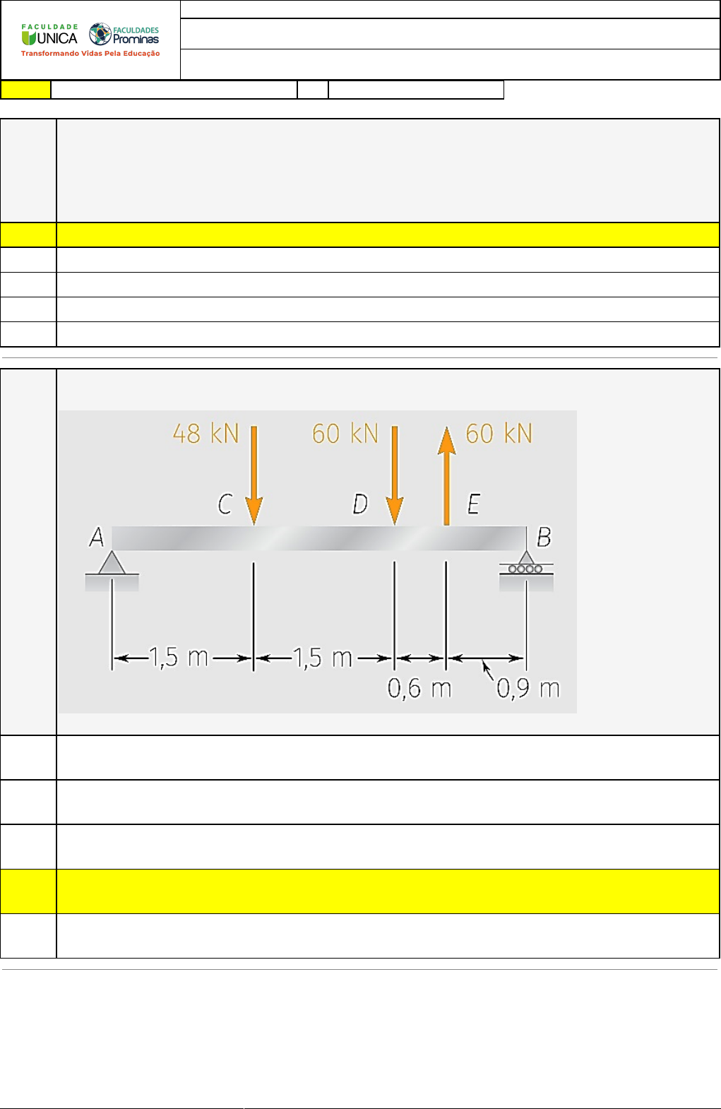 09/05/2023 00:41:25 1/3 REVISÃO DE SIMULADO Nome: CARLOS HENRIQUE AVELINO DA SILVA Disciplina: Mecânica dos Sólidos I Respostas corretas são marcadas em amarelo X Respostas marcardas por você. Questão 001 Analise as afirmações sobre o esforço de compressão atuante em pilares. I - Quando um pilar é comprimido, ele cede lateralmente, gerando tensões de tração. II - Não é totalmente verdade que um pilar só recebe esforços de compressão. III - Embora o concreto resista bem a compressão, o aço é muito melhor. (É)são correta(s) apenas a(s) afirmação(ões): X A) I, II e III. B) II. C) III. D) I. E) II e III. Questão 002 Determine o valor máximo absoluto (a) da força cortante e (b) do momento fletor da viga a seguir: Autor (2020) A) (A) cortante máximo = 48 kN; (B) momento máximo = 20 kN.m B) (A) cortante máximo = 38 kN; (B) momento máximo = 70 kN.m X C) (A) cortante máximo = 8 kN; (B) momento máximo = 60 kN.m D) (A) cortante máximo = 68 kN; (B) momento máximo = 60 kN.m E) (A) cortante máximo = 28 kN; (B) momento máximo = 20 kN.m 09/05/2023 00:41:25 2/3 Questão 003 (Adaptada de BEER, 1995). Uma laje de concreto é reforçada por hastes de aço de 16 mm de diâmetro colocadas a 180 mm de centro a centro como mostrado na figura abaixo. O módulo de elasticidade é de 20 GPa para o concreto e 200 GPa para o aço. Usando uma tensão admissível de 9 MPa para o concreto e de 120 MPa para o aço, determine o maior momento fletor por metro de largura que pode ser aplicado à laje. A) M=23,46 kNm B) M=5,86 kNm C) M=43,09 kNm D) M=11,73 kNm X E) M=24,92 kNm Questão 004 (Adaptada de BEER, 1995). Uma viga de madeira simplesmente apoiada, seção transversal retangular e comprimento vão de 1,2 m está submetida a uma carga concentrada em seu ponto médio, além de seu próprio peso conforme a figura abaixo. A seção transversal tem largura de 140 mm e altura de 240 mm. O peso específico da madeira é 5,4 kN/m3. Qual o máximo valor permissível da carga P se a tensão fletora a permitida é de 8,5 MPa? A) P=28,0 kN B) P=45,0 kN C) P=34,0 kN X D) P=22,0 kN E) P=38,0 kN 09/05/2023 00:41:25 3/3 Questão 005 Determine o valor máximo absoluto (a) da força cortante e (b) do momento fletor da viga a seguir: Autor (2021) X A) A) cortante máximo = 2 kN; (B) momento máximo = 6 kN.m B) A) cortante máximo = 4 kN; (B) momento máximo = 6 kN.m C) (A) cortante máximo = 7,42 kN; (B) momento máximo = 7,26 kN.m D) A) cortante máximo = 7,42 kN; (B) momento máximo = 26 kN.m E) A) cortante máximo = 42 kN; (B) momento máximo = 7,26 kN.m