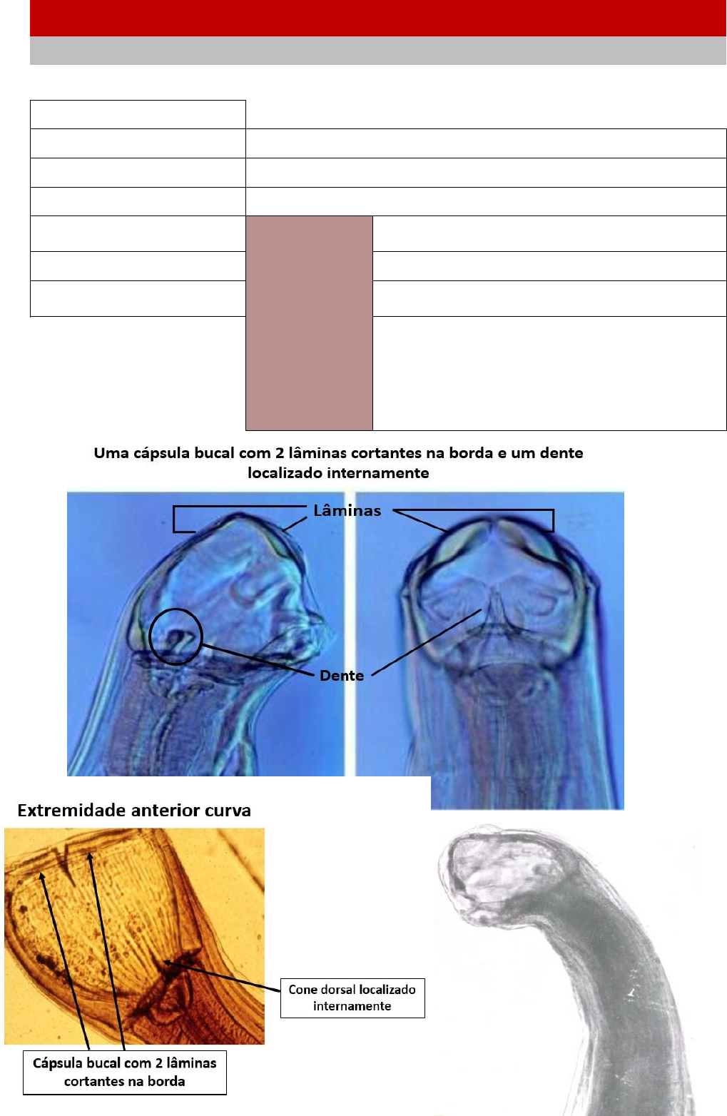 Espécie – Bunostomum – Nematóides Superfamília Strongyloidea Família Ancylostomidae Filo: Nematoda Classe: Secernentea Hospedeiros: Ruminantes Ordem: Strongylida Órgão de eleição: Intestino delgado Superfamília: Strongyloidea Sexo: Macho e Fêmea Família: Ancylostomidae Aspectos morfólogicos (3) Nematóides com extremidade anterior dobrada dorsalmente; Gênero: Bunostomum sp. Cápsula bucal desenvolvida; Espécie: Bunostomum Guarnrcida por lâminas quitinosas em na porção anterior e dente no fundo da cápsula bucal; ♂ Com bolsa copuladora com feixe dorsal bassimétrico; Espículos iguais, sem gubernáculos; ♀ Com vulva na metade anterior do corpo; Sem lábio vulvar; Cauda cônica média, sem apêndica caudal;