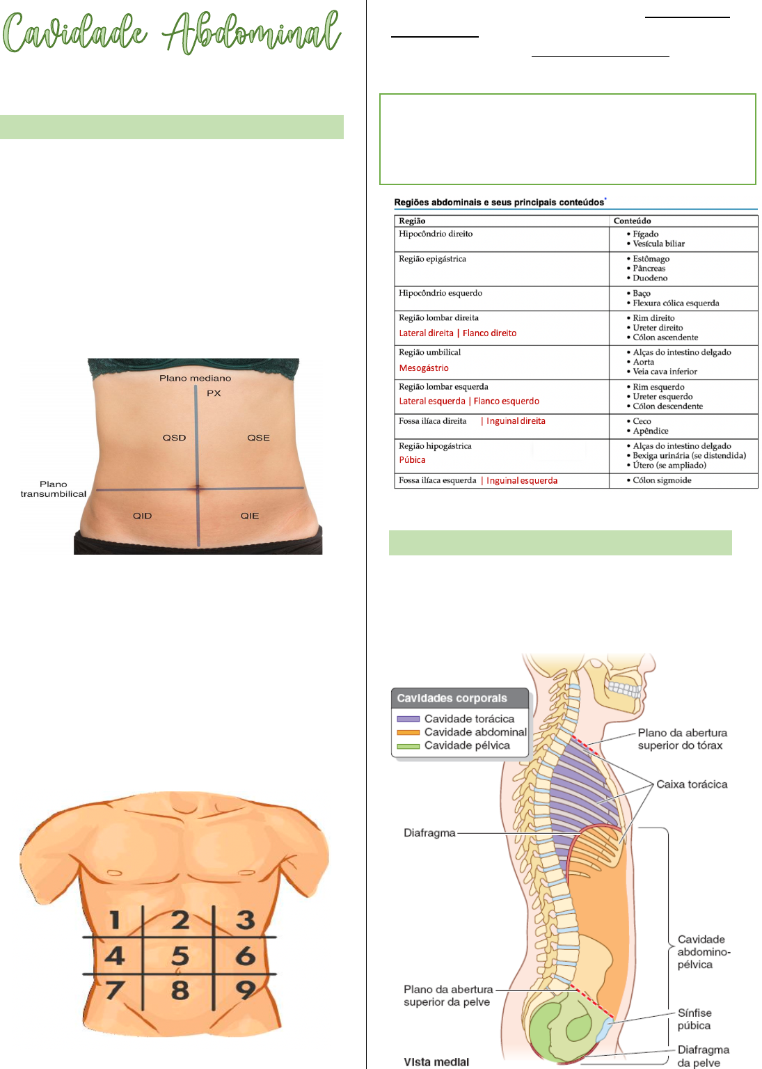 ANATOMIA INTRODUÇÃO Dividido em quadrantes que são delimitados: plano transumbilical (atravessa o umbigo e o IV disco intervertebral (entre LIII e LIV) e o plano mediano (atravessa o corpo longitudinalmente). • QSD: quadrante superior direito • QSE: quadrante superior esquerdo • QIS: quadrante inferior direito • QIE: quadrante inferior esquerdo O abdômen é dividido em regiões: 1. Hipocôndrio direito 2. Epigástrio 3. Hipocôndrio esquerdo 4. Flanco/lombar/lateral direito 5. Mesogástrico 6. Flanco/lombar/lateral esquerdo 7. Fossa ilíaca direita 8. Hipogástrico 9. Fossa ilíaca esquerda As regiões são delimitadas por dois planos transversais (plano subcostal e plano intertubercular) e dois planos sagitais (planos medioclaviculares). OBS.: As vísceras mudam de lugar quando estão em posição anatômica, em relação quando está deitado. O corpo estabiliza os órgãos, mas não prende. LIMITES O músculo diafragma separa as cavidades torácica e abdominal. Com isso, a cavidade abdominal tem os seus limites. PAREDE ANTEROLATERAL Parede anterolateral: limite superior (cartilagens da VII a X costela + processo xifoide do esterno) e inferior (ligamento inguinal + crista ilíaca, crista púbicas e sínfise púbica). A parede anterolateral do abdome é formada por pele (Derme - tecido conjuntivo e epiderme - tecido epitelial pavimentoso simples queratinizado) e tela subcutânea (tecido adiposo - substitui a hipoderme), composta principalmente por gordura, músculos, suas aponeuroses e fáscia muscular, gordura extra peritoneal e peritônio parietal. Músculos abominais: • Músculo oblíquo externo do abdome • Músculo oblíquo interno do abdome • Músculo transverso do abdome • Músculo reto do abdome Os músculos oblíquos fazem flexão da coluna. PAREDE POSTERIOR Músculo quadrado do lombo, músculo psoas maior e músculo ilíaco. PERITÔNIO O peritônio reveste “todos” órgãos abdominais, o peritônio visceral recobre a visceral, porém tem órgão que está posicionados posterior ao peritônio. Os órgãos que estão totalmente revestidos são intraperitoneais, os que estão posteriores do peritônio visceral é retroperitoneal, e os órgãos que estão abaixo do peritônio é subperitoneal. Peritônio parietal (colado com a parede abdominal) – peritônio visceral (que envolve o órgão). Mesentério - Uma lâmina dupla de peritônio - prega do peritônio (uma expansão), tem função de fixar o órgão na parede posterior do abdômen. Mesocólon é um tipo de mesentério. Omentos: é uma prega de peritônio que está unindo o estômago a outras estruturas. Com isso, tem o omento menor (unindo o estômago ao fígado – ligamento gastrofrênico e hepatoduodenal – parte proximal do duodeno, curvatura menor do estômago e no fígado) e omento maior (unindo o estômago a partir da curvatura maior descendo até a parte inferior do abdômen e volta fixando no processo transverso do intestino grosso). Quando temos um órgão inflamado, o peritônio do omento maior envolve esse órgão, assim, movimentando-se, dessa forma, protegendo-o. OBS.: peritônio é uma túnica serosa Espaço supracólico e subcólico, que delimi- tará esses espaços é o mesocolon transverso. Entre esses espaços tem a bolsa omental - bolsa azul no esquema - (posteriormente ao fígado e estômago, logo, posterior do omento menor). Nessa bolsa omental possui um forame omental, tendo a função de dar passagem para tríade portal.