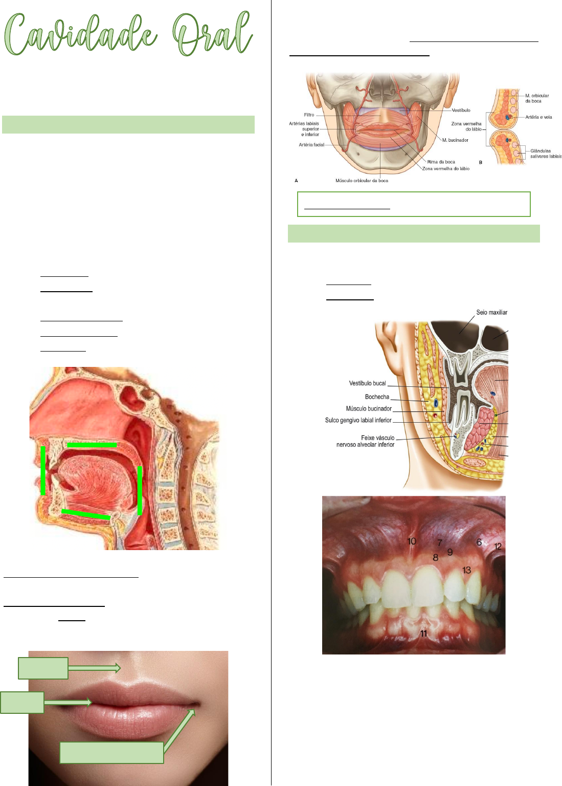 ANATOMIA INTRODUÇÃO Vestíbulo da boca: Espaço estre as bochechas e arcada dentária (local onde consegue passar a língua). Cavidade própria da boca: onde a língua fica repousada. Limites: • Anterior: lábios • Posterior: Istmos das fauces (abertura posterior para parte faringe oral). • Superiormente: Palato duro e mole • Inferiormente: músculo e língua • Laterais: bochechas Lábio superior e inferior, a abertura entre os lábios denomina-se como rima da boca. O cantinho da boca chama-se de comissura labial. O sulco em cima do lábio superior é filtro. A irrigação dos lábios é feita pelas artérias labiais: superior (lábio superior) e inferior (lábio inferior), elas se originam da a. facial, que vem da a. carótida externa. Musculo do lábio é o m. orbicular da boca. VESÍBULO DA BOCA Limites: • Externo: lábios e bochechas • Internos: Dentes e processos alveolares 6 – Fórnice do vestíbulo. 7 – Mucosa alveolar. 8 – Gengiva. 9 – Junção mucogengival. 10 – Frênulo do lábio superior. 11 – Frênulo do lábio inferior. 12 – Frênulo lateral. 13 – Papila interdental. Filtro Rima Comissura labial Frênulo: serve para unir o lábio com a mucosa da gengiva, assim, limitando o movimento. CAVIDADE PRÓPRIA DA BOCA Funções: ingerir alimentos, degustação, salivação, umedecer os sólidos, início da digestão, fala, respiração e expressão facial. OBS.: Saliva – digestão química, principalmente dos carboidratos. Digestão mecânica: músculos mastigatórios, dentes e língua. Limites: • Superior: palato • Inferior: assoalho da boca e língua • Anterior: face lingual dos dentes e processos alveolares. • Posterior: istmo das fauces e parte do palato mole • Lateral: face lingual dos dentes, processos alveolares e bochechas. LIMITE LATERAL Arcos dentais da maxila e da mandíbula Músculo bucinador: Ele ajuda o alimento a fica em contato com a arcada dentária, para que ele seja triturado. Possui o direito e esquerdo. • Posterior está fixado na rafe pterigoman- dibular (linha). • Anterior está fixado no modíolo (nódulo) LIMITE POSTERIOR Ístmos das fauces: palato mole, arco palatoglosso, arco palatofaríngeo, raiz da língua 21 – úvula. 19 – Arco palatoglosso. 20 – Arco palatofaríngeo. OBS.: A raiz da língua tem fixação no osso ossioide e mandíbula. A língua é dividida em dorso, raiz e raiz da língua. A tonsila palatina (amídalas), está localizada na fossa tonsilar, que fica entre os arcos palatoglosso e palatofaríngeo. LIMITE SUPERIOR (Teto) Palato duro: processo palatino da maxila (forma 2/3 anteriores) e lâmina horizontal do osso palatino (forma 1/3 posterior). Entre o processo palatino da maxila direita e esquerda tem a sutura intermaxilar. Fossa incisiva fica posterior aos dentes incisivos centrais superior, nessa fossa passa o nervo nasopalatino, a mucosa papila incisiva cobre essa fossa. Pregas palatinas transversas: ajuda no contato da língua com o palato durante a mastigação. Rafe palatina: cobre a sutura intermaxilar. Forame palatino maior e menor: passagem de artérias e nervos (nervo palatino maior e menor). Sutura interpalatino: sutura entre os ossos palatinos. Espinha nasal posterior: acidente ósseo do osso palatino, fixação do musculo da úvula. Nervo nasopalatino inerva o 1/3 anterior do palato duro e o nervo palatino maior inerva 2/3 posterior do palato duro. Nervo palatino menor inerva o palato mole. Artéria palatina maior irriga o palato duro e a. palatina menor irriga o palato mole. A drenagem ocorro pelo plexo pterigóideo, que vai drenar para veia jugular interna. E a drenagem linfática para os linfonodos cervicais profundos. Palato mole (músculo estriado esquelético): • Músculo da úvula • M. levantador do véu palatino – eleva a úvula. • M. tensor do véu palatino – mantém a úvula na sua posição neutra. • M. palatofaríngeo – deprimem o palato mole ou úvula. • M. palatoglosso – deprimem a úvula. Esses músculos são inervados pelo nervo vago, menos o m. tensor do véu palatino que o nervo mandibular, que é ramo do nervo trigêmeo (oftalmo V1, maxilar V2 e mandibular V3). Úvula levantada fecha a faringe nasal e úvula deprimida fecha o istmo das fauces. LIMITE INFERIOR (Assoalho) Músculos: M. milo-hioideos e M. gênio-hiódeos. • Depressão da mandíbula e elevação do hioideo. Trígono orofaringe: abertura triangular entre os m. milo-hióide, m. constritor superior e m. constritor médio. • Passa artéria e veia facial - nervo lingual, hipoglosso e glossofaríngeo – vasos linfáticos – glândula submandibular. Osso hioideo M. gênio-hiódeos M. milo-hioideos Linha milo-hioideos Carúncular sublingual é um óstio para o ducto submandibular, por onde sai a saliva, a qual é produzida na glândula submandibular. LÍNGUA A raiz da língua é póstero-inferior, fixada no osso hioide e mandíbula. O dorso é a superfície do corpo da língua, os quais são antero-superior. Sulco terminal: uma invaginação do epitélio no desenvolvimento embrionário, para formação da glândula tireoide, em formato de V, que separa a raiz do corpo. OBS.: o forame cego é uma sem saída, mas em algumas pessoas no desenvolvimento embrionário não acontece direito e permanece o ducto tireoglosso, aumentado a chances ter cisto nessa região. Papilas circunvalas: estão localizadas a frente do sulco terminal, possui entre 8 e 12. Papilas filiformes: em toda região do dorso da língua e são as únicas a não ter botões gustatórios (canalículos). Papilas fungiformes: localizadas na região lateral Papilas folhadas: região póstero-lateral. Língua: músculo estriado esquelético – controle voluntário. A língua é cheia fibras, logo, músculos intrínsecos (formam língua): • Mm. longitudinais superiores • Mm. Verticais e transversos • Mm. longitudinais inferiores Músculos extrínsecos (movimenta a língua): • M. genioglosso – põem a língua 