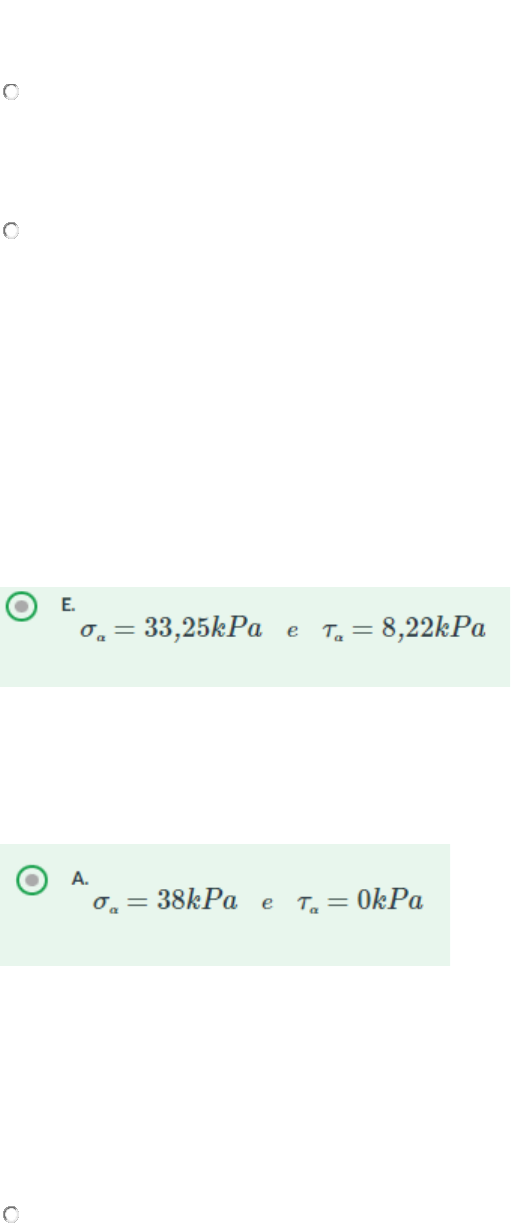 Gabarito Obras de Terra – Eniac Unidade 1 1. Com relação ao círculo de Mohr e tensões cisalhantes nos solos, qual das seguintes afirmações é correta? B. As tensões de cisalhamento independem da pressão neutra. 2. Qual dos seguintes modelos constitutivos é utilizado implicitamente nos métodos de cálculo de estabilidade por equilíbrio limite em taludes? Por quê? B. O modelo B, pois ele não se preocupa com o nível de deformação dos materiais, como ocorre nos métodos de equilíbrio limite. 3. Considere a imagem. Qual das curvas representa o comportamento genérico esperado de um solo? Por quê? B. O modelo C, pois considera deformações contínuas e graduais elásticas e plásticas. 4. Imagine um elemento de solo com peso específico de 19kN/m3, a 2m de profundidade. Quais são as tensões atuantes neste elemento em um plano inclinado de 30°? Considere que a tensão horizontal equivale à metade da tensão vertical. 5. Considere agora que no problema do exercício anterior a tensão horizontal é igual à tensão vertical. Quais são as tensões atuantes no elemento em um plano inclinado de 30°? Unidade 2 1. Considere a seguinte frase: “a água pode ser extremamente importante para a estabilidade de alguns taludes e encostas”. A afirmativa está correta? Por quê? C. Sim, pois além de aumentar o empuxo hidrostático e diminuir a resistência do material por meio da elevação das poro-pressões, a água é um dos agentes principais do intemperismo que acabam degradando os materiais a longo-prazo e contribuindo para a perda de estabilidade. 2. Considere a equação de resistência de Mohr-Coulomb, em que há uma parcela coesiva e uma parcela de atrito. A parcela coesiva corresponde à coesão real? Por quê? C. Não, sendo na equação apenas um intercepto coesivo de melhor ajuste matemático, já que a coesão real ocorre em virtude de diversos fatores. 3. Considere um plano horizontal de solo submetido a 50kPa de tensão normal. Se o material possui coesão de 25kPa e ângulo de atrito de 30°, qual a resistência ao cisalhamento do material nesta condição? E. 53,8kPa. 4. Um solo arenoso submetido a 100kpa de tensão vertical apresentou resistência de 65kPa. Qual o ângulo de atrito do material considerando apenas a equação de Mohr- Coulomb? D. 33°. 5. Sobre o critério de ruptura de Mohr-Coulomb, assinale a alternativa verdadeira. C. O critério é adequado para os solos pois consegue expressar as tensões normais e de cisalhamento, que de fato condicionam a ruptura de um solo. Unidade 3 1. O rastejo é um tipo de movimento de massa muito comum. Quais são as suas características principais de acordo com a classificação de Augusto Filho (199? C. Possui sazonalidade, velocidades muito baixas e vários planos de deslocamentos. 2. De acordo com a figura, como você classificaria esse movimento de massa? D. Corrida de detritos ou debris flow. 3. Nos escorregamentos rotacionais em aterros homogêneos, quanto maior for a coesão do material, maior deve ser a profundidade da ruptura. Esta afirmação é verdadeira ou falsa? Por quê? A. Verdadeira, pois a coesão representa um acréscimo de resistência na estabilidade do talude, fazendo com que deva haver mais material (mais peso) para gerar uma superfície instável, o que ocorre pelo aumento da sua profundidade. 4. Calcule a estabilidade de um talude infinito de solo com as seguintes características: superfície de ruptura com declividade de 25°, camada de solo com 2m, peso específico natural igual a 18kN/m³, ângulo de atrito 33° e coesão igual a zero. Não há presença de água. A. FS = 1,40. 5. Considere o mesmo talude da questão anterior. O que ocorreria com sua estabilidade caso houvesse um nível d’água a 0,5m de profundidade a partir da sua superfície? E. O talude romperia, pois seu novo FS é igual a 0,81. Unidade 4 1. Qual destas estruturas não pode ser considerada como muro de arrimo? B. Solo reforçado com raízes. 2. Quais as verificações necessárias que se deve fazer para garantir a estabilidade externa de um muro de contenção em pedra argamassada? A. Deslizamento, tombamento, pressões nas fundações e ruptura global. 3. Qual o fator de segurança ao deslizamento de um muro cujo peso por metro é de 650 KN. O empuxo passivo já com as devidas ponderações é de 20 kN e o empuxo ativo é de 250 kN. Considere que a resistência ao cisalhamento no contato é de 375 kPa. D. Fsd = 1,58. 4. Para as mesmas considerações do exercício 3. Qual deve ser o fator de segurança ao tombamento, sabendo que os empuxos passivo e ativo têm origem em camadas de solo com espessuras de 2m e 5m, respectivamente. A base do muro é de 2,2m com excentricidade da reação normal ao peso de 42cm. B. Fs≥2,0. 5. Para a mesma figura do exercício 3, determine a máxima pressão que o muro exerce numa condição puramente elástica do solo. C. 634 kPa. Unidade 5 1. Com relação ao comportamento de solos arenosos, assinale a alternativa correta. C. Os materiais compactos apresentam grande expansão durante o cisalhamento, por isso a queda acentuada na sua resistência. 2. Sabe-se que a saturação é capaz de promover um comportamento diferenciado entre as areias fofas e compactas quando carregadas. À luz disso, por que uma areia fofa pode se liquefazer? E. Porque pode ocorrer excesso de poro-pressão, já que a areia precisa se comprimir durante o cisalhamento, reduzindo à sua tensão efetiva a zero. 3. Se fizermos uma analogia entre o comportamento das areias e das argilas, uma areia compacta seria o equivalente a qual tipo de argila? C. De uma argila pré-adensada. 4. Em algumas encostas naturais, rupturas podem ocorrer de forma drenada, ainda que os seus materiais constituintes sejam solos residuais argilosos ou silto-argilosos. Ainda assim, por que ensaios triaxiais não-drenados (CIU) são executados nestas condições? A. Em virtude da baixa permeabilidade desses materiais, pois um ensaiad