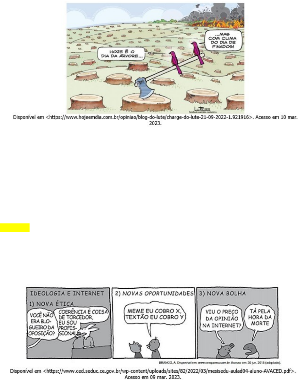 PSA Pergunta 1 Leia a charge. Com base na leitura, avalie as afirmativas. I- O objetivo da charge é criticar a criação de datas especiais para temas específicos. II- A charge critica o desmatamento, causado pela ação humana, que afeta os habitats naturais. III- A charge associa a destruição do meio ambiente à morte. É correto o que se afirma apenas em a. I e III. b. II. c. III. d. II e III. e. I e II. Pergunta 2 Leia a tirinha. O objetivo da tirinha é: a. criticar a mercantilização da produção de opinião nas redes sociais. b. evidenciar positivamente as novas oportunidades surgidas com a internet. c. enaltecer a diversidade de opiniões nas redes sociais. d. criticar a intolerância contra aqueles que expõem suas opiniões. e. mostrar a importância da profissionalização para atuar nas redes sociais. Pergunta 3 Leia a charge O objetivo da charge é a. mostrar que a inteligência artificial no Brasil não está desenvolvida, pois baseia- se em formas arcaicas de conhecimento. b. evidenciar a importância da concentração e do esforço pessoal na busca de informações. c. valorizar o livro e as atividades pedagógicas não digitais como ferramentas importantes para a construção do conhecimento. d. valorizar os novos dispositivos tecnológicos, que são acessíveis a todos e produzem inteligência. e. mostrar que a mente humana continua superior à da máquina Pergunta 4 Leia o texto. Não vacinados representam 75% das mortes por covid-19, diz estudo brasileiro Vacinação protegeu todas as faixas etárias de hospitalizações e mortes, inclusive indivíduos com mais de 80 anos Publicado em 04/03/2022 Uma pesquisa conduzida em Londrina, no Paraná, mostrou que 75% das mortes por covid-19 registradas nos primeiros dez meses de 2021 ocorreram em indivíduos que não foram imunizados contra a doença. Entre os idosos, o índice de morte foi quase três vezes maior entre os não vacinados do que entre os imunizados. Entre pessoas com menos de 60 anos, o número de mortes de não vacinados foi 83 vezes maior do que nos imunizados. O estudo foi conduzido pela Universidade Estadual de Londrina, pela Secretaria Municipal de Saúde de Londrina, pela Universidade Federal de São Carlos e pela Faculdade de Medicina Albert Einstein dos EUA. Foram incluídos no estudo dados de 59.853 casos confirmados de covid-19 e 1.687 mortes pela doença, reportados entre janeiro e outubro de 2021. Dos óbitos registrados, 1.269 foram de indivíduos não vacinados. Já entre os casos confirmados, 48.217 foram de pessoas que não tomaram a vacina, 7.207 de indivíduos parcialmente imunizados e 4.429 de pessoas com esquema vacinal completo. Dos vacinados que foram infectados, 54% tinham mais de 60 anos. Os cientistas analisaram as taxas de letalidade (proporção entre o número de mortes e o número de casos) em três modelos: de acordo com a idade dos participantes, com o status de vacinação e segundo a relação de ambas as características (idade e vacinação). No primeiro modelo, quanto mais velhos os indivíduos, maior a letalidade observada. A segunda análise mostrou que os vacinados apresentam uma taxa de letalidade 40,4% menor do que os não vacinados. Já o terceiro modelo confirmou que a vacinação reduziu as mortes em todas as faixas etárias. "Nossos achados reforçam que a vacinação é uma medida de saúde pública essencial para reduzir os índices de fatalidade por covid-19 em todas as faixas etárias", afirmam os autores do artigo. Os resultados da pesquisa corroboram os de outros trabalhos já publicados, como um estudo observacional com dados de 90 países que mostrou que, a cada aumento de 10% na cobertura vacinal, a mortalidade reduz 7,6%. Disponível em <https://butantan.gov.br/noticias/nao-vacinados-representam-75-das- mortes-por-covid-19-diz-estudo-brasileiro>. Acesso em 13 fev. 2023 (com adaptações). Com base na leitura, avalie as afirmativas. I. A pesquisa indicou que a vacinação reduziu a morte e a contaminação por covid-19. II. Segundo os dados, 54% dos vacinados com mais de 60 anos foram infectados, mas, entre os imunizados, a taxa de letalidade foi 40,4% menor do que a observada entre os não vacinados. III. A pesquisa mostrou que 75% dos não vacinados morreram devido à covid-19. É correto o que se afirma em a. I, apenas. b. I e II, apenas. c. II, apenas. d. I e III, apenas. e. I, II e III. Pergunta 5 Leia o texto. Especialista alerta sobre elo entre fatores que atrapalham o sono noturno, como a apneia, e o maior risco cardiovascular Engana-se quem pensa que o sono consiste apenas em um estado passivo na vida de um ser humano. Ele influencia e é influenciado por uma série de fatores fisiológicos e comportamentais. Nem o cérebro nem o coração param durante o sono, mas o repouso noturno é essencial para preservar esses órgãos vitais. Distúrbios do sono, sobretudo a apneia obstrutiva, comprometem o organismo e elevam com o tempo o risco de problemas no coração e nas artérias. A apneia está ligada a características anatômicas e ao estilo de vida, sendo mais frequente em alguns biotipos e com o ganho de peso. Quem sofre desse problema, mais famoso pelos roncos, fica com um sono extremamente fragmentado e desperta muitas vezes com uma sensação de sufocamento. Também existem reflexos na capacidade de queima da gordura corporal e na ação da insulina pelo corpo. A sobrecarga do coração não se restringe somente ao fato de o músculo cardíaco ter de trabalhar com maior intensidade. Estudos demonstram que ele também é alvo de substâncias inflamatórias liberadas em razão do estresse na parede do coração e dos vasos sanguíneos. Não é à toa que existem evidências ligando a apneia do sono ao aumento nas taxas de infarto, arritmia e derrame cerebral. Isso faz com que os distúrbios do sono sejam considerados fatores críticos na equação do risco cardiovascular. No entanto, não é tão simples diagnosticar esse tipo de problema. 