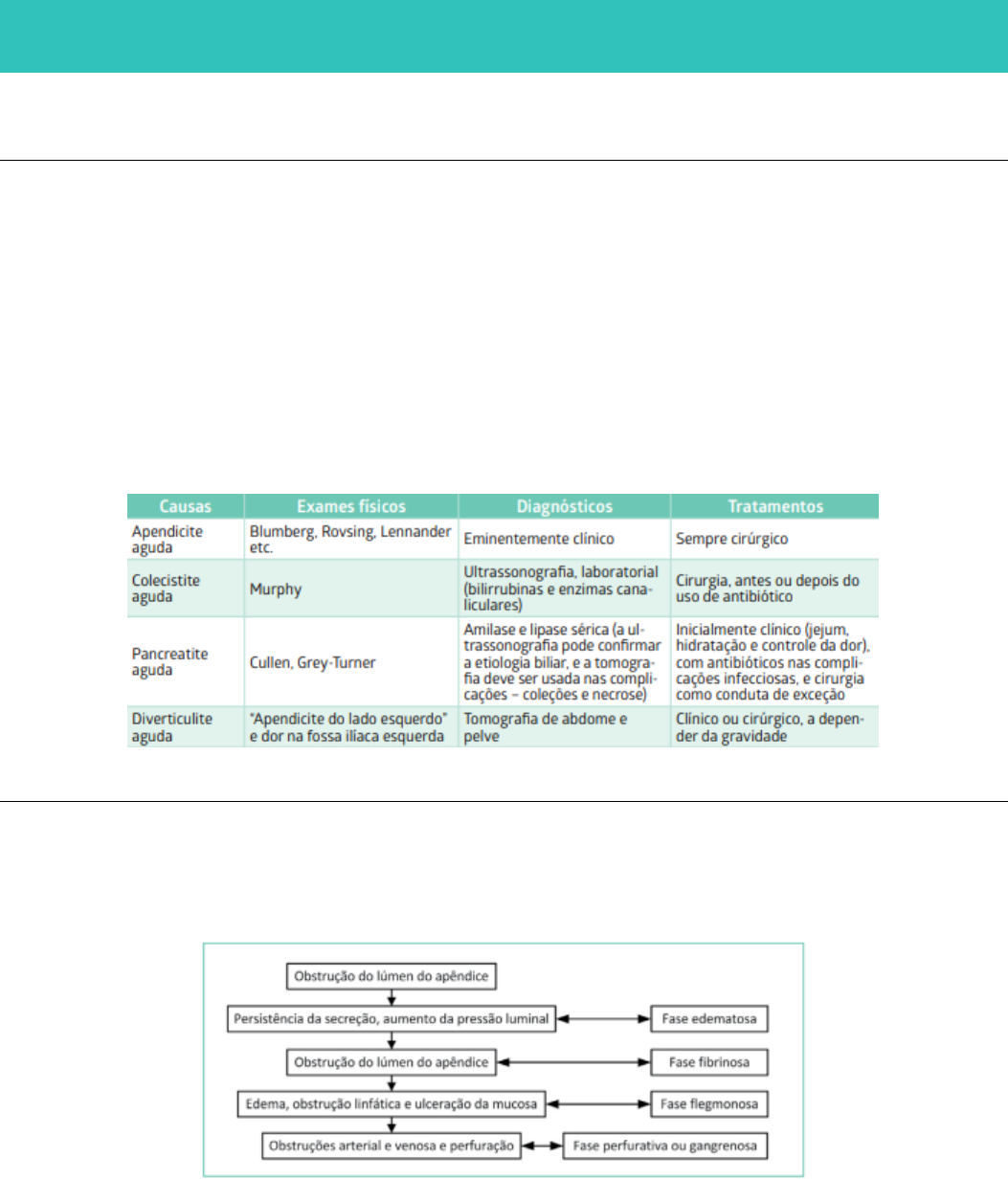 Pedro Santos ABDOME AGUDO INFLAMATÓRIO Definições O abdome agudo é uma síndrome dolorosa aguda de intensidade variável, que leva o paciente a procurar o serviço de urgência e requer tratamento imediato clínico ou operatório. Não tratado, evolui com piora dos sintomas e progressiva deterioração do estado geral. Diversas classificações são adotadas para o agrupamento das diversas causas de abdome agudo. Didaticamente, o termo “abdome agudo inflamatório” envolve as afecções intra-abdominais que geram um quadro de peritonite secundária a um processo infeccioso ou inflamatório. De modo geral, o quadro caracteriza-se por dor de início lento, insidioso e progressivo, com defesa localizada ou generalizada à palpação abdominal. As causas mais comuns de abdome agudo inflamatório são apendicite, colecistite, pancreatite e diverticulite agudas. Apendicite Aguda A apendicite aguda é a afecção cirúrgica mais comumente atendida nos serviços de urgência, além de ser a principal causa de abdome agudo em crianças, adolescentes e adultos jovens. A evolução da doença baseia-se em sua fisiopatologia e pode ser dividida nas fases edematosa, fibrinosa, flegmonosa e perfurativa. O diagnóstico é eminentemente clínico. Na maioria das vezes, o paciente relata uma dor abdominal de moderada intensidade e mal localizada, normalmente periumbilical, que tende a migrar para a Fossa Ilíaca Direita (FID), onde, progressivamente, se torna de maior intensidade. Sintomas como vômitos, anorexia e febre baixa são comuns. Ao exame físico, o paciente pode apresentar sinais de toxemia dependendo da evolução da doença. À palpação abdominal, observa-se a contração voluntária da parede abdominal como um todo, com dor Pedro Santos principalmente à palpação da FID, acompanhada de descompressão brusca dolorosa. Essa manobra propedêutica recebe o nome de sinal de Blumberg. Os exames laboratoriais são inespecíficos, e os de imagem devem ser indicados apenas na dúvida diagnóstica, principalmente a mulheres, para diagnóstico diferencial com patologias ginecológicas, como piossalpinge e moléstia inflamatória pélvica aguda, sendo a ultrassonografia (USG) abdominal e a Tomografia Computadorizada (TC) os mais utilizados. O tratamento é cirúrgico. A apendicectomia pode ser realizada por incisão oblíqua (McBurney) ou transversal (Davis) na FID, e a laparoscopia é indicada especialmente aos casos de dúvida diagnóstica ou aos pacientes obesos. Colecistite Aguda A colecistite aguda representa a 3ª causa de internação nos serviços de Emergência, estando associada aos cálculos em mais de 95% dos casos, e resulta da obstrução do ducto cístico por cálculo impactado no infundíbulo, tornando a vesícula inflamada e distendida. A colecistite aguda alitiásica pode ocorrer em 3 a 5% das vezes, sobretudo entre pacientes críticos em terapia intensiva, diabéticos e aqueles que receberam nutrição parenteral recentemente. O quadro clínico caracteriza-se por dor persistente no hipocôndrio direito (HCD), associada a náuseas e a vômitos. A febre não é comum na fase inicial. Episódios no passado, com resolução espontânea ou a partir do uso de antiespasmódicos, são comuns. Ao exame físico, nota-se defesa à palpação do HCD. O chamado sinal de Murphy consiste em comprimir o HCD e solicitar ao paciente uma inspiração profunda. Na vigência de colecistite, a irritação peritoneal o fará cessar a respiração. A avaliação laboratorial deve contar com bilirrubinas e enzimas canaliculares para a avaliação de cálculos na via biliar. A USG abdominal é o método de eleição para o diagnóstico, revelando espessamento da parede da vesícula, líquido e/ou ar perivesicular, além de indicar a presença e a localização dos cálculos. O tratamento da colecistite aguda é cirúrgico, mas o momento de indicação operatória pode variar. De modo geral, preconiza-se a indicação precoce, e a operação só não é realizada de imediato quando a doença se apresenta na forma não complicada em paciente de alto risco operatório. A colecistectomia videolaparoscópica é considerada padrão-ouro, e a antibioticoterapia é de curta duração, exceto quando há infecção associada. Pancreatite Aguda A pancreatite aguda é um processo inflamatório do pâncreas, geralmente de natureza química, provocado por enzimas digestivas produzidas por ele próprio, e que tem como resultado uma autodigestão da glândula. A etiologia mais comum é a litíase biliar (70%), seguida de etilismo e hipertrigliceridemia. Algumas casuísticas relatam de 5 a 10% de casos de pancreatite aguda idiopática. A dor abdominal é o elemento mais importante no quadro clínico, normalmente associado a vômitos. A dor em faixa do abdome superior e do dorso está presente em aproximadamente 50% dos casos. Sinais de toxemia, como febre e alterações circulatórias, denotam quadros avançados. Alguns sinais propedêuticos, Pedro Santos como as manchas equimóticas periumbilicais (sinal de Cullen) ou no flanco esquerdo (sinal de Grey- Turner), são secundários a hemorragia peritoneal ou retroperitoneal. Os principais exames para a confirmação diagnóstica são as dosagens de amilase e lipase séricas. Essas medidas são qualitativas, não quantitativas, de modo que não se relacionam à gravidade do quadro. A avaliação da gravidade é feita por dados clínicos e laboratoriais, e os parâmetros de Ranson são avaliados na admissão e após 48 horas. A presença de 3 ou mais parâmetros indica pancreatite aguda grave. A USG abdominal pode confirmar a etiologia biliar. A indicação de TC de abdome está reserva�da aos quadros complicados, para avaliação de complicações, como coleções e necrose. Preconiza-se a TC após 72 horas do início dos sintomas àqueles com elementos sugestivos de gravidade. Formas leves podem ser tratadas com jejum, hidratação vigorosa e controle da dor. Se a e