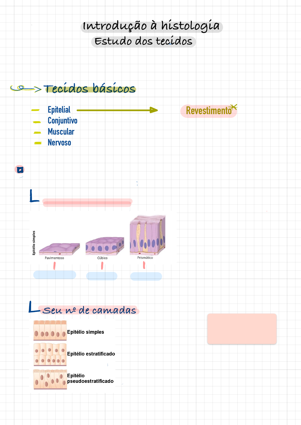 O tecido epitelial sempre repousa sobre um tecido conjuntivo que da suporte. 1 camada de células 2 ou + camadas de células Única camada com os núcleos das células desordenados Pavimentoso Cuboide Colunar Ex: Tecido Epitelial Simples Colunar O tecido epitelial pode ser classificado por: Sua morfologia: Seu nº de camadas Tecidos básicos Epitelial Conjuntivo Muscular Nervoso Tipos: Revestimento Glandular; Especializado Estudo dos tecidos Introdução à histologia - - -D - ë * =Óæûë =>> Âë *..... S = - ↑ ↑ D ⑪ A # ↑ - HEMATOXILINA - EOSINA Coloração - padrão HE A hematoxilina é um corante básico, que tem atração a substâncias ácidas. Essas substâncias ácidas, portanto, são coradas pela hematoxilina (azul- púrpura), e recebem o nome de basófilas. A eosina (Vermelho/Rosa), ao contrário da hematoxilina, tem caráter ácido e, sendo assim, atrai substâncias básicas, conhecidas como acidófilas Observando a imagem, o núcleo se apresenta na coloração azul-púrpura, ou seja, é basófilo, ou seja, é atraído pele hematoxilina. Já o citoplasma da célula tem um caráter mais básico e é, portanto, corado em tonalidades de vermelho pela eosina. Especializações apicais Cílios Microvilosidades Estereocilios Estão sempre no ápice de epitélio Imóveis (epidídimo) Móveis, menos numerosos e mais alongados ( cavidade nasal, traqueia) e ⑳ & e ~ ↑ Pele grossa e Pele fina Palma da mão Planta do pé Joelho Cotovelo Restante da pele Como diferenciar uma lâmina de PELE FINA da lâmina de PELE GROSSA? Espessura da camada de queratina Numero de camadas de células do epitélio Queratina Queratina Pele espessa Pele fina Epitélio de transição > urotélio Epitélio especializado O epitélio denominado de transição reveste internamente a bexiga e outros locais ocos do sistema urinário. > I - - - - 1- 2- > > * - 08 TECIDO CONJUNTIVO Células Residentes Transitórias Matriz extracelular Tecido conjuntivo especializado - sanguíneo, cartilaginoso, ósseo, hematopoético. Tecido conjuntivo propriamente dito Fibroblasto/ fibrocitos Adipócitos Células tronco Células de defesa Parte fibrilar Parte não fibrilar Não cora Fibras elásticas Fibras colágenas Fibras reticulares Classificação Frouxo : alta celularidade e baixa quantidade de fibras Denso : baixa celularidade e quantidade elevada de fibras Modelado: fibras organizadas Não modelado: fibras desorganizadas Tecido conjuntivo frouxo - alta celularidade e baixa quantidade de fibras; É encontrado na papila dérmica e na pele Difusão de nutrientes e oxigênios, suporte pro tecido epitelial, permite a migração de células de defesa. Fibrocito: blasto envelhecido Tecido conjuntivo denso não modelado - maior quantidade de fibras, porém desorganizadas e baixa celularidade; É encontrado na derme; Garante suporte, proteção, sustentação. · d ↑ Tecido conjuntivo denso modelado - maior quantidade de fibras colagenas ,organizaras e baixissima celularidade; É encontrado em tendões e ligamentos; Garante resistência. Fibras colagenas - Derme (pele) Função: Proteção, firmeza e revestimento Fibras reticulares - linfonodo, medula óssea, fígado e baço Garante a sustenção dos órgãos hematopoiéticos Fibras elásticas -Revestimento dos vasos, pele, pulmão, bexiga Garante elasticidade