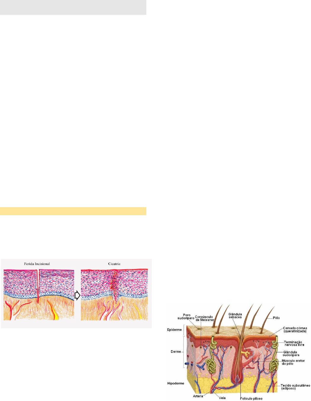 FUNDAMENTOS PARA A PRÁTICA DE ENFERMAGEM I AVALIAÇÃO DE FERIDAS DELIBERAÇÃO 567/18 Nessa resolução relata que as competências do profissional enfermagem é avaliar, prescrever e executar curativos em todos os tipos de feridas, onde deve-se coordenar e supervisionar são os profissionais de Enfermagem, tanto na prevenção e tratamento das lesões cutâneas. Então o Enfermeiro tem direito a consulta de enfermagem para aqueles que presentarem ferida ou risco, realiza a prevenção e cuidado sistematizado e preventivo, pode abrir clinicas ou consultórios especializas, prescrever medicamentos e coberturas terapêuticas, não tendo autonomia para prescrição de antibióticos, solicita exames laboratoriais e de raio X, e ainda pode realizar procedimentos de terapia compressiva e desbridamento. Então o enfermeiro deve ter autonomia, conhecimento, atualização para chegar no resultado esperado, ou seja, a cicatrização. FERIDAS OU LESÃO DEFINIÇÃO = qualquer rompimento nas camadas da pele ocasiona uma ferida, definida como um desarranjo no tecido e ruptura em suas conexões, alteração estrutural e fisiológica. FATORES PARA AVALIAÇÃO DE UMA FERIDA • Anamnese/História da ferida; • Área da ferida; • Condições da ferida; • Circulação; • Medicação atual; • Nutrição; • Avaliação da dor; • Mobilidade; • Aspectos Sociais. Anamnese/História da ferida Avaliação de fatores que predispõe a formação da ferida: Idade: a partir dos 65 anos podem ocorrem intercorrências estruturais, numéricas e funcionais. Também ocorre diminuição da epiderme, fibroblastos, colágeno, fibras e água que ocasiona uma pele adelgaçada, enrugada e inelástica. Diabetes: disfunção microcirculatória não oclusiva (arteríolas e capilares), macrovasculares, colágeno e angiogênese. Nutrição: Averiguar IMC. Exames laboratoriais: albumina, tranferrina sérica, hemoglobina (hb)-icc e hemoconcentração (<5g/dl e > 20g/dl). Tabagismo: < de O2 e causa vasoconstrição. Antecedentes familiares O que devemos identificar em uma ferida? • Localização; • Tipo; • Extensão; • Margem; • Exsudato; • Perilesionar; • Odor; • Leito; • Profundidade. Devemos nos atentar no tipo da pele, tipo de cicatrização, qual fase se encontra, se é ume ferida de difícil cicatrização e o timers. TIPOS DE CICATRIZAÇÃO - PRIMEIRA INTENÇÃO É o tipo de cicatrização que ocorre quando as bordas são apostas ou aproximadas, havendo perda mínima de tecido, ausência de infecção e mínimo edema. A formação de tecido de granulação não é visível. Exemplo: ferimento suturado cirurgicamente - SEGUNDA INTENÇÃO Neste tipo de cicatrização ocorre perda excessiva de tecido com a presença ou não de infecção. A aproximação primária das bordas não é possível. As feridas são deixadas abertas e se fecharão por meio de contração e epitelização. - TERCEIRA INTENÇÃO Designa a aproximação das margens da ferida (pele e subcutâneo) após o tratamento aberto inicial. Isto ocorre principalmente quando há presença de infecção na ferida, que deve ser tratada primeiramente, para então ser suturada posteriormente. CICATRIZAÇÃO DE FERIDAS Consiste em uma perfeita e coordenada cascata de eventos celulares e moleculares que interagem para que ocorra a repavimentação e a reconstituição do tecido. A perda tecidual pode atingir a derme completa ou incompletamente, todo o órgão chegando ao tecido celular subcutâneo, músculos... A cicatrização também depende de vários fatores, locais e gerais como: • A cicatrização dentro de vísceras ocas e cavidades corporais em geral equivale à sequência de reparação na pele. FASE INFLAMATÓRIA Inicia-se no exato momento da lesão. O sangramento traz consigo plaquetas, hemácias e fibrina, selando as bordas da ferida, ainda sem valor mecânico, mas facilitando as trocas. O coágulo formado estabelece uma barreira impermeabilizante que protege da contaminação. Com a lesão tecidual, há liberação local de histamina, serotonina e bradicinina que causam vasodilatação e aumento de fluxo sanguíneo no local e, consequentemente, sinais inflamatórios como calor e rubor. A permeabilidade capilar aumenta causando extravasamento de líquidos para o espaço extracelular, e consequente edema. A resposta inflamatória, que perdura cerca de três dias, e na qual ocorre a migração sequencial das células para a ferida é facilitada por mediadores bioquímicos que aumentam a permeabilidade vascular, favorecendo a exsudação plasmática e a passagem de elementos celulares para a área da ferida. Os mediadores bioquímicos de ação curta são a histamina e serotonina e as mais duradouras são a leucotaxina, bradicinina e prostaglandina. A prostaglandina é um dos mediadores mais importantes no processo de cicatrização, pois além de favorecer a exsudação vascular, estimula a mitose celular e a quimiotaxia de leucócitos. Os primeiros elementos celulares a alcançar o local da ferida são os neutrófilos e os monócitos, com a função de desbridar as superfícies da ferida e fagocitar as partículas antigênicas e corpos estranhos. O pico de atividade dos polimorfonucleares ocorre nas primeiras 24-48 horas após o trauma, seguindo-se de um maior aporte de macrófagos durante os dois a três dias seguintes. O macrófago, também ativa os elementos celulares das fases subseqüentes da cicatrização tais como fibroblastos e células endoteliais. Fase em que aparecem os sinais clínicos da inflamação (edema, eritema, calor e dor). • Resposta ao trauma - há uma reação vascular e inflamatória - hemostasia - remoção de restos celulares e de microrganismos. • Células de defesa (neutrófilos), função primária e destruir bactérias por meio da fagocitose e da liberação de enzimas e dos radicais livres. • Ação dos macrófagos, que destroem as bactérias, limpam o local da ferida dos resíduos celulares