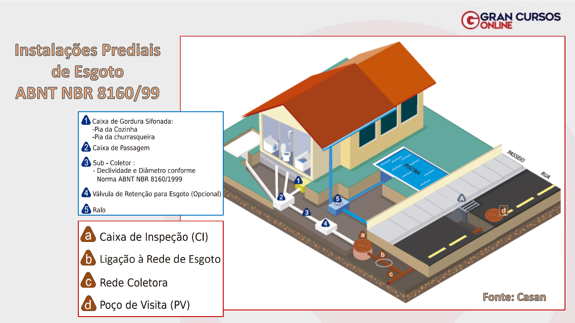 Roteiro da Aula 1. Revisão sistema de água fria 2. Generalidades 3. Documentação básica de projeto 4. Ramal de Descarga e Ramal de Esgoto 5. Declividades mínimas dos Ramais de descarga e de esgoto 6. Diâmetros Mínimos 7. Classificação do sistema de esgotos 8. Componentes do sistema de esgoto 9. Caixas Sifonadas Desconectores ou Sifões 10. Ventilação Sanitária 11. Caixa de Passagem (CP) 12. Caixa de Inspeção (CI) 13. Caixa de gordura (CGD) 14. Caixa coletora (CC) 15. Coletor Predial 16. Sequência 17. Dimensionamento 18. Simbologia 19. Conexões +De 70 Questões Resolvidas! Instalações Prediais de esgoto Sistema Predial de Água Fria Subsistema de alimentação: ✓ Ramal predial; ✓ Cavalete / hidrômetro; ✓ Alimentador predial Subsistema de reservação: ✓ Reservatório inferior; ✓ Estação elevatória; ✓ Reservatório superior. Subsistema de distribuição interna: ✓ Barrilete; ✓ Coluna; ✓ Ramal; ✓ Sub-ramal. Instalações Prediais de esgoto Sistema Predial de Água Fria Subsistema de alimentação: ✓ Ramal predial; ✓ Cavalete / hidrômetro; ✓ Alimentador predial Subsistema de reservação: ✓ Reservatório inferior; ✓ Estação elevatória; ✓ Reservatório superior. Subsistema de distribuição interna: ✓ Barrilete; ✓ Coluna; ✓ Ramal; ✓ Sub-ramal. Instalações Prediais de esgoto Sistema Predial de Água Fria Subsistema de alimentação: ✓ Ramal predial; ✓ Cavalete / hidrômetro; ✓ Alimentador predial Subsistema de reservação: ✓ Reservatório inferior; ✓ Estação elevatória; ✓ Reservatório superior. Subsistema de distribuição interna: ✓ Barrilete; ✓ Coluna; ✓ Ramal; ✓ Sub-ramal. RG - Registro de Gaveta RP - Registro de Pressão Válvula Globo Válvula gaveta Instalações Prediais de esgoto Generalidades O sistema de esgoto sanitário tem por funções básicas coletar e conduzir os despejos provenientes do uso adequado dos aparelhos sanitários a um destino apropriado. Por uso adequado dos aparelhos sanitários pressupõe-se a sua não utilização como destino para resíduos outros que não o esgoto. O sistema predial de esgoto sanitário deve ser projetado de modo a: Instalações Prediais de esgoto ✓ Evitar a contaminação da água, de forma a garantir a sua qualidade de consumo, tanto no interior dos sistemas de suprimento e de equipamentos sanitários, como nos ambientes receptores; ✓ Permitir o rápido escoamento da água utilizada e dos despejos introduzidos, evitando a ocorrência de vazamentos e a formação de depósitos no interior das tubulações; ✓ Impedir que os gases provenientes do interior do sistema predial de esgoto sanitário atinjam áreas de utilização (fecho hídrico); ✓ Impossibilitar o acesso de corpos estranhos ao interior do sistema; ✓ Permitir que os seus componentes sejam facilmente inspecionáveis; ✓ Impossibilitar o acesso de esgoto ao subsistema de ventilação; ✓ Permitir a fixação dos aparelhos sanitários somente por dispositivos que facilitem a sua remoção para eventuais manutenções. Generalidades O sistema predial de esgoto sanitário deve ser separador absoluto em relação ao sistema predial de águas pluviais, ou seja, não deve existir nenhuma ligação entre os dois sistemas. A disposição final do efluente do coletor predial de um sistema de esgoto sanitário deve ser feita: ✓ Em rede pública de coleta de esgoto sanitário, quando ela existir; ✓ Em sistema particular de tratamento, quando não houver rede pública de coleta de esgoto sanitário. Deve ser evitada a passagem das tubulações de esgoto em paredes, rebaixos, forros falsos, etc. de ambientes de permanência prolongada. Caso não seja possível, devem ser adotadas medidas no sentido de atenuar a transmissão de ruído para os referidos ambientes. Instalações Prediais de esgoto CEBRASPE (CESPE) 2018 Especialista Portuário (EMAP) No que tange a redes de esgoto predial escoado por sistema de bombeamento, julgue o seguinte item. Nesse tipo de rede, dado o alto custo do sistema de bombeamento, admite-se aproveitar a mesma caixa coletora de esgoto como caixa de drenagem de águas pluviais. Instalações Prediais de esgoto CEBRASPE (CESPE) 2018 Especialista Portuário (EMAP) No que tange a redes de esgoto predial escoado por sistema de bombeamento, julgue o seguinte item. Nesse tipo de rede, dado o alto custo do sistema de bombeamento, admite-se aproveitar a mesma caixa coletora de esgoto como caixa de drenagem de águas pluviais. E! 4.1.3.1 O sistema predial de esgoto sanitário deve ser separador absoluto em relação ao sistema predial de águas pluviais, ou seja, não deve existir nenhuma ligação entre os dois sistemas. Instalações Prediais de esgoto QUADRIX 2020 Fiscal Municipal de Obras (IDURB) Por uso adequado dos aparelhos sanitários pressupõe‐se a sua não utilização como destino para resíduos outros que não o esgoto. Instalações Prediais de esgoto QUADRIX 2020 Fiscal Municipal de Obras (IDURB) Por uso adequado dos aparelhos sanitários pressupõe‐se a sua não utilização como destino para resíduos outros que não o esgoto. C! 4 Requisitos gerais 4.1 Generalidades 4.1.1 O sistema de esgoto sanitário tem por funções básicas coletar e conduzir os despejos provenientes do uso adequado dos aparelhos sanitários a um destino apropriado. 4.1.2 Por uso adequado dos aparelhos sanitários pressupõe-se a sua não utilização como destino para resíduos outros que não o esgoto. Instalações Prediais de esgoto Documentação básica de projeto 3) Esquema vertical (ou fluxograma geral) apresentado em separado ou em conjunto com o sistema predial de águas pluviais, sem escala, indicando os componentes do sistema e suas interligações; 4) Plantas, em escala conveniente, dos ambientes sanitários, com a indicação do encaminhamento das tubulações; 5) Detalhes (cortes, perspectivas, etc.) que se fizerem necessários para melhor compreensão do sistema