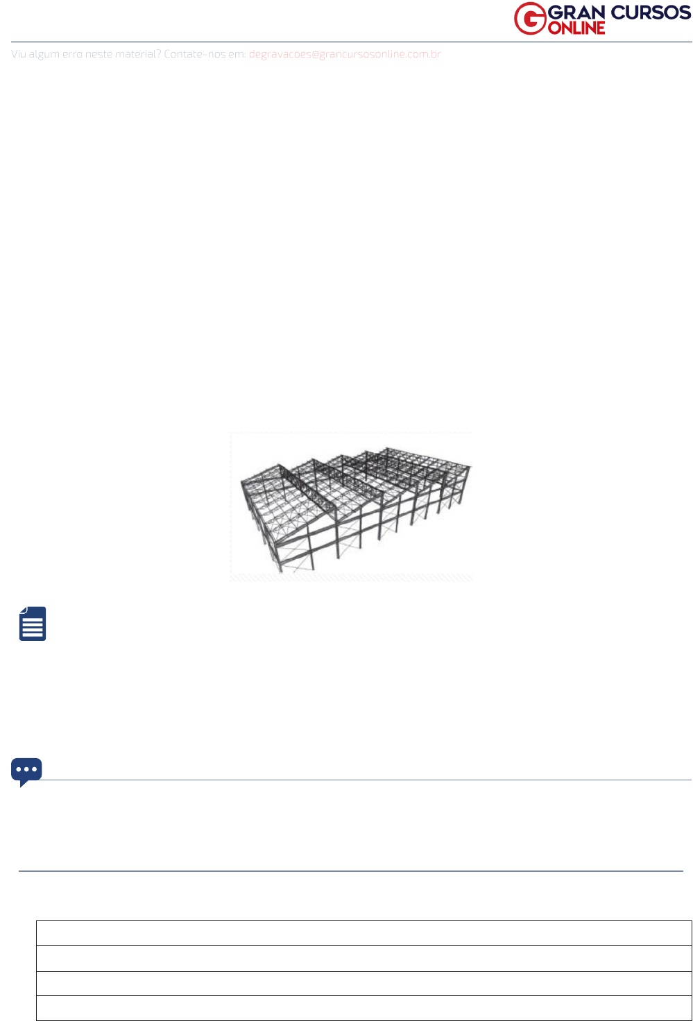 1 www.grancursosonline.com.br Viu algum erro neste material? Contate-nos em: degravacoes@grancursosonline.com.br Construção Civil IV ENGENHARIA CIVIL A N O TA ÇÕ ES CONSTRUÇÃO CIVIL IV COBERTURAS Trama e estrutura secundária: conjunto integrado pelas terças, caibros e ripas. • Tesoura Tipo Shed: a estrutura tipo Shed é de grande vantagem nas construções industriais, pois além dos efeitos benéficos de boa iluminação e ventilação, pos- sibilita também com facilidade a ampliação da área coberta em todos os senti- dos, principalmente quando há um planejamento para se construir por etapas e a logo prazo. Nesse caso, costuma-se executar as paredes de fechamento com chapas de cimento-amianto, tendo como objetivo a possibilidade de serem desmontadas e trans- portadas quando se julgar necessária a ampliação. – É possível fazer um galpão shed ou um galpão em shed de forma regular. DIRETO DO CONCURSO 1. (CEBRASPE/2018/OFICIAL TÉCNICO DE INTELIGÊNCIA/ÁREA 5) A estrutura tipo Shed é recomendada para construções industriais, haja vista benefícios como boa iluminação, ventilação e facilidade para ampliação. COMENTÁRIO A estrutura tipo Shed (galpão em inglês) é o nome dado ao sistema de cobertura modular indicado na imagem a seguir. É recomendada para construções industriais, haja vista benefícios como boa iluminação, ventilação e facilidade para ampliação. 2 www.grancursosonline.com.br Viu algum erro neste material? Contate-nos em: degravacoes@grancursosonline.com.br Construção Civil IV ENGENHARIA CIVIL 2. (CESPE/STJ/2015) Apesar de ser o tipo mais econômico e mais empregado no Brasil para estruturas de madeira de telhados residenciais, a tesoura do tipo Howe dificulta a execução da ligação das diagonais com os banzos por meio de entalhes. COMENTÁRIO A tesoura do tipo Howe — tipo mais comum no Brasil — facilita a execução da ligação das diagonais, pois consistem em barras diagonais comprimidas e montantes tracionados. São características da tesoura tipo Howe: • Barras ligadas em triângulo; • Tesoura isostática, simples e de fácil instalação; • Pode ser usada para telhas cerâmicas ou chapas metálicas. Estudaremos agora a seção transversal do telhado, observe: 3 www.grancursosonline.com.br Viu algum erro neste material? Contate-nos em: degravacoes@grancursosonline.com.br Construção Civil IV ENGENHARIA CIVIL A N O TA ÇÕ ES Observações sobre a imagem: • Cumeeira: parte mais alta do telhado. • Frechal: localiza-se acima do pilar. • Chapuz: dificilmente é cobrado em provas. • Pendural ou Pendural central: está pendurado. • Pontalete, Montante ou Pendural: não é o central. • Ferragem ou Estribo: geralmente é uma peça de amarração. Sambladuras e entalhes: ligações entre duas peças de madeiras. Frechal: peça colocada sobre a parede e sob a tesoura, para distribuir a carga do telhado. Perna: peças de sustentação da terça, indo do ponto de apoio da tesoura do telhado ao cume, geralmente trabalham à compressão. Linha: peça que corre ao longo da parte inferior de tesoura e vai de apoio a apoio, geral- mente trabalham à tração. (-) Estribo: são ferragens que garantem a união entre as peças das tesouras. Podem traba- lhar à tração ou cisalhamento. Pendural e tirante: peças que ligam a linha à perna e se encontram em posição perpen- dicular ao plano da linha. Denomina-se pendural quando a sua posição é no cume, e nos demais tirante. Geralmente trabalham à tração. (-) • Pendural: 4 www.grancursosonline.com.br Viu algum erro neste material? Contate-nos em: degravacoes@grancursosonline.com.br Construção Civil IV ENGENHARIA CIVIL A N O TA ÇÕ ES • Tirantes: Asna e escoras: são peças de ligação entre a linha e a perna, encontram-se, geralmente, em posição oblíqua ao plano da linha, denomina-se asna a que sai do pé do pendural. 5m 5 www.grancursosonline.com.br Viu algum erro neste material? Contate-nos em: degravacoes@grancursosonline.com.br Construção Civil IV ENGENHARIA CIVIL DIRETO DO CONCURSO 3. (FUNDATEC/2019/ENGENHEIRO/PREFEITURA DE GRAMADO) Os telhados tradicio- nais no Brasil podem ser definidos como uma composição de duas partes básicas: es- trutura de cobertura, que corresponde ao conjunto de elementos estruturais para susten- tação da cobertura, e telhamento. Tratando dos elementos que compõem a estrutura da cobertura, relacione a Coluna 1 à Coluna 2. Coluna 1: [1] Ripa. [2] Terça. [3] Caibro. [4] Chapuz. [5] Pendural. Coluna 2: ( ) � Calço de madeira, geralmente na forma triangular, que auxilia no travamen- to da terça. ( ) � Atua como apoio direto das telhas. ( ) � Recebe a carga das ripas, auxiliando sua sustentação. ( ) � Elemento vertical presente no centro das tesouras, que vai desde a superfície da linha até a cumeeira. ( ) � Viga que, apoiada sobre a tesoura, sustenta outros elementos da estrutura. 6 www.grancursosonline.com.br Viu algum erro neste material? Contate-nos em: degravacoes@grancursosonline.com.br Construção Civil IV ENGENHARIA CIVIL A N O TA ÇÕ ES COMENTÁRIO Vejamos o conceito de cada um dos elementos citados na questão: • Ripa: atua como apoio direto das telhas. – Decore: telha, ripa, caibro e terça. • Terça: viga que, apoiada sobre a tesoura, sustenta outros elementos da estrutura. • Caibro: recebe a carga das ripas, auxiliando sua sustentação. • Chapuz: calço de madeira, geralmente na forma triangular, que auxilia no travamento da terça. • Pendural: elemento vertical presente no centro das tesouras, que vai desde a superfície da linha até a cumeeira — parte mais alta do telhado. É importante o aluno decorar o nome e as funções dos 16 elementos citados na imagem. 4. (FUNDATEC/2019/ENGENHEIRO CIVIL/PREFEITURA DE PARAÍ) A NBR 15575:2013 (Edificações habitacionais – Desempenho) utiliza-se de termos e definições para diferen- ciar água-mestra, entreforro, lanternim, tra