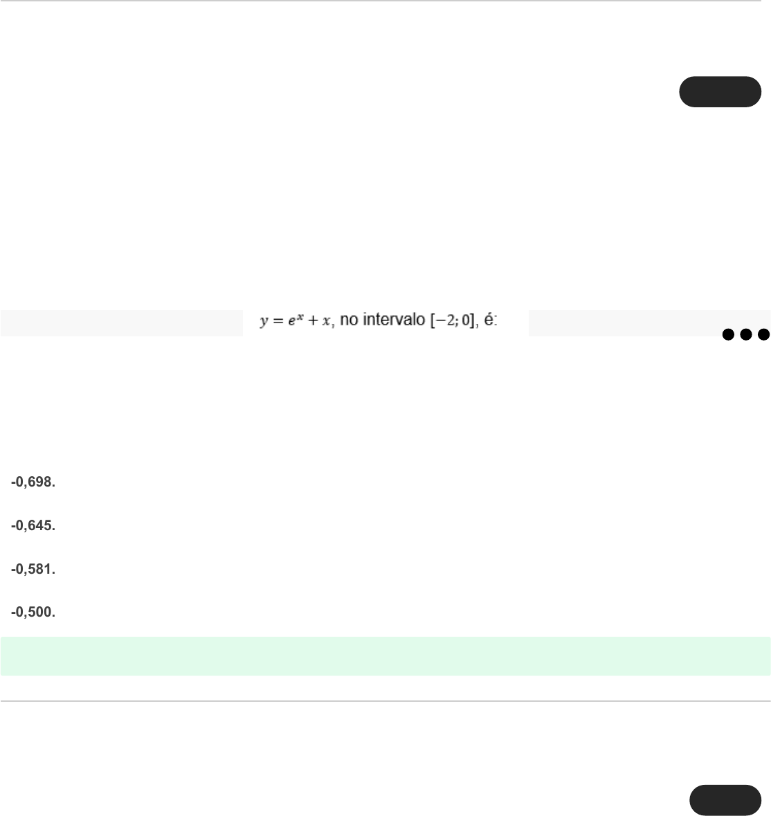 Conteúdo do exercício Ocultar opções de resposta Pergunta 1 0,45 / 0,45 O método das secantes (MS) também recebe a nomeação de método das cordas. Esse dispositivo pode ser definido teoricamente como uma aproximação que utiliza o conceito diferenças finitas aplicado ao Método de Newton-Raphson (MNR). Empregando o Método das Secantes (MS), após três iterações e com precisão de três casas decimais, pode-se afirmar que a raiz da função -0,698. -0,645. -0,581. -0,500. Resposta correta-0,568. Pergunta 2 0 / 0,45 Ocultar opções de resposta O Método de Runge-Kutta de quarta ordem é o mais utilizado para solucionar EDOs. Esse método consiste, basicamente, na realização de quatro estágios para resolver um problema de valor inicial que apresente, explicitamente, uma amplitude, um ponto e um intervalo para limitar x. Incorreta: Resposta correta Pergunta 3 0,45 / 0,45 O método das secantes (MS) é uma versão do Método de Newton – Raphson (MNR). Contudo, em sua dinâmica, não existe a necessidade de derivar a função, o que o torna inicialmente mais rápido se comparado ao outro método. Sobre o método das secantes (MS), avalie as afirmativas a seguir e assinale V para a(s) verdadeira(s) e F para a(s) falsa(s). ( ) É o método que apresenta maior rapidez de convergência, depois do Método de Newton Raphson. ( ) A ordem de convergência do método das secantes (MS) é quadrática. Ocultar opções de resposta ( ) O que diferencia o método das secantes (MS) do método de Newton–Raphson, é a troca da derivada por um quociente de diferença. ( ) Na dinâmica deste método, é fixado o coeficiente, cujo resultado de função apresente resultado negativo. Agora, assinale a alternativa que apresenta a sequência correta. F, F, V, V. V, F, F, V. Resposta corretaV, F, V, F. V, V, V, F. V, V, F, F. Pergunta 4 0,45 / 0,45 Ocultar opções de resposta Leia o excerto a seguir: “Equações diferenciais ocorrem com muita frequência na descrição de fenômenos da natureza. Um exemplo bem simples é o crescimento da população de bactérias em uma colônia. Pode-se supor que sob condições ambientais favoráveis, a taxa de crescimento da colônia seja proporcional ao número de indivíduos num dado tempo [...].” Fonte: BARROSO, L. C.; BARROSO, M. M. A.; CAMPOS, F. F.; CARVALHO, M. L. B.; MAIA, M. L. Cálculo Numérico (com aplicações). 2. Ed. São Paulo: Harbra, 1987. p.185. Agora, assinale a alternativa que apresenta a sequência correta: Resposta corretaV, V, V, F. F, V, F, V. F, F, V, V. V, F, V, F. V, F, F, F. Pergunta 5 0,45 / 0,45 Ocultar opções de resposta Entre as opções de metodologias iterativas, para solucionar sistemas lineares, há o método de Gauss-Jacobi, que funciona utilizando aproximações das soluções anteriores para determinar suas soluções posteriores. F, F, F, V. F, F, V, V. V, V, V, F. V, V, F, F. Resposta corretaV, F, V, F. Pergunta 6 0,45 / 0,45 Ocultar opções de resposta V, V, V, F. F, F, F, V. F, F, V, V. Resposta corretaV, F, V, F. V, V, F, F. Pergunta 7 0,45 / 0,45 Ocultar opções de resposta Leia o excerto a seguir: “Interpolar uma função f(x) consiste em aproximar essa função por uma outra função g(x), escolhida entre uma classe de funções definidas a priori e que satisfaça algumas propriedades. A função g(x) é então usada em substituição a função f(x)”. Fonte: RUGGIERO, M. A. G.; LOPES, V. L. R. Cálculo Numérico Aspectos Teóricos e Computacionais. 2. Ed. São Paulo: Pearson Makron Books, 1996. p. 230. Agora, observe a função descrita pelos pontos dispostos a seguir: Considerando essas informações e o conteúdo estudado sobre interpolação polinomial, pode-se afirmar que o polinômio interpolador da função apresentada é: Resposta correta Pergunta 8 0 / 0,45 O Teorema de Bolzano, fundamental na estrutura teórica do cálculo numérico também recebe a denominação de Teorema do Valor Intermediário, sendo muito utilizado para identificar um possível intervalo no qual se localiza uma raiz ou zero de uma função. Sobre o Teorema de Bolzano, analise as afirmativas a seguir e assinale V para a(s) verdadeira(s) e F para a(s) falsa(s). ( ) Só pode ser aplicado em funções contínuas num intervalo. ( ) Trabalha com a existência de uma raiz em determinado intervalo. Ocultar opções de resposta Ocultar opções de resposta ( ) Se a função preservar o sinal em um determinado intervalo, então existe uma raiz. ( ) Se a função modificar seu sinal em um determinado intervalo, então não existe raiz. Agora assinale a alternativa que apresenta a sequência correta. F, F, V, V. V, F, V, F. Incorreta: V, F, F, V. Resposta corretaV, V, F, F. F, V, F, V. Pergunta 9 0,45 / 0,45 A faixa de números que podem ser representados em ponto fixo é muito escasso para a maioria das aplicações científicas, onde é preciso representar números muito pequenos e/ou números muito grandes. No entanto, há a possibilidade de se utilizar a representação de ponto flutuante, que abrange uma grande faixa de números. Considerando essas informações e o conteúdo estudado, são informações indispensáveis para a representação de ponto flutuante: mantissa, norma, vetor e precisão. base, expoente, mantissa e igualdade. precisão, denominador, base e expoente. Resposta corretaprecisão, base, expoente e mantissa. base, numerador, denominador e expoente. Ocultar opções de resposta Pergunta 10 0 / 0,45 Leia o excerto a seguir: Agora, observe a tabela a seguir, que trata sobre as diferenças finitas relativas à uma determinada função: Considerando essas informações e o conteúdo estudado sobre interpolação polinomial, analise as afirmativas a seguir e assinale V para a(s) verdadeira(s) e F para a(s) falsa(s). Incorreta: V, F, V, F. F, F, V, V. F, V, F, V. V, F, F, F. V, V, F, F.