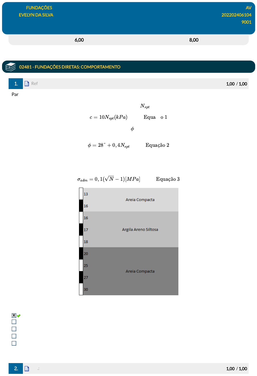Na sondagem a seguir, determine a tensão admissível do solo a dois metros de profundidade usando a tabela com os