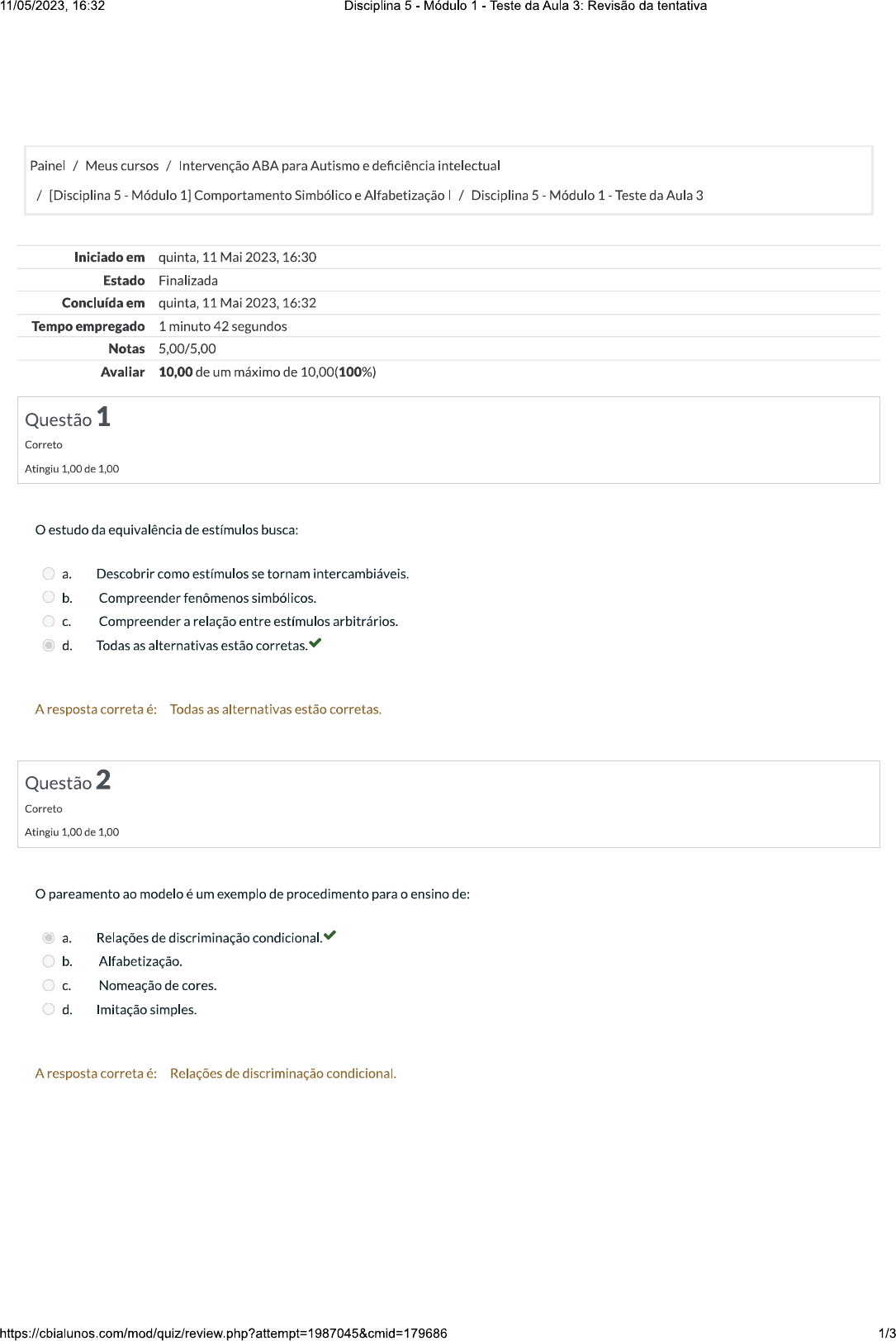 aduação - Intervenção ABA para Autismo e Deficiência Intelectual (A) / [Disciplina 3 - Módulo 1] Cor ciplina 3 - Módulo 1: Teste da Aula 4 Discipli...