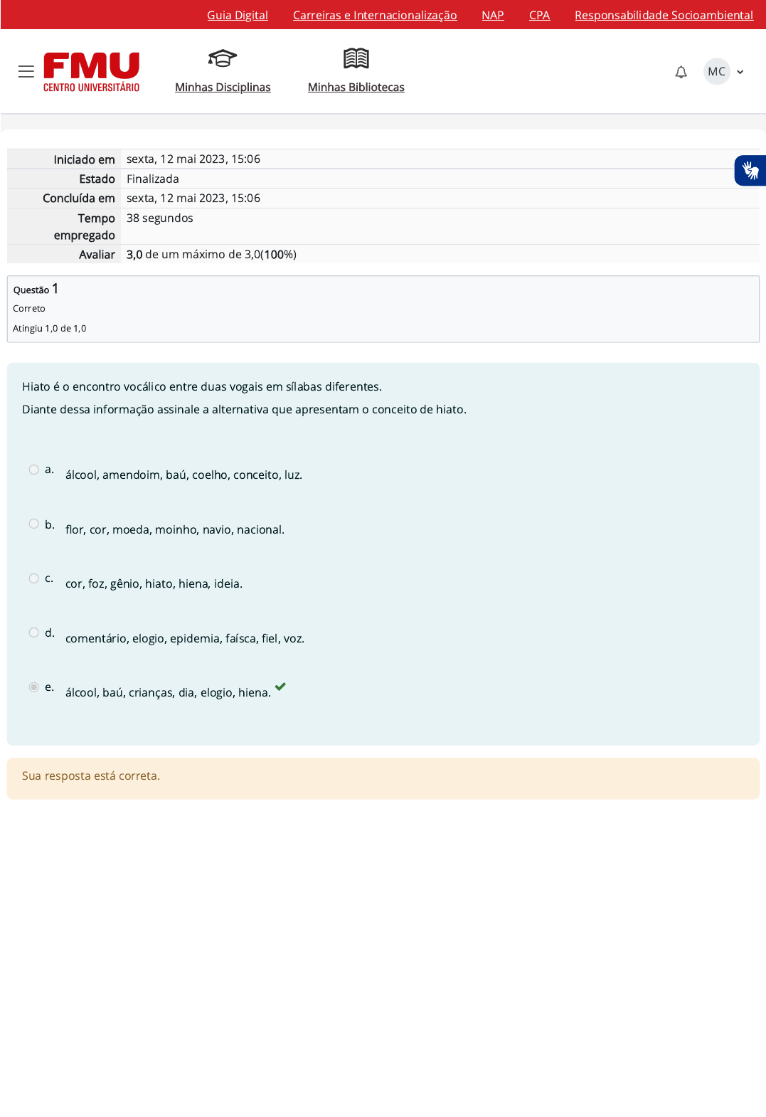Iniciado em sexta, 12 mai 2023, 15:06 Estado Finalizada Concluída em sexta, 12 mai 2023, 15:06 Tempo empregado 38 segundos Avaliar 3,0 de um máximo de 3,0(100%) Questão 1 Correto Atingiu 1,0 de 1,0 Hiato é o encontro vocálico entre duas vogais em sílabas diferentes. Diante dessa informação assinale a alternativa que apresentam o conceito de hiato. a. álcool, amendoim, baú, coelho, conceito, luz. b. �or, cor, moeda, moinho, navio, nacional. c. cor, foz, gênio, hiato, hiena, ideia. d. comentário, elogio, epidemia, faísca, �el, voz. e. álcool, baú, crianças, dia, elogio, hiena. Sua resposta está correta. Guia Digital Carreiras e Internacionalização NAP CPA Responsabilidade Socioambiental Minhas Disciplinas Minhas Bibliotecas MC https://codely-fmu-content.s3.amazonaws.com/Moodle/GuiaDigital/Guia+digital/index.html https://carreiras.fmu.br/ https://codely-fmu-content.s3.amazonaws.com/Moodle/NAP/inicial/nap/fmu/index.html https://codely-fmu-content.s3.amazonaws.com/Moodle/CPA/landing_CPA/index.html https://portal.fmu.br/sustentabilidade https://ambienteacademico.com.br/ https://ambienteacademico.com.br/ https://ambienteacademico.com.br/course/view.php?id=236 Questão 2 Correto Atingiu 1,0 de 1,0 As palavras paroxítonas são palavras que têm a penúltima sílaba como sílaba tônica. Ou seja, cuja pronúncia tem mais força e intensidade. Apesar dessa ênfase, a maioria das paroxítonas não possuem o acento grá�co. Além disso, elas representam a maior parte das palavras da língua portuguesa. Diante dessa informação assinale a alternativa que apresenta somente palavras paroxítonas. a. Café, Dançar, Dor, Macapá, Sagui, Telefone. b. Amor, Bando, Colher, Mulher, Sapo. c. Cantar, Forró, Lamento, Luar, Perceber, Piedade. d. Amapá, Caixa, Intensidade, Palavra, Viagem. e. Caderno, Caneta, Fácil, Garrafa, Lápis, Xerox. Sua resposta está correta. https://codely-fmu-content.s3.amazonaws.com/Moodle/GuiaDigital/Guia+digital/index.html https://carreiras.fmu.br/ https://codely-fmu-content.s3.amazonaws.com/Moodle/NAP/inicial/nap/fmu/index.html https://codely-fmu-content.s3.amazonaws.com/Moodle/CPA/landing_CPA/index.html https://portal.fmu.br/sustentabilidade https://ambienteacademico.com.br/ https://ambienteacademico.com.br/ https://ambienteacademico.com.br/course/view.php?id=236 Questão 3 Correto Atingiu 1,0 de 1,0 As palavras proparoxítonas são as que apresentam tonicidade na antepenúltima sílaba. Todas as palavras proparoxítonas são acentuadas. A palavra “proparoxítona” também é uma proparoxítona. Palavras proparoxítonas são aquelas que possuem a antepenúltima sílaba tônica. Diante dessa informação assinale a alternativa que apresenta somente palavras proparoxítonas. a. Ação, Café, Econômico Fácil, Forró, Município. b. Avó, Calendário, Fácil, Lápis, Município, Você c. Amapá, Avô, Calendário, Jericó, Município, Você, d. Abóbora, Amapá, Café, Econômico, Fácil, Lápis. e. Abóbora, árvore, cientí�co, ginástica, fanático Sua resposta está correta. https://codely-fmu-content.s3.amazonaws.com/Moodle/GuiaDigital/Guia+digital/index.html https://carreiras.fmu.br/ https://codely-fmu-content.s3.amazonaws.com/Moodle/NAP/inicial/nap/fmu/index.html https://codely-fmu-content.s3.amazonaws.com/Moodle/CPA/landing_CPA/index.html https://portal.fmu.br/sustentabilidade https://ambienteacademico.com.br/ https://ambienteacademico.com.br/ https://ambienteacademico.com.br/course/view.php?id=236
