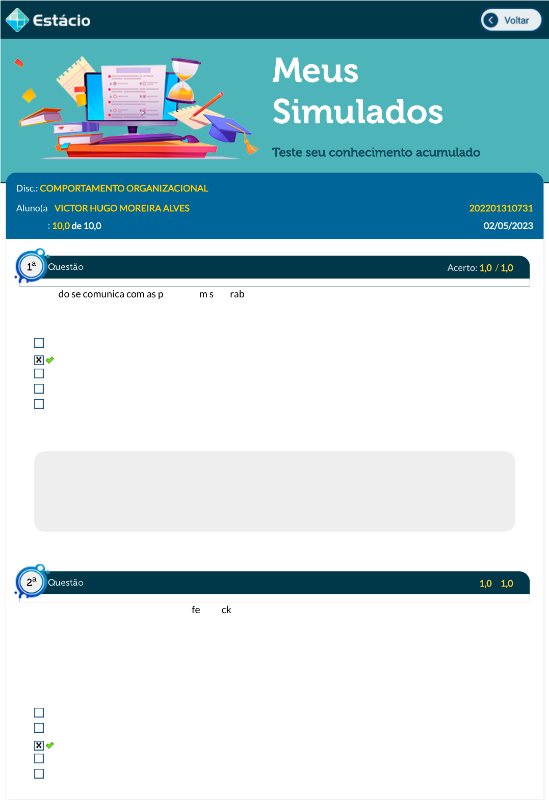12/05/2023, 17:06 Estácio: Alunos https://simulado.estacio.br/alunos/ 1/6 Meus Simulados Teste seu conhecimento acumulado Disc.: COMPORTAMENTO ORGANIZACIONAL Aluno(a): VICTOR HUGO MOREIRA ALVES 202201310731 Acertos: 10,0 de 10,0 02/05/2023 Acerto: 1,0 / 1,0 Quando se comunica com as pessoas em seu trabalho, Maria seleciona e organiza o que ouve a partir dos seus padrões de referência. Logo, as suas in�uências sociais e culturais interferem na forma como se comunica, ocasionando uma barreira regularmente conhecida neste processo, que é a: Comunicação descendente Percepção seletiva Retroação. Comunicação ascendente. Mensagem. Respondido em 02/05/2023 16:19:49 Explicação: A resposta correta é Percepção Seletiva. A tendência é que os receptores prestem mais atenção nas comunicações que considerarem importantes. O que eles classi�cam como desnecessário é, portanto, apagado do cérebro. Chamamos isso de audição seletiva ou percepção seletiva, pois só ouvimos o que queremos. E são as in�uências sociais e culturais que determinam aquilo que o individuo considera importante. Acerto: 1,0 / 1,0 São consideradas diretrizes para um feedback construtivo: I- reformule a mensagem com suas próprias palavras para que a pessoa perceba que você ouviu e compreendeu o que foi dito; II- relate a situação usando exemplos genéricos, culpando-o o outro pelo erro cometido; III- não fale em seu próprio nome, só reproduza as críticas de outros. apenas os itens II e III. apenas os itens I e II. apenas o item I. apenas os itens I e III. os itens I, II e III. Respondido em 02/05/2023 16:22:46 Questão1 a Questão2 a https://simulado.estacio.br/alunos/inicio.asp javascript:voltar(); 12/05/2023, 17:06 Estácio: Alunos https://simulado.estacio.br/alunos/ 2/6 Explicação: A a�rmativa I (reformule a mensagem com suas próprias palavras para que a pessoa perceba que você ouviu e compreendeu o que foi dito) faz parte da diretrizes para um feedback construtivo. Na aifrmativa II (relate a situação usando exemplos genéricos, culpando-o o outro pelo erro cometido) a evasão e não assumir responsabilidades não são diretrizes para um feedback construtivo. Na aifrmativa III (não fale em seu próprio nome, só reproduza as críticas de outros) retrata um padrão deslinhado as diretrizes para um feedback construtivo. Acerto: 1,0 / 1,0 Com o processo de globalização o mundo tornou-se mais dinâmico, o que permitiu que as empresas procurassem sempre estar se adequando às novas formas de composição organizacional, inclusive no que concerne à gestão de pessoas. Dentre essas preocupações, podemos citar o papel da liderança no processo de gestão. Assinale a alternativa que melhor representa o conceito do papel de um líder. O líder tem a capacidade de motivar as pessoas, moldando-as segundo seus planos e atribui-lhes outros objetivos que não os delas. O líder deve estimular os con�itos como forma de facilitar a saída da zona de conforto, trazer novas ideias e soluções, com isso, permitindo o alcance de metas e resultados. O líder procura comandar as pessoas, centralizar o poder e impor seus conhecimentos além de pensar em como se chegar aos resultados e lucros. O líder sabe inspirar seus colaboradores a despertar a curiosidade, a assumir responsabilidades e a ter ousadia além de se preocupar em passar adiante os seus conhecimentos. O líder sabe manter pessoas a �m de garantir o processo de desenvolvimento organizacional e a busca por resultados práticos. Respondido em 02/05/2023 16:23:55 Explicação: O líder não centraliza o poder e não impõe seus conhecimentos. O líder não mantém as pessoas. O líder não molda as pessoas de acordo com seus planos de líder. O líder deve evitar ou gerenciar os possíveis con�itos, não estimular os con�itos. Logo a correta é o líder deve despertar a curiosidade nas pessoas e desenvolver ousadia. Acerto: 1,0 / 1,0 Não há dúvidas de que as empresas foram levadas a reconhecer a realidade do mundo contemporâneo, cuja ideia defende novos modelos de gestão mais participativos. Tal modelo de liderança perpassa pelo(a): I- compartilhamento da missão, propósito e visão institucionais; II- contribuição na formação de valores e crenças organizacionais, modelando o caminho pelo exemplo de forma constante; III- a de�nição de acordos e compromissos de forma autocrática. Questão3 a Questão4 a 12/05/2023, 17:06 Estácio: Alunos https://simulado.estacio.br/alunos/ 3/6 Está(ão) correto(s): os itens I, II e III. apenas os itens II e III. apenas os itens I e II. apenas o item I. apenas os itens I e III. Respondido em 02/05/2023 16:24:49 Explicação: I- compartilhamento da missão, propósito e visão institucionais. - Correta. Modelos participativos de liderança pressupõe o compartilhamento de missão, propósito e visão institucionais. II- contribuição na formação de valores e crenças organizacionais, modelando o caminho pelo exemplo de forma constante - Correta. III- a de�nição de acordos e compromissos de forma autocrática. - Incorreta. A de�nição de acordos e compromissos deve ser feita de forma participativa e não autocrática. Acerto: 1,0 / 1,0 Determinados comportamentos voluntários, que violam as regras estabelecidas e ameaçam o bem-estar organizacional e de seus membros, podem ocorrer em qualquer organização. São eles: I- sabotagem entre colegas; II- demonstração de favoritismo; III- políticas de exclusão. Está(ão) correto(s): apenas os itens I e II. apenas os itens I e III. os itens I, II e III. apenas os itens II e III. apenas o item I. Respondido em 02/05/2023 16:26:43 Explicação: Os três itens ameaçam o bem estar organizacional e devem ser sempre evitados e corrigidos quando notados. I- sabotagem entre colegas - correto. II- demonstração de favoritismo - correto. III- políticas de exclusão - correto. Acerto: 1,0 / 1,0 O desenvolvimento de uma equipe é 