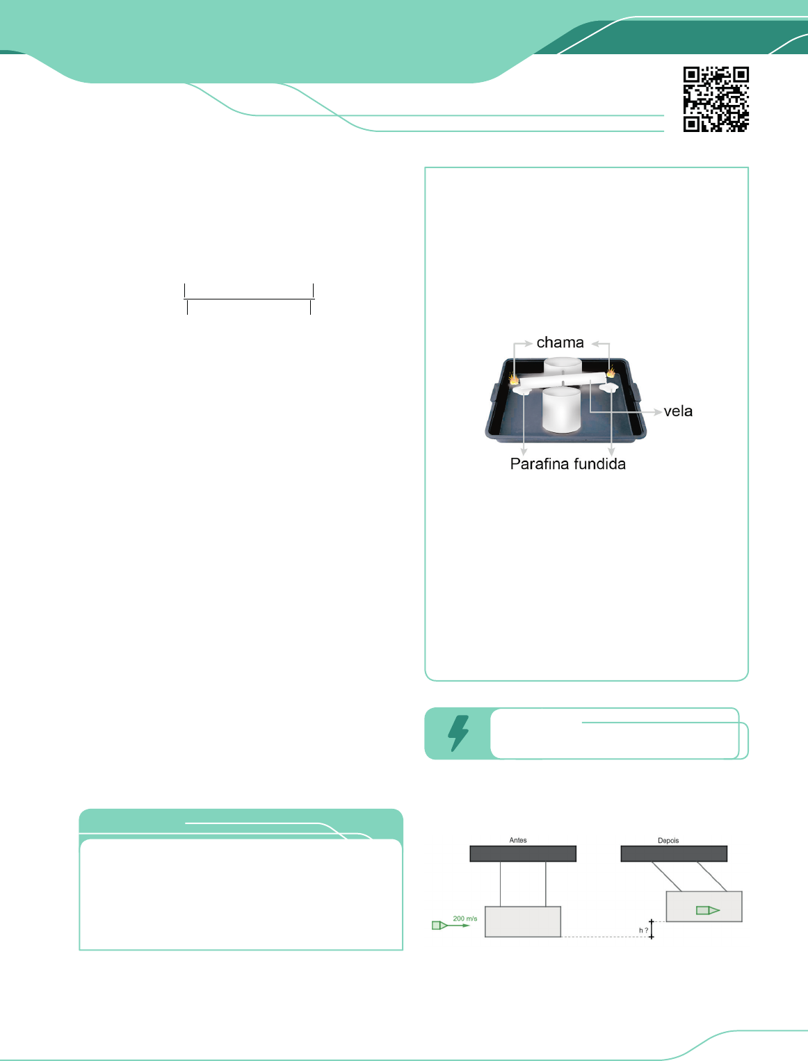 FÍSICA I PRÉ-VESTIBULAR 293SISTEMA PRODÍGIO DE ENSINO COLISÕES: REVISÃO24 Durante uma colisão adotamos que o sistema é isolado, ou seja, livre de forças externas. Com isso usaremos a conservação da quantidade de movimento como base no estudo das colisões. COEFICIENTE DE RESTITUIÇÃO Razão entre a velocidade relativa de afastamento entre os corpos pela velocidade relativa de aproximação entre eles. velocidade relativa depois e velocidade relativa antes = COLISÃO PERFEITAMENTE ELÁSTICA (e = 1) • Velocidade relativa de aproximação igual à velocidade relativa de afastamento. • Há conservação da quantidade de movimento do sistema. antes depois( Q = Q ) • Há conservação da Energia Cinética do sistema. ( EC antes = EC depois ). COLISÃO PERFEITAMENTE INELÁSTICA (e = 0) A velocidade relativa de afastamento entre os corpos é nula, ou seja, os corpos permanecem grudados após o choque. • Há conservação da quantidade de movimento do sistema. antes depois( Q = Q ) • Não há conservação da Energia Cinética, parte da energia mecânica se dissipa em outras formas de energia, como exemplo a energia térmica. COLISÃO PARCIALMENTE ELÁSTICA (0 < e < 1) • Há conservação da quantidade de movimento do sistema. antes depois( Q = Q ) • Não há conservação da Energia Cinética, parte da energia mecânica se dissipa em outras formas de energia, como exemplo a energia térmica. Como transformação de energia pode cair no Enem? As transformações de energia são processos que estão presentes em diversos processos físicos. Devemos sempre analisar essas situações, pensando em cada etapa do processo para identifi car a forma de energia existente etapa por etapa. PROEXPLICA (ENEM) A fi gura ao lado ilustra uma gangorra de brinquedo feita com uma vela. A vela é acesa nas duas extremidades e, inicialmente, deixa-se uma das extremidades mais baixa que a outra. A combustão da parafi na da extremidade mais baixa provoca a fusão. A parafi na da extremidade mais baixa da vela pinga mais rapidamente que na outra extremidade. O pingar da parafi na fundida resulta na diminuição da massa da vela na extremidade mais baixa, o que ocasiona a inversão das posições. Assim, enquanto a vela queima, oscilam as duas extremidades. Nesse brinquedo, observa-se a seguinte sequência de transformações de energia: a) Energia resultante de processo químico → energia potencial gravitacional → energia cinética. b) Energia potencial gravitacional → energia elástica → energia cinética. c) Energia cinética → energia resultante de processo químico → energia potencial gravitacional. d) Energia mecânica → energia luminosa → energia potencial gravitacional. e) Energia resultante do processo químico → energia luminosa → energia cinética. Gabarito: A PROTREINO EXERCÍCIOS 01. Um projétil de massa m = 12 gramas é atirado horizontalmente com velocidade 200 m/s contra um pêndulo vertical cuja massa pendular é M = 1988 gramas. O projétil aloja-se no pêndulo e, devido a colisão, o conjunto sobe até uma altura h. Considere g = 10 m/s² e desconsidere a resistência do ar. Determine a altura h máxima atingida pelo conjunto. PRÉ-VESTIBULAR294 FÍSICA I 24 COLISÕES: REVISÃO SISTEMA PRODÍGIO DE ENSINO 02. Um corpo A colide com um corpo B que se encontra inicialmente em repouso. Os dois corpos estão sobre uma superfície horizontal sem atrito, conforme ilustra a fi gura a seguir: Após a colisão, os corpos permanecem unidos, com uma velocidade igual a 40% daquela inicial do corpo A. Determine a razão entre a massa do corpo A e a massa do corpo B, ou seja, A B m m . 03. Uma esfera A de 300 gramas é abandonada e desliza em uma pista sem atrito até se chocar em uma colisão perfeitamente elástica com uma esfera B de 500 gramas. Calcule a altura máxima alcançada pela esfera B após a colisão. Considere o sistema mecanicamente isolado e g = 10 m/s². 04. Duas esferas A e B, idênticas, são usadas em um experimento. A esfera A é presa em um pêndulo simples e abandonada a uma altura de 20 cm do ponto mais baixo da trajetória. A esfera B é colocada na trajetória da esfera A, e uma colisão frontal perfeitamente elástica ocorre, conforme esquema, fora de escala, acima. A esfera B desliza sem atrito em uma superfície plana e horizontal até cair de uma altura de 3,2 metros. Desconsidere a resistência do ar e adote g = 10 m/s². Calcule: a) a velocidade de B logo após a colisão; b) o alcance da esfera B. 05. Um mini canhão lança obliquamente uma esfera M de 4 Kg que leva 0,4 segundos para atingir no ponto mais alta de sua trajetória outra esfera P de 8 Kg, em repouso no topo de um suporte a 2,4 m de distância horizontal do ponto de lançamento, conforme esquema, fora de escala, abaixo: A colisão entre as esferas é perfeitamente elástica, a resistência do ar é desprezível e g = 10 m/s². Determine a altura Hmáx e a distância X que deve ser colocada uma caixa para que a esfera P caia exatamente dentro dela. PROPOSTOS EXERCÍCIOS 01. (UERJ) A lei de conservação do momento linear está associada às relações de simetrias espaciais. Nesse contexto, considere uma colisão inelástica entre uma partícula de massa M e velocidade V e um corpo, inicialmente em repouso, de massa igual a 10 M. Logo após a colisão, a velocidade do sistema composto pela partícula e pelo corpo equivale a: a) V 10 b) 10 V c) v 11 d) 11 V 02. (UDESC) Na fi gura abaixo, as esferas m2 e m3 estão inicialmente em repouso, enquanto a esfera m1 aproxima-se, pela esquerda, com velocidade constante v1. Após sofrer uma colisão perfeitamente elástica com m2; m1 fi ca em repouso e m2 segue em movimento em direção a m3. A colisão entre m2 e m3 é perfeitamente inelástica. Assinale a alternativa que representa a razão entre a velocidade de m3, após esta colisão, e a velocidade inicial de m1. a) + 1 2 3 m m m b) 2 1 3 m m m+ c) 3 1 2 m m m+ d) 1 2 2 3 m m m m +