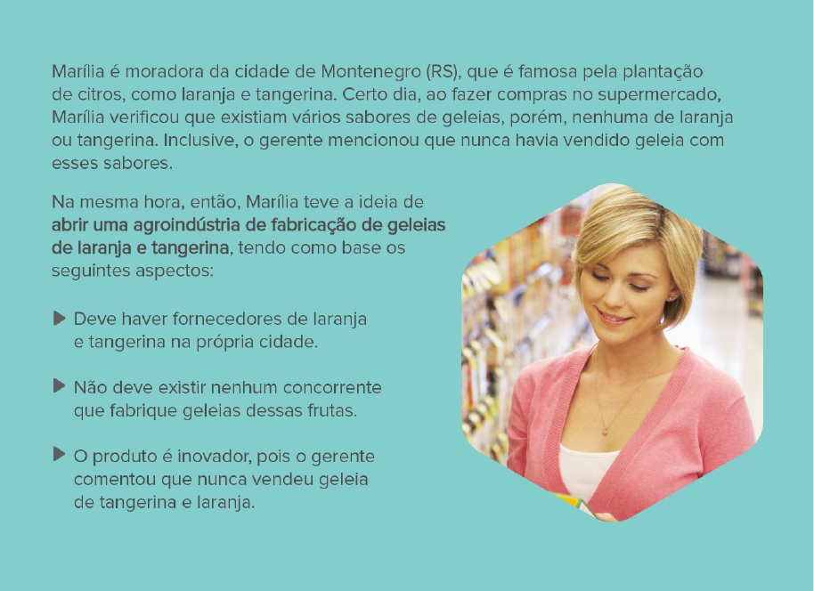 Desafio A análise de mercado é um elemento do plano de negócios de uma empresa e consiste no processo de obtenção de informações relacionadas ao mercado de atuação de uma determinada empresa, que podem acabar impactando o sucesso ou o fracasso desse empreendimento. É por meio da análise de mercado que o empreendedor obterá dados sobre o segmento e o contexto nos quais a organização atuará, o público-alvo, a relação do produto com os fornecedores e o posicionamento da concorrência. Suponha a seguinte situação. Considerando o contexto apresentado, imagine que você é especialista em análise estratégica em agronegócios e deve dar sua opinião a respeito da agroindústria que Marília pretende abrir. Sendo assim, responda: a) Com as três informações passadas, é possível dizer que o empreendimento terá sucesso? Justifique sua resposta. b) Você concorda com o futuro empreendedor em abrir o negócio? Justifique a sua resposta. Padrão de resposta esperado a) Apenas com as três informações (fornecedores de laranja e tangerina na própria cidade; não existe nenhum concorrente que fabrique geleias dessas frutas; o produto é inovador) não é possível dizer que o empreendimento terá sucesso. Isso porque o empreendedor não fez uma pesquisa de mercado, analisando se realmente a população irá consumir o produto. Além disso, simplesmente pelo fato de o supermercado em questão não vender a geleia de laranja ou tangerina não quer dizer que em outros mercados esses produtos não possam existir. É importante também analisar o público-alvo que irá consumir as futuras geleias. Além disso, a tangerina e a laranja são frutas de épocas, ou seja, a produção ocorre apenas durante uma parcela do ano. Nas demais épocas do ano, como Marília fará para obter a matéria-prima básica de sua produção? Esta é uma questão que deve ser analisada antes de abrir a empresa. b) A ideia de Marília é muito boa, pois ela identificou um nicho de mercado, ou seja, ela identificou um produto que ainda não existe na região onde ela mora, sendo que os possíveis fornecedores estão localizados nas redondezas. No entanto, tendo como base as respostas da questão a, não é recomendado que Marília abra a empresa, pois existem muitas informações que devem ser analisadas antes.