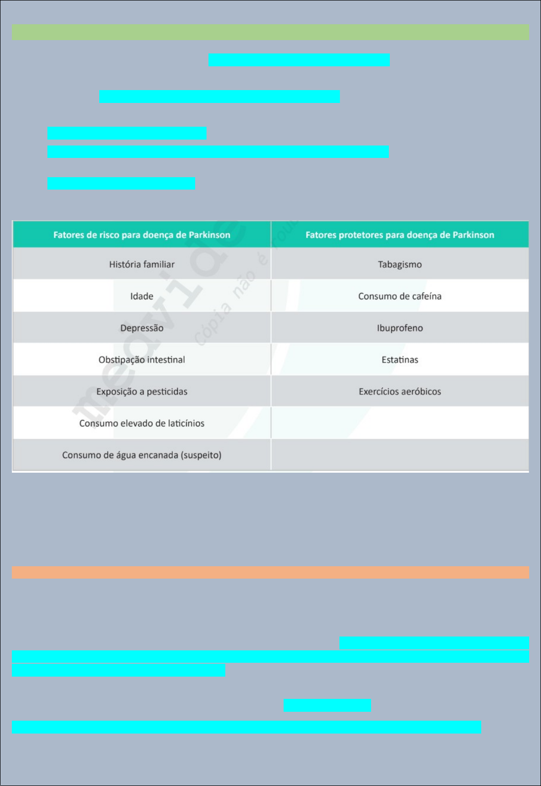 Christiane Novais- 7º semestre medicina DOENÇA DE PARKINSON (DP) · Doença de Parkinson é uma enfermidade neurodegenerativa; · Distribuição universal; · Acomete 2 a 3% da população com mais de 65 anos; · Discreto predomínio no sexo masculino; · Alterações motoras clássicas; · Alterações não motoras (antecedem as alterações motoras, não significa que irão sumir com o aparecimento das alterações motoras); · Desordem multissistêmica; Juvenil <21 anos/ precoce <30/ 40 anos; O fator história familiar é ainda mais importante se houver casos em pessoas com <50 anos. Vale lembrar da importância do fator genético quando se fala do Parkinsonismo juvenil, é raro, mas nas famílias que ocorrem podem ter em mais de uma pessoa e o início dos sintomas podem ocorrer na pré- adolescência. FISIOPATOLOGIA Nossos neurônios começam a morrer a partir dos 30 anos, normalmente o nosso encéfalo encolhe 10% entre os 30 e 70 anos. Quando há DP, esse processo de morte ocorre de forma mais acelerada em determinados neurônios. Não se sabe a causa exata para a DP, mas se sabe que o processo de neurodegeneração começa em determinados locais, como no bulbo olfatório e no núcleo dorsal do vago (X) e vai progredindo para os outros locais. Dentro das células, são encontrados agregados proteicos, esses filamentos proteicos formam inclusões citoplasmáticas eosinofílicas (corpos de Lewy). Os corpos de Lewy são formados principalmente pela alfa-sinucleína e ubiquitina, por isso a DP é chamada de sucleinopatias. O agregado da alfa- sinucleína causa um defeito no sistema ubiquitina- proteossoma, responsável pela degradação de proteínas produzidas com erros de conformação tridimensional. A perda dos neurônios dopaminérgicos na região ventrolateral da substancia negra mesencefálica que se projetam para o putâmen dorsal é o achado da DP que difere do envelhecimento normal, em que há perda de neurônios da parte dorsal da porção compacta da substância negra que se projetam para o núcleo caudado Quando as células/ neurônios da pars compacta da substância negra mesencefálica são perdidos em torno de 60%, aparece os primeiros sintomas motores da DP. A pars compacta da substância negra mesencefálica contém neurônios dopaminérgicos que participam do circuito nigroestriatal. A ação da dopamina sobre receptores D1 do estriado (caudado e putâmen) ativa uma via conhecida como direta (globo pálido interno -> tálamo -> córtex motor) e inativa a via indireta (globo pálido externo -> núcleo subtalâmico -> globo pálido interno -> tálamo -> córtex motor). Em ambos os casos, ela facilita a realização dos movimentos. A dopamina é o principal neurotransmissor envolvido na disfunção neuroquímica na doença de Parkinson e está presente em 4 vias: • nigroestriatal: envolvida com a doença de Parkinson; • mesolímbica e mesocortical: envolvidas com a esquizofrenia; • tuberoinfundibular: responsável pela inibição da produção de prolactina. ETIOPATOGENIA DA DP · Degeneração dos neurônios dopaminérgicos da substância negra (sintomas motores); · Inclusões intracitoplasmática de alfa- sinucleína; · Processo patológico extranigral precedente (sintomas pré- motores); Os sintomas não motores são devido a disfunção em outros neurotransmissores; CLÍNICA Bradicinesia| tremor de repouso| rigidez plástica; Discinesia induzida por levodopa; Perda olfatória/ desnervação simpática cardíaca; MANIFESTAÇÕES MOTORAS BRADICINESIA (80%) Assimétrico, acompanhada de rigidez plástica e/ ou tremor de repouso. É não apenas a lentificação dos movimentos voluntários, mas também diminuição dos movimentos passivos dos membros ao caminhar, redução da expressão facial (facie típica- hipomímica), diminuição do volume da voz (hipofonia), do piscamento e do tamanho da caligrafia (micrografia). É obrigatório sua presença. TREMOR DE REPOUSO É o sintoma que mais leva a busca de atendimento, é de repouso, reemergente e assimétrico. Mas, o tremor também pode aparecer ao realizar determinados movimentos ou ao sustentar o membro em determinadas posições. RIGIDEZ PLÁSTICA| CÉREA Quando se deixa o membro do paciente em determinada posição, ele continua, quando for realizar a movimentação passiva, não importa a velocidade, a resistência é sempre igual no movimento, assimétrica, com o sinal de roda denteada. O paciente acompanha o dedo do médico com os olhos, e durante o movimento ocorre interrupções (seguimento sacádico); Os pacientes que não tem são definidos como rígido- acinético. MANIFESTAÇÕES MOTORAS TARDIAS Tendência de queda para trás durante o pull teste, é comum ele da 2 passos para trás para se equilibrar devido a perda dos reflexos posturais. É comum haver postura fletida do tronco para frente (se exagerada, camptocormia), e a inclinação para um dos lados (sinal de pisa); Em relação com a marcha, a festinação é bem frequente, que são passos curtos e rápidos, com pés próximos (base estreita), parecendo estar correndo em busca do seu centro de gravidade. A dificuldade de atravessar obstáculos é frequente (por uma porta, por ex), isso porque ao mudar de direção o paciente vira em bloco, sem tirar um dos pés do chão. MANIFESTAÇÕES NÃO MOTORAS PRECOCES Depressão| hiposmia/ anosmia| obstipação intestinal| transtorno comportamental do sono REM DEPRESSÃO Afeta cerca de 50% dos pacientes, é leve a moderada, mas ainda assim diminui a qualidade de vida, podendo até mesmo justificar parte da piora motora. Porque a alfa- sinugleina ocorre antes no núcleo da rafe que inibe a 5-HT. HIPOSMIA- PERDA DO OLFATO Acomete 80% dos pacientes, precedendo os sintomas motores em 5-10 anos, é o acometimento mais comum mas muitas vezes passa despercebido, sendo identificado apenas em testes específicos, existe a DP que se inicia antes no bulbo olfatório. MANIFESTAÇÕES AUTONÔMICAS Como a obstipaçã
