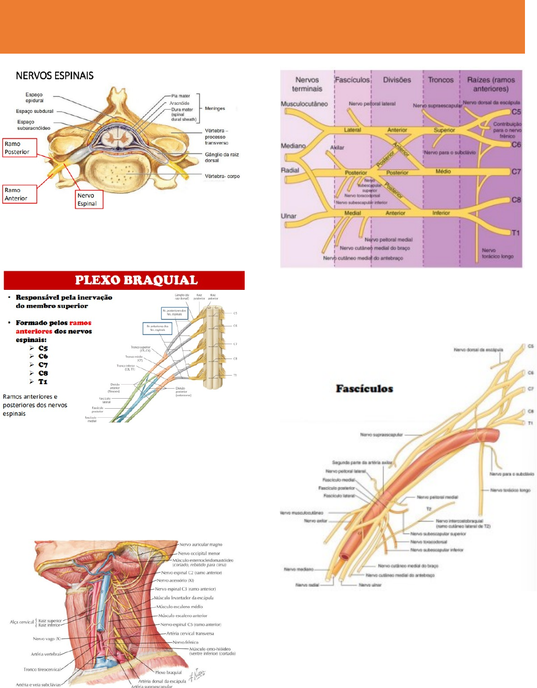INERVAÇÃO DE MMSS Ramos posterior: dorso Ramo anterior: forma plexo braquial Raiz -> ramo ->Tronco –> divisões -> fascículos Plexo braquial: Região clavicular até região da axila Artéria subclávia passa anteriormente ao plexo braquial DIVISÕES DO PLEXO BRAQUIAL Há nervos terminais e nervos colaterais Posição de anterior e posterior é referente a presença da artéria subclávia PARTE SUPRACLAVICULAR: - N. DORSAL DA ESCÁPULA Inervação motora dos M.m. escaleno médio,levantador da escápula, romboides maior e menor. -N. TORÁCICO LONGO Inervação motora para o M. serrátil anterior. Ajuda a fixar a escápula - N. SUPRAESCAPULAR Tronco: C5 e C6 Inervação dos Músculos Supraespinal e infraespinal (abdução e rotação lateral) Função Sensitiva: Articulação do ombro; - N. SUBCLÁVIO Tronco C5 e C6 Inerva músculo subclávio PARTE INFRACLAVICULAR - NN. PEITORAL LATERAL E MEDIAL Lateral: fascículo lateral - C5, 6 e 7 = M. peitoral maior Medial: fascículo medial - C8 e T1= Mm. peitoral menor e maior; - N. MUSCULOCUTÂNEO: Perfura M. coracobraquial e manda ramos para o músc. Braquial e bíceps braquial (flexores) - N. MEDIANO Ramos do fascículo lateral e medial Superficial no pulso Não inerva nada no braço, mas inerva maioria dos flexores *Inervação motora: Antebraço: Músculos flexores; flexor profundo dos dedos; Mão: Eminência tenar e lumbricais laterais (1º e 2º). *Inervação sensitiva: R. palmar; Nn. palmares digitais comuns: Nn. palmares digitais próprios; COMPROMETIMENTO DO N. MEDIANO Síndrome do túnel do carpo Lesão apenas do Nervo interósseo anterior = oposição do polegar e indicador em “pinça”. - N. CUTÂNEOS Fascículo medial: C8, T1 -N. ULNAR Fascículo medial: (C7), C8, T1 Lesão em C7 geralmente afeta tríceps braquial Só tem função em antebraço e mão: motora Função sensitiva só na mão: mesma divisão do n. mediano Passa posteriormente ao epicôndilo medial - N. AXILAR Inervação motora: M. Deltóide e M. redondo menor. Passa ao redor da parte posterior do colo cirúrgico do úmero - N. RADIAL Inervação para o M. tríceps braquial *O nervo radial envia ramos musculares para o músculo tríceps braquial antes de seu trajeto pelo sulco radial do úmero. FUNÇÃO SENSITIVA: