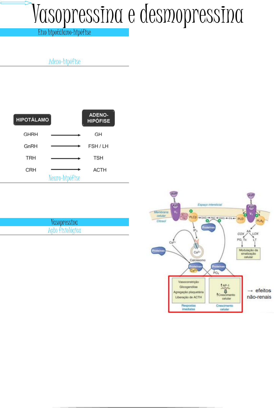 Maria Vitória Videira São João → as estruturas do SNC são muito relacionadas anatômica e funcionalmente, por exemplo, o hipotálamo controla as ações da hipófise → formada por tecido epitelial – o hipotálamo produz e secreta hormônios que integare com receptores presentes na adeno-hipófise, a estimulando a produzir e secretar seus próprios hormônios, que interagirão com receptores nas células-alvo Principais hormônios → formada por tecido neural – neurônios hipotalâmicos projetam axônios sobre a neuro- hipófise, de modo que esta secreta hormônios produzidos pelo hipotálamo (neuro-hipófise não produz hormônios!) → a vasopressina é um hormônio presente na neuro- hipófise, nos corpos de herring, isso significa que eles são produzidos pelo hipotálamo, uma vez que a neuro hipófise apenas armazena-os → esses hormônios que chegam na neuro-hipófise através de projeções dos axônios, são armazenados em vesículas sinápticas próximas das terminações nervosas desses neurônios. quando há o estímulo, ocorre a exocitose das vesículas e liberação dos hormônios que foram sintetizados pelos corpos celulares hipotalâmicos Função → a vasopressina também é chamada de hormônio antidiurético e sua principal função é regular a osmolalidade dos líquidos corporais. para isso ela age sobre as células principais nos ductos coletores renais, aumentando a expressão de aquaporinas na membrana apical dessas células e promove o aumento na reabsorção de água, diminuindo a excreção da mesma Outras funções fora do sistema renal → sistema cardiovascular - vasoconstrição → controle da secreção de ACTH pela adeno-hipófise → SNC - frequência cardíaca, PA, frequência respiratória e padrões do sono → controle da produção de fatores da coagulação → ação sobre agregação plaquetária Receptores da vasopressina Receptores V1 (V1a e V1b) → são acopladps à proteína Gq → a vasopressina se liga ao receptor de membrana (V1) e isso permite com que a proteína G se aproxime do receptor → essa aproximação permite a subunidade alfa trocar GDP por GTP, aumentando sua estimulação energética, se deslocando das outras subunidades e “caminha” pela membrana para procurar a proteína efetora (fosfolipase C) → a fosfolipase C promove a degradação do PIP2 em DAG e IP3 → o DAG promove a ativação de proteínas quinases C (PKC), e o IP3 vai nas reservas de cálcio da célula do reticulo sarcoplasmático e irá liberá-lo para o citoplasma, ficando na forma de cálcio livre e promovendo a ativação de proteínas que resulta no efeito biológico Efeitos biológicos – não renais → vasoconstrição → glicogenólise → agregação plaquetária → liberação de ACTH Efeitos biológicos – renais → aumenta a contração de musculatura lisa nos vasos retos e arteríolas eferentes → diminui fluxo sanguíneo para a medula renal → aumenta a síntese de prostaglandinas e diminui o fluxo de água nas células principais dos ductos Farmacologia “O vai e vem do SUS” Maria Vitória Videira São João coletores - contrabalanceando a atividade antidiurética mediada pelos receptores v2 Receptores V2 → são acoplados a proteína Gs estimulatória → estão presentes nas células principais dos ductos coletores, das células endoteliais vasculares e das células epiteliais do ramo espesso ascendente → o ADH interage com o receptor transmembrana e se liga a ele → essa ligação permite que a proteína G seja estimulada a chegar perto do complexo → quando o complexo se aproxima do receptor, a subunidade alfa é estimulada a trocar um GDP por GTP ficando mais estimulada energeticamente, se deslocando das outras subunidades e se movimenta pela membrana, procurando sua proteína efetora (adenilil- ciclase) → a adenilil-ciclase produz AMPcíclico, promovendo a ativação de cascatas de enzimas quinases, aumentando a expressão de aquaporinas na membrana Efeito biológico – renais → aumento na expressão de aquaporinas na membrana dessas células - isso ocorre através de exocitose. A aquaporina é permeável à água, aumentando a captação de água → aumento no transporte de ureia nos ductos coletores → aumento da excreção de sódio no ramo espesso ascendente da alça de henle e nos ductos coletores → é produzida pelos corpos celulares de neurônios magnocelulares, localizados nos núcleos supraóptico e paraventricular do hipotálamo → a vasopressina também é sintetizada pelo coração (o estresse elevado da parede aumenta a síntese de vasopressina podendo contribuir para o comprometimento do relaxamento ventricular e da vasoconstrição coronariana) e pela glândula suprarrenal (estimula a secreção de catecolaminas e de aldosterona) Pré-pró-hormônio → a vasopressina é sintetizada como pré-pró- hormonio AVP (humano), inicia-se nos corpos celulares do hipotálamo e posteriormente são secretados nos terminais axonais localizados na neuro-hipófise e armazenados em vesículas → quando há estimulação da secreção de vasopressina, ocorre uma série de reações enzimáticas que divide esse pré-pró-hormônio em seus domínios -> vasopressina -> vasopressina-glicopeptídeo -> vasopressina-neurofisina → o pré-pró-hormônio perde o peptídeo sinalizador transformando-se em pró-hormônio, o qual é empacotado em vesículas do complexo de golgi, para posteriormente ser transportado do corpo celular do neurônio para as terminações nervosas → os domínios são separados e constantemente reutilizados na síntese de vasopressina, visto que não são liberados nas correntes sanguíneas Estimulação → vincristina → antidepressivos tricíclicos → adrenalina → lítio → nicotina → altas doses de morfina Inibição → fenitoína → baixas doses de morfina → carmazepina → etanol → vasopressina sintética – solução aquosa disponível para administração E.V
