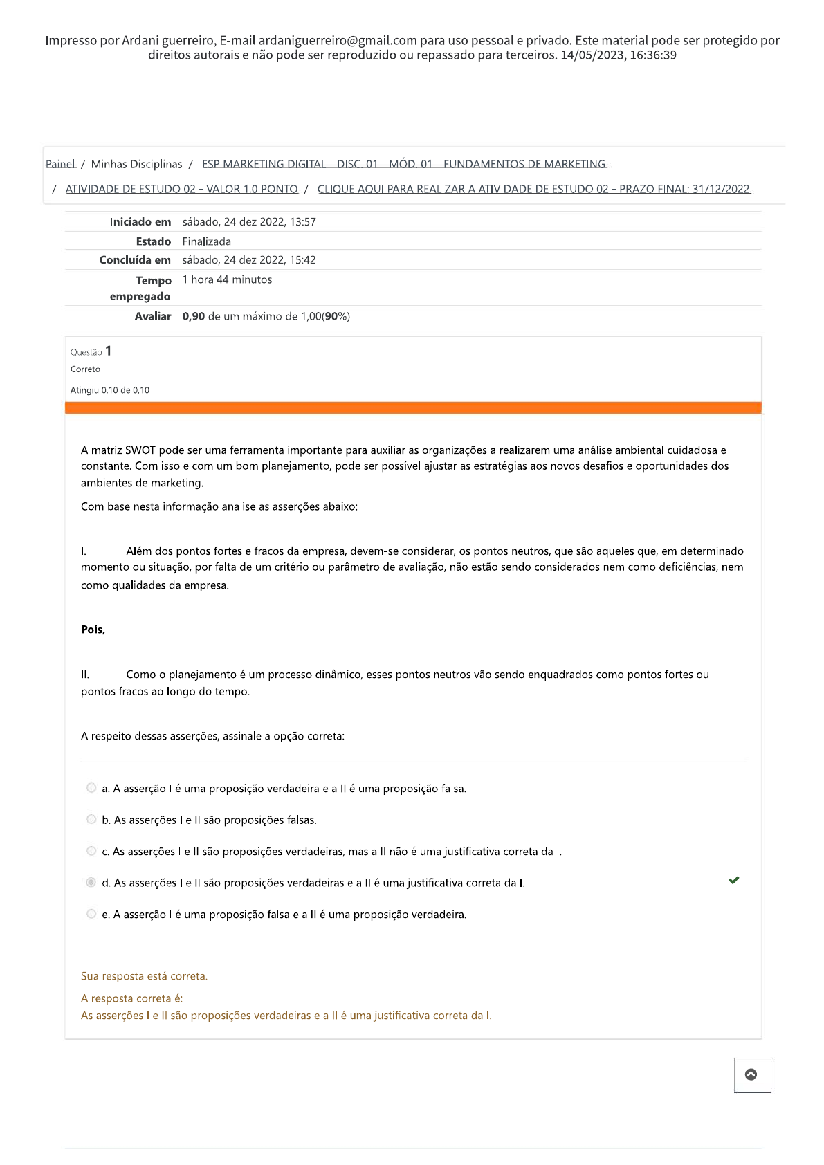 Sobre o significado dos 4 P’s mix de marketing, analise as seguintes assertivas: (I) Produto (II) Preço (III) Profissional (IV) Praça Assina...