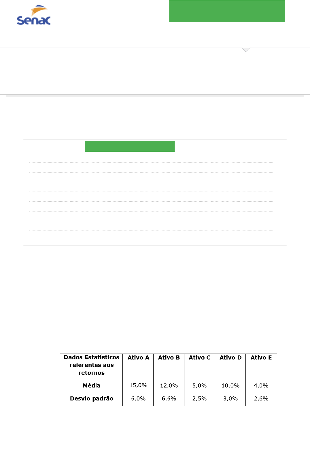25/04/2023, 21:41 Revisar envio do teste: Clique aqui para iniciar a PTI –... https://senacsp.blackboard.com/webapps/assessment/review/review.jsp?attempt_id=_30582980_1&course_id=_211650_1&content_id=_956644… 1/8 Revisar envio do teste: Clique aqui para iniciar a PTI BADMCAS4DA_2301-2301-704688 2301-ANÁLISE MULTIVARIADA DE DADOS Produção Textual Individual REVISAR ENVIO DO TESTE: CLIQUE AQUI PARA INICIAR A PTI Usuário ANA PAULA SOUZA DA SILVA Curso 2301-ANÁLISE MULTIVARIADA DE DADOS Teste Clique aqui para iniciar a PTI Iniciado 24/04/23 20:46 Enviado 25/04/23 21:41 Data de vencimento 02/05/23 23:59 Status Completada Resultado da tentativa 8 em 10 pontos Tempo decorrido 24 horas, 54 minutos Resultados exibidos Todas as respostas, Respostas enviadas, Respostas corretas, Comentários Pergunta 1 As decisões financeiras devem ser tomadas em função dos retornos e dos riscos esperados, e do respectivo impacto dos mesmos sobre o preço do ativo avaliado. O risco de um ativo individual, uma ação, por exemplo, pode ser devidamente avaliado através da variabilidade dos retornos esperados. Portanto, a comparação das distribuições probabilísticas dos retornos, relativas a cada ativo individual, possibilita a quem toma decisões perceber os diferentes graus de risco. Analise, abaixo, os dados estatísticos relativos aos retornos de 5 ativos. Qual é o coeficiente de variação do Ativo B (em porcentagem)? FORMATO DA RESPOSTA: digite somente o valor, sem o símbolo de porcentagem Sala de Aula Tutoriais 1 em 1 pontos ANA PAULA SOUZA DA SILVA 9 https://senacsp.blackboard.com/webapps/blackboard/execute/courseMain?course_id=_211650_1 https://senacsp.blackboard.com/webapps/blackboard/content/listContent.jsp?course_id=_211650_1&content_id=_9485014_1&mode=reset https://www.ead.senac.br/ https://senacsp.blackboard.com/webapps/portal/execute/tabs/tabAction?tab_tab_group_id=_260_1 https://senacsp.blackboard.com/webapps/portal/execute/tabs/tabAction?tab_tab_group_id=_210_1 https://senacsp.blackboard.com/webapps/login/?action=logout 25/04/2023, 21:41 Revisar envio do teste: Clique aqui para iniciar a PTI –... https://senacsp.blackboard.com/webapps/assessment/review/review.jsp?attempt_id=_30582980_1&course_id=_211650_1&content_id=_956644… 2/8 Resposta Selecionada: 55 Resposta Correta: 55 Intervalo de resposta +/- 0 (55 - 55 ) Comentário da resposta: Coeficiente de variação = (desvio-padrão/média). 100 Ativo B CV = (6,6/12)*100 = 55 Pergunta 2 Resposta Selecionada: 25,00 Resposta Correta: 25 Intervalo de resposta +/- 0,01 (24.99 - 25.01 ) Comentário da resposta: Um fabricante de caixas de papelão fabrica 3 tipos de caixas. Testa-se a resistência de cada caixa, tomando-se uma amostra de 100 caixas e determinando-se a pressão necessária para romper cada caixa. São os seguintes os resultados dos testes: Tipos de caixas A B C Pressão média de ruptura (bária) 150 200 300 Desvio-padrão das pressões (bária) 40 50 60 Qual o valor da variação relativa na pressão de ruptura da caixa do tipo B? Formato da resposta: Expresse a resposta em porcentagem com duas casas decimais e não é necessário colocar o símbolo de %. Use vírgula e não ponto. Exemplo: 34,40 CVB = (50/200). 100 = 25% Pergunta 3 Considerando o gráfico abaixo que apresenta os principais portões de entrada de turistas estrangeiros no Brasil em um determinado ano: 1 em 1 pontos 0 em 1 pontos 25/04/2023, 21:41 Revisar envio do teste: Clique aqui para iniciar a PTI –... https://senacsp.blackboard.com/webapps/assessment/review/review.jsp?attempt_id=_30582980_1&course_id=_211650_1&content_id=_956644… 3/8 Resposta Selecionada: 5570080 Resposta Correta: 557.008 Intervalo de resposta +/- 0,01 (557007.99 - 557008.01 ) Comentário da resposta: Quantos turistas entraram via Rio Grande do Sul, sabendo que, no total, entraram 4036290 turistas estrangeiros nesse ano no Brasil. Formato da resposta: Expresse a resposta como um número inteiro e utilize os critérios de arredondamento conhecidos. 0,138. 4036290 = 557008 Pergunta 4 Resposta Selecionada: 18,9 Resposta Correta: 18,9 Comentário da resposta: Visando melhorar o planejamento de seu staff, um hotel de negócios decide levantar o comportamento do faturamento semanal. Uma amostra ao acaso de 15 semanas do último ano indicou os seguintes valores, em milhares de reais: 24,1 17,5 18,9 20,5 21,9 17,2 23,2 18,5 23,7 21,8 24,3 23,2 25,3 22,8 23,4 Podemos afirmar que 25% dos faturamentos estão abaixo de qual valor? Formato da resposta: Use decimal com uma casa após a vírgula (use vírgula e não ponto). Neste caso precisamos determinar o primeiro quartil, já que ele deixa 25% dos valores abaixo dele e, consequentemente, 1 em 1 pontos 25/04/2023, 21:41 Revisar envio do teste: Clique aqui para iniciar a PTI –... https://senacsp.blackboard.com/webapps/assessment/review/review.jsp?attempt_id=_30582980_1&course_id=_211650_1&content_id=_956644… 4/8 75% dos valores acima dele. Como a série tem um número ímpar de elementos, vamos ordená-los primeiro e depois encontraremos a mediana (que será o elemento que está na metade da série – 8ª posição). Na sequência, encontraremos o primeiro quartil .Ou seja, o primeiro quartil estará na 4ª posição da série. Pergunta 5 Resposta Selecionada: 89120000 Resposta Correta: 89.120.000 Intervalo de resposta +/- 0 (89120000 - 89120000 ) Comentário da resposta: (UNICAMP- Adaptada) A figura abaixo exibe, em porcentagem, a previsão da oferta de energia no Brasil em 2030, segundo o Plano Nacional de Energia. Segundo o plano, em 2030, a oferta de energia do país atingirá 557 milhões de tep (toneladas equivalentes de petróleo). Nesse caso, podemos prever que a parcela oriunda de gás natural é: Formato da resposta: Expresse a resposta como um número inteiro e utilize os critérios de arredondamento conhecidos. 0,16. 557 000 000 = 89120 000 Pergunta 6 1 em 1 pontos 1 em 1 pontos 25/04/2023, 21:41 Revisar envio do teste: Cliqu