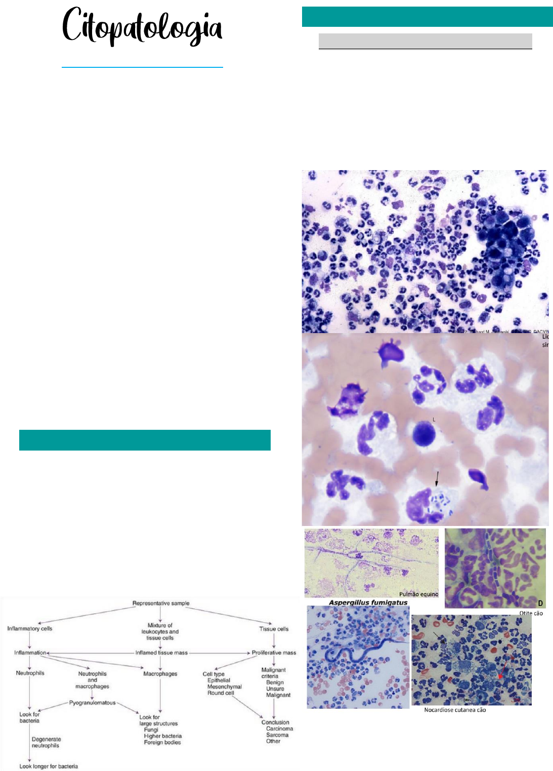 PATOLOGIA I MARIA EDUARDA MATTOS 1 CENÁRIOS INFLAMATÓRIOS A avaliação citológica de aspirados, impressões ou raspagens teciduais oferece uma avaliação rápida da patologia tecidual. É uma ferramenta de diagnóstico prático e de baixo custo na clínica. Oferece: → um diagnóstico; → auxilia no prognóstico; → direciona intervenções terapêuticas; → sugere testes diagnóstico adicionais; Precisa de: → Técnica de coleta adequada; → Preparação e coloração da lâmina; → Natureza e distribuição da lesão; → Habilidade/experiencia do citologista. Algumas lesões não podem ser diagnosticadas citologicamente, pois a arquitetura do tecido pode ser necessária para isso. Ou as células podem não esfoliar prontamente no caso de algumas lesões. Assim, a histopatologia se torna necessária. → Não diagnóstico: material mal coletado, nenhuma conclusão, isento de processo patológico; → Inflamação: 80% de leucócitos e PMN e MN; → Sem anormalidades citológicas; → Hiperplasia/displasia; → Neoplasia. SUPURATIVO SÉPTICO / NÃO SÉPTICO: → Séptico: comprometimento bacteriano; → Purulento: tem que ter 75% ou mais de neutrófilos degenerados ou não degenerados. → Presença de pus; → Necrose e/ou bactérias → Cariólise, cariorrexia e picnose CATEGORIAS DE INTERPRETAÇÃO CITOLÓGICA CLASSIFICAÇÃO DE RESPOSTAS INFLAMATÓRIAS PATOLOGIA I MARIA EDUARDA MATTOS 2 HISTIOCÍTICO / MACROFÁGICO OU GRANULOMATOSA: → Macrófagos epitelióides; → Células gigantes multinucleadas: que sugerem inflamação crônica; → Associado a reação a corpo estranho (células gigantes) ou micobacteriose. MISTO OU PIOGRANULOMATOSA: → Tanto supurativo quanto macrofágico; → Predomínio de neutrófilos, macrófagos, plasmócitos e linfócitos → Acontece quando as injúrias são persistentes (crônicas) e agudizam (se torna mais ativo e mais reativo causando uma demanda de leucócitos e neutrófilos que irão invadir o local); → Infecções fúngicas possuem o perfil piogranulomatoso. PATOLOGIA I MARIA EDUARDA MATTOS 3 EOSINOFÍLICO: → ≥ 20% de eosinófilos → Infecções fúngicas ou parasitárias; → Doenças alérgicas e imunomediadas, muita desgranulação de linfócitos, muita histamina; → Complexo granuloma eosinofílico; → Reações a corpo estranho; → Leucemia eosinofílica; → Mastocitomas e síndromes paraneoplásicas. LINFOCÍTICA OU LINFOPLASMOCITÁRIA → Predomínio de linfócitos ou de plasmócitos; → São incomuns; → Relacionados a hipersensibilidade do tipo IV e reação a corpo estranho; → Parte do granuloma é formado por um cordão de linfócitos e plasmócitos, por isso também é visto em casos de inflamação crônica.