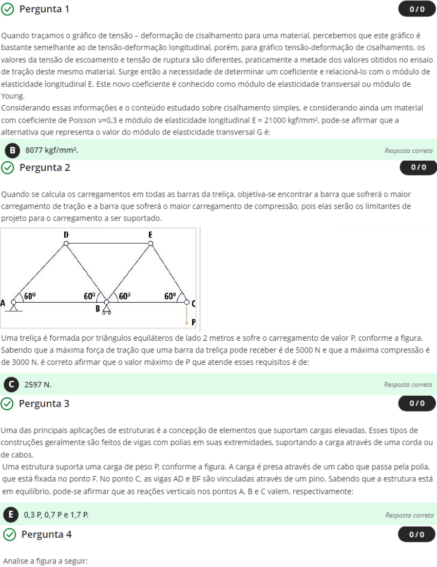 Fundamentos da Mecânica dos Sólidos e de Resistência dos Materiais Unidade 4 1ª Tentativa 2ª Tentativa 3ª Tentativa 4ª Tentativa 5ª Tentativa 6ª Tentativa 7ª Tentativa