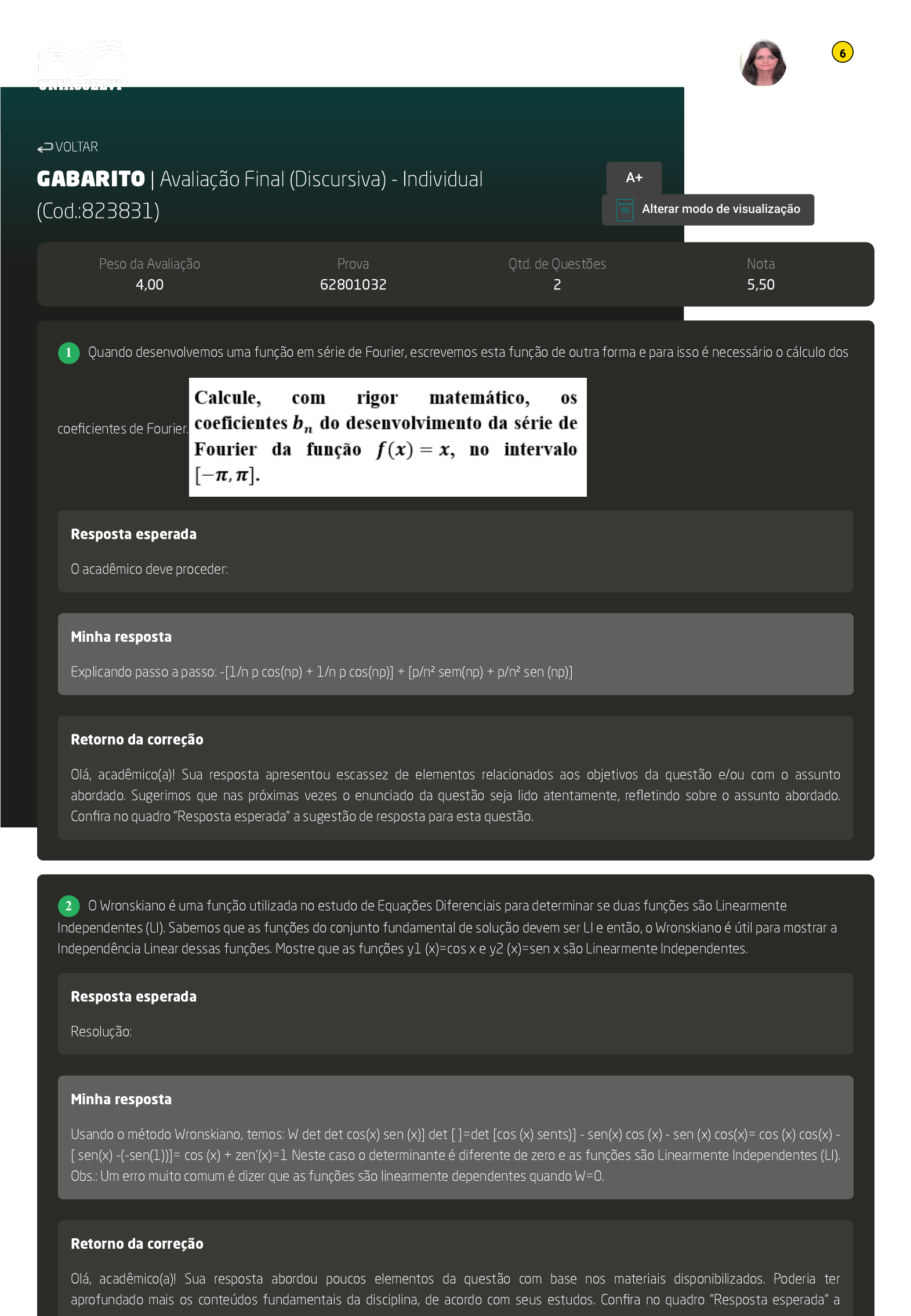 16/05/2023, 10:44 AVA https://ava2.uniasselvi.com.br/subject/grades-and-tests/answer-book/eyJ0ZXN0Ijp7InRlc3RDb2RlIjoiODIzODMxIiwiZGVzY3JpcHRpb24iOiJBdmFsaWHDp8OjbyBGaW5hbCAoRGlzY3Vyc2l2YSkgLSBJbmRpdmlkdW… 1/2 GABARITO | Avaliação Final (Discursiva) - Individual (Cod.:823831) Peso da Avaliação 4,00 Prova 62801032 Qtd. de Questões 2 Nota 5,50 Quando desenvolvemos uma função em série de Fourier, escrevemos esta função de outra forma e para isso é necessário o cálculo dos coeficientes de Fourier. Resposta esperada O acadêmico deve proceder: Minha resposta Explicando passo a passo: -[1/n p cos(np) + 1/n p cos(np)] + [p/n² sem(np) + p/n² sen (np)] Retorno da correção Olá, acadêmico(a)! Sua resposta apresentou escassez de elementos relacionados aos objetivos da questão e/ou com o assunto abordado. Sugerimos que nas próximas vezes o enunciado da questão seja lido atentamente, refletindo sobre o assunto abordado. Confira no quadro "Resposta esperada" a sugestão de resposta para esta questão. O Wronskiano é uma função utilizada no estudo de Equações Diferenciais para determinar se duas funções são Linearmente Independentes (LI). Sabemos que as funções do conjunto fundamental de solução devem ser LI e então, o Wronskiano é útil para mostrar a Independência Linear dessas funções. Mostre que as funções y1 (x)=cos x e y2 (x)=sen x são Linearmente Independentes. Resposta esperada Resolução: Minha resposta Usando o método Wronskiano, temos: W det det cos(x) sen (x)] det [ ]=det [cos (x) sents)] - sen(x) cos (x) - sen (x) cos(x)= cos (x) cos(x) - [ sen(x) -(-sen(1))]= cos (x) + zen'(x)=1 Neste caso o determinante é diferente de zero e as funções são Linearmente Independentes (LI). Obs.: Um erro muito comum é dizer que as funções são linearmente dependentes quando W=0. Retorno da correção Olá, acadêmico(a)! Sua resposta abordou poucos elementos da questão com base nos materiais disponibilizados. Poderia ter aprofundado mais os conteúdos fundamentais da disciplina, de acordo com seus estudos. Confira no quadro "Resposta esperada" a VOLTAR A+ Alterar modo de visualização 1 2 Cláudia Dieguez de Souza Matemática (2880042) 6 16/05/2023, 10:44 AVA https://ava2.uniasselvi.com.br/subject/grades-and-tests/answer-book/eyJ0ZXN0Ijp7InRlc3RDb2RlIjoiODIzODMxIiwiZGVzY3JpcHRpb24iOiJBdmFsaWHDp8OjbyBGaW5hbCAoRGlzY3Vyc2l2YSkgLSBJbmRpdmlkdW… 2/2 sugestão de resposta para esta questão. Imprimir Cláudia Dieguez de Souza Matemática (2880042) 6