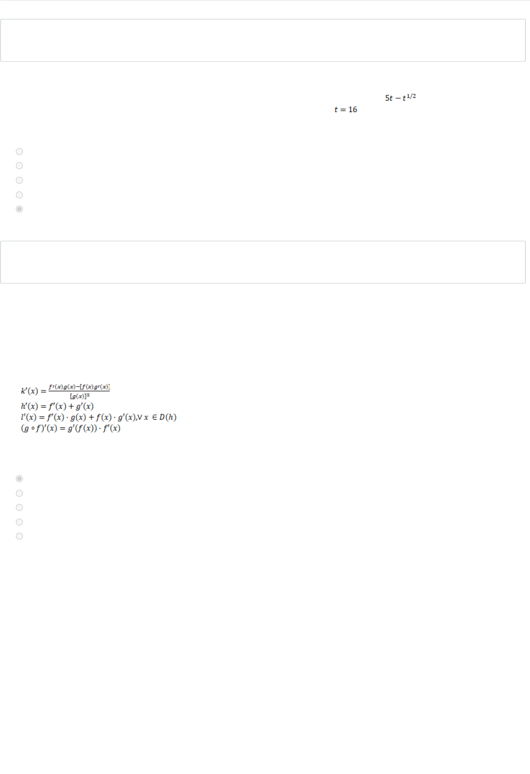 Avaliar 10,00 de um máximo de 10,00(100%) Questão 1 Correto Atingiu 1,00 de 1,00 Questão 2 Correto Atingiu 1,00 de 1,00 Um tanque contém um líquido que, por conta da válvula da saída estar com defeito, o líquido está gotejando em um recipiente. Por observação experimental, foi possível, através da modelagem matemática, verificar que após t horas, há litros no recipiente. Nesse contexto, encontre a taxa de gotejamento do líquido no recipiente, em litros/horas, quando horas. Após os cálculos, assinale a alternativa que indique o resultado encontrado. a. 5,525 litros/horas. b. 3,535 litros/horas. c. 8,125 litros/horas. d. 6,245 litros/horas. e. 4,875 litros/horas. Para derivar funções, é necessário conhecer e saber utilizar as suas regras operatórias: deriva da soma entre duas funções, derivada do produto entre duas ou mais funções, derivada do quociente entre duas funções, derivada da cadeia, para derivar as funções constantes. Neste contexto, associe tais regras com suas fórmulas: 1 - Derivada do Produto. 2 - Derivada do Quociente. 3 - Derivada da Soma. 4 - Derivada da Cadeia. ( ) ( ) ( ) ( ) A partir das relações feitas anteriormente, assinale a alternativa que apresenta a sequência correta. a. 2, 3, 1, 4. b. 3, 1, 2, 4. c. 3, 1, 4, 2. d. 4, 3, 2, 1. e. 1, 2, 3, 4. Questão 3 Correto Atingiu 1,00 de 1,00 Questão 4 Correto Atingiu 1,00 de 1,00 Questão 5 Correto Atingiu 1,00 de 1,00 Para derivar a função , é necessário conhecer a derivada da função polinomial e regras operatórias da derivada. No entanto, inicialmente, deve-se simplificar a função, utilizando as regras operatórias da potência: soma, produto e quociente. Nesse sentido, assinale a alternativa que indica qual o valor de a. b. c. d. e. Ao calcular limites, pode ocorrer uma indeterminação matemática do tipo 0/0. Nesse caso, para determinar o limite, devemos utilizar artifícios matemáticos para simplificar a função. Para funções racionais polinomiais de grau 2, é recomendável utilizar a fatoração do polinômio, através da regra prática em que . Assim, basta encontrar as raízes do polinômio por Bhaskara. Isso facilita bastante os cálculos. Nesse sentido, encontre o limite e assinale a alternativa que indique qual é o resultado obtido para o limite. a. -1. b. -2. c. 1. d. 0. e. 2. Existem funções que são definidas na forma implícita, ou seja, a variável dependente y não se apresenta explicitamente como A forma implícita pode ser representada como . Nem sempre é possível explicitar a variável y na expressão implícita, portanto, deve- se derivar a função dada na forma implícita. Nesse contexto, dada a função , definida implicitamente, assinale a alternativa que determine o valor de . a. . b. . c. . d. . e. . Questão 6 Correto Atingiu 1,00 de 1,00 Questão 7 Correto Atingiu 1,00 de 1,00 Numa avaliação, um professor solicitou que os alunos encontrassem a derivada da seguinte função racional polinomial: . Chamou a atenção do professor a resolução do aluno Paulo, que derivou a função uma vez e fez as afirmações descritas nas asserções I e II, a seguir. A partir do apresentado, analise as asserções I e II e a relação proposta entre elas. I. A derivada da função é igual Pois: II. para derivar nesse caso é necessário usar a regra do quociente. A seguir, assinale a alternativa correta. a. As asserções I e II são proposições verdadeiras, mas a II não é uma justificativa correta da I. b. A asserção I é uma proposição verdadeira, e a asserção II é uma proposição falsa. c. As asserções I e II são proposições falsas. d. A asserção I é uma proposição falsa, e a II é uma proposição verdadeira. e. As asserções I e II são proposições verdadeiras, e a II é uma justificativa correta da I. Seja a função espaço tempo , em que t representa o tempo. A velocidade média em um intervalo de tempo inicial ( e tempo final é dada por . A derivada de uma função aplicada em um ponto pode ser vista como uma taxa de variação instantânea. Na cinemática, dizemos que a função velocidade é a derivada da função espaço em relação ao tempo , enquanto que a aceleração é a derivada da função velocidade em relação ao tempo . Com essas informações, considere a seguinte situação problema: o deslocamento (em metros) de uma partícula, movendo-se ao longo de uma reta, é dado pela equação do movimento , em que t é medido em segundos. Neste contexto, analise as afirmativas a seguir: I. A velocidade média para o período de tempo que começa quando e é igual a 40,0 m/s. II. A velocidade instantânea quando é igual a . III. A aceleração é sempre constante. IV. A aceleração quando o tempo é é igual a . Assinale a alternativa que apresenta a(s) afirmativa(s) correta(s). a. I, II e III, apenas. b. I, II e IV, apenas. c. II e III, apenas. d. I, III e IV, apenas. e. II e IV, apenas. Questão 8 Correto Atingiu 1,00 de 1,00 Questão 9 Correto Atingiu 1,00 de 1,00 Em relação à derivada de uma função, podemos classificá-la da seguinte forma: funções contínuas não deriváveis, funções contínuas, que só admitem até 1ª derivada, funções contínuas, que só admitem até 2ª derivada e assim sucessivamente até a função de classe . Toda função polinomial racional é uma função de classe , ou seja admite as derivadas de todas as ordens. LIMA, E. L. Curso de análise. 9. ed. Rio de Janeiro: IMPA, 1999. v. 1. Nesse contexto, encontre a derivada da função , sabendo que , e assinale a alternativa que indique qual é o resultado obtido para . a. b. c. d. e. Quando a indeterminação do limite é igual a 0/0, e a função é racional polinomial, recomenda-se utilizar artifícios matemáticos para simplificar a função. Nesse caso de funções racionais polinomiais, utiliza-se a fatoração do polinômio através da regra prática de Ruffini para facilitar os cálculos. Nesse sentido, encontre 