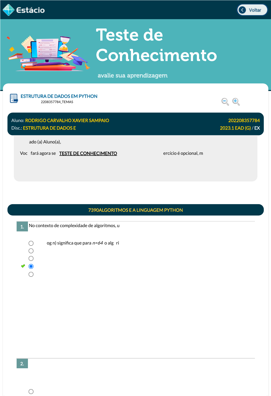 10/05/2023, 20:03 Estácio: Alunos https://simulado.estacio.br/alunos/ 1/5 Teste de Conhecimento avalie sua aprendizagem No contexto de complexidade de algoritmos, usualmente é utilizada a notação O para representar as complexidades assintóticas analisadas. Dentre as a�rmações a seguir, a correta é: A complexidade computacional é uma abstração para facilitar a comparação de algoritmos de forma independente do ambiente de execução e de variações na sua entrada. As complexidades podem ser representadas pelo número de operações requeridas. Dentre as seguintes complexidades de pior caso, representadas pelo seu número de operações, qual é a melhor? (menos operações) ESTRUTURA DE DADOS EM PYTHON Lupa DGT1335_202208357784_TEMAS Aluno: RODRIGO CARVALHO XAVIER SAMPAIO Matr.: 202208357784 Disc.: ESTRUTURA DE DADOS E 2023.1 EAD (G) / EX Prezado (a) Aluno(a), Você fará agora seu TESTE DE CONHECIMENTO! Lembre-se que este exercício é opcional, mas não valerá ponto para sua avaliação. O mesmo será composto de questões de múltipla escolha. Após responde cada questão, você terá acesso ao gabarito comentado e/ou à explicação da mesma. Aproveite para se familiarizar com este modelo de questões que será usado na sua AV e AVS. 7390ALGORITMOS E A LINGUAGEM PYTHON 1. c -O(log n) signi�ca que para n=64 o algoritmo realizará 6 operações no pior caso. O(n) signi�ca que as operações variam em proporção logarítmica à entrada. O(n) signi�ca que para n=50 o algoritmo realizará 50 operações no pior caso. O(n2) signi�ca que as operações variam em proporção quadrática à entrada. O(n) signi�ca que para n=50 o algoritmo executará no máximo 50 operações. Data Resp.: 10/05/2023 19:59:41 Explicação: Com o uso da notação O, simpli�camos o número de operações, ignorando multiplicadores constantes do termo dominante e todos os termos de menor complexidade. Por exemplo, 5n2+3 é O(n2), mas n2 também é O(n2). Dessa forma, não é possível calcular exatamente o número de operações quando se usa a notação O. Apenas podemos fazer a�rmações sobre a proporcionalidade ao tamanho da entrada n. Assim, a resposta correta é que O(n2) é proporcional ao quadrado da entrada. 2. nlog n + 500 javascript:voltar(); javascript:voltar(); javascript:diminui(); javascript:aumenta(); 10/05/2023, 20:03 Estácio: Alunos https://simulado.estacio.br/alunos/ 2/5 Um vetor está armazenado em memória no endereço-base 24. Considerando que uma palavra em memória ocupa 1 byte, e esse vetor é constituído por elementos que ocupam 4 palavras, qual é o endereço de memória ocupado pelos elementos de índices 2 e 50 respectivamente? . Uma Lista pode ser implementada de forma contígua ou encadeada. No caso de uma lista implementada de forma contígua, as complexidades de pior caso de busca, inserção e remoção são respectivamente: (nlog n)/2 100n + 5log n 2n 2n2 Data Resp.: 10/05/2023 19:59:49 Explicação: O conceito de complexidade é assintótico, ou seja, o que importa é quando o tamanho da entrada n cresce arbitrariamente. Por isso, os termos dominantes de cada resposta são os únicos relevantes. 500n é assintoticamente menor que n2, por exemplo, pois para n acima de 500 o quadrado de n será maior que 500n. Dessa forma podemos ordenar em forma crescente de complexidade os termos dominantes das respostas: n, nlog n, n2, 2n. O menor deles é n, logo a resposta correta é 100n+5log n. 3. 28 e 224 26 e 74 28 e 220 32 e 224 32 e 220 Data Resp.: 10/05/2023 20:02:54 Explicação: Para calcular o endereço absoluto em memória você deve utilizar a fórmula A=B+t*i . No caso B é o endereço base (24), t é o tamanho de cada elemento (4) e i é o índice do elemento (2 e 50). Aplicando a fórmula temos 32=24+2*4 e 224=24+50*4 7391LISTAS, PILHAS, FILAS E DEQUES 4. O(n), O(n) e O(1). O(log n), O(n) e O(n). O(n), O(n) e O(n). O(n), O(1) e O(n). O(1), O(n) e O(n). Data Resp.: 10/05/2023 19:59:59 Explicação: A busca é O(n) pois no pior caso você terá que percorrer toda a lista sequencialmente até encontrar o último elemento. Já a inserção, no seu pior caso, colocará um elemento no início da lista, obrigando todos os demais a serem deslocados uma posição, levando O(n) operações. A remoção também tem nesse seu pior caso, remover o primeiro elemento, o que obrigará todos os demais a serem ¿puxados¿ uma posição levando tempo O(n). 10/05/2023, 20:03 Estácio: Alunos https://simulado.estacio.br/alunos/ 3/5 Uma lista L em alocação contígua está armazenada em memória no endereço 32. L possui elementos de 2 bytes cada e no momento contém [10, 20, 30, 40] . Os elementos 5 e 50 serão inseridos em sequência. Em que endereços eles serão inseridos, respectivamente, caso a lista não seja ordenada, e caso a lista seja ordenada? Suponha que você está implementando um programa que precisa armazenar dados ordenados em uma estrutura para serem tratados posteriormente, na ordem inversa à que foram recebidos. Haverá uma grande quantidade de recebimentos e tratamento de dados, mas o tamanho esperado da estrutura não deve variar muito. Qual tipo de estrutura de dados é a melhor nessa situação? Seja a seguinte árvore, marque a opção correta que indica o porquê a árvore abaixo não é uma árvore binária de busca: Esse custo pode ser diminuído caso você implemente uma variável que indique o início da lista, mesmo assim, ao remover um elemento exatamente do meio da lista, você precisará mover n/2 elementos, o que ainda é um custo linear. 5. Não ordenada: 32, 34; ordenada: 32, 34. Não ordenada: 36, 37; ordenada: 32, 37. Não ordenada: 36, 37; ordenada: 32, 33. Não ordenada: 40, 42; ordenada: 40, 42. Não ordenada: 40, 42; ordenada: 32, 42. Data Resp.: 10/05/2023 20:00:06 Explicação: A inserção na lista não ordenada ocorre ao �nal da lista, o 5o elemento será inserido na posição L[4] ou seja endereço 32 + 4 * 2 = 40 .