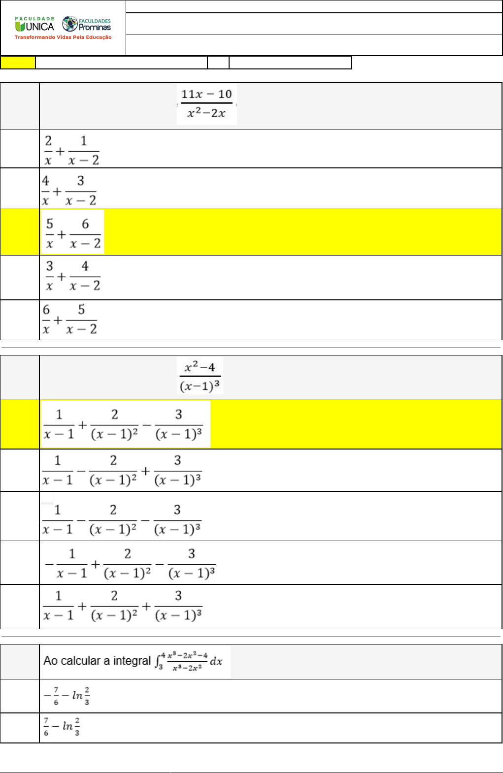 16/05/2023 15:33:32 1/3 REVISÃO DE SIMULADO Nome: ARNON ALVES DE OLIVEIRA Disciplina: Cálculo II Respostas corretas são marcadas em amarelo X Respostas marcardas por você. Questão 001 Ao decompor o quociente encontraremos : A) B) X C) D) E) Questão 002 Ao decompor o quociente encontraremos : X A) B) C) D) E) Questão 003 A) B) 16/05/2023 15:33:32 2/3 C) D) X E) Questão 004 A) B) X C) D) E) Questão 005 A) B) C) X D) E) Questão 006 Ao decompor o quociente encontraremos : A) B) X C) 16/05/2023 15:33:32 3/3 D) E) Questão 007 A) a ln | x + b | + c B) a ln | x - b | - c C) -a ln | x - b | - c D) a ln | x + b | - c X E) a ln | x - b | + c Questão 008 A) B) C) X D) E)