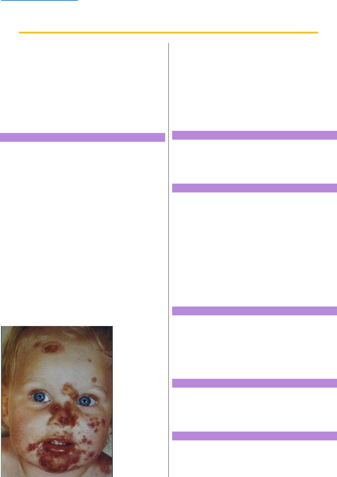Herbert.sdp10@uni9.edu.br 1 Dermatopatias mais frequentes em Pediatria Piodermites➔Impetigo (Impetigo não bolhoso e Bolhoso); Erisipela, Celulite. Dermatoses parasitárias da infância➔Escabiose, Escabiose Norueguesa, Pediculose. Dermatite de contato em crianças➔Dermatite de fraldas Dermatite seborreica Micose esporádicos➔Pitiríase Mecanismos de defesa da pele ▪ Características mecânicas da camada córnea ▪ pH baixo (3-5) dificultando a proliferação bacteriana ▪ Relativa sequidão da pele ▪ Secreção sebácea (ácidos graxos insaturados- ácido oleico) com propriedades antibacterianas ▪ Fenômeno de interferência bacteriana ▪ Imunidade humoral e celular -Staphylococcus não patogênico -Quem dá patologia de pele são estreptococos do grupo A, Staphylococcus aureus e gram negativos aeróbios. -Camada da pele: Córnea- proteção mecânica camada granular; camada espinhosa; camada basal -Toxinas agem em camadas específicas da pele. -Corpúsculo de dor -Agite o vaso linfático-linfedema, Linfangite e adenomegalia. -Hipoderme: -Impetigo é infecção de epiderme -Estrepto pyogenes, produz substâncias tóxicas que agem na camada espinhosa baixa. -Colonização da nasofaringe. -Os agentes mais frequentemente envolvidos nas infecções de pele são cocos Gram-positivos, Staphylococcus e o Streptococcus. -Staphylococcus é a bactéria predominante no Br nas infecções de pele. IMPETIGO -Infecção cutânea mais frequente em crianças de 2-5 anos, é causada por Staphylococcus aureus, Streptococcus pyogenes beta-hemolítico do grupo A ou menos comum bactérias anaeróbias. FATORES DE RISCO ➢ Clima quente e úmido ➢ Falta de higiene ➢ Dermatite atópica ➢ Trauma de pele ➢ Picada de insetos ➢ Outras condições que rompem a barreira cutânea provendo formas secundarias de impetigo. -Em infecção não complicada, o impetigo pode resolver espontaneamente em algumas semanas sem deixar cicatrizes, se não trata, no entanto, as lesões podem se espalhar (Autoinoculação). COMPLICAÇÕES • Disseminação local ou sistêmica • Celulite • Osteomielite • Artrite séptica • Pneumonia • Sepse COMPLICAÇÕES NÃO INFECCIOSAS ❖ Escarlatina ❖ Psoríase ❖ Glomerulonefrite pós-estreptocócica (Impetigo não bolhoso) FORMAS DE IMPETIGO Impetigo Não bolhoso (ou crostoso) Impetigo Bolhoso mailto:Herbert.sdp10@uni9.edu.br Herbert.sdp10@uni9.edu.br 2 -Diagnóstico de ambas são CLÍNICO, não é recomendado a cultura, a não ser que exista falha com terapêutica adequada, recorrências da lesos ou em pacientes com imunossupressão. IMPETIGO NÃO BOLHOSO (70%) • infecção de pele mais comum em crianças • mais em estações quentes e úmidas • lesões: máculas, pápulas, vesículas (até 1cm), pústulas, crostas melicérias (amarelada e aderida) • geralmente assintomáticos e sem sinais sistêmicos • + áreas expostas: membros, ao redor do nariz e boca. • agentes etiológicos: Streptococcus ß hem. grupo A e/ou Staphylococcus aureus (invasão secundária?) • diagnóstico: • clínico • em casos especiais: bacterioscópico e cultura da lesão • critérios de internação: toxemia, extensão do processo. -Afeta a face e extremidades, caracterizado por pápulas ou vesículas eritematosas que progridem para pústulas e depois crostas amareladas. OBS: Geralmente começa com uma única lesão maculopapular eritematoso que evolui rápido para vesícula. Essa vesícula, pode ser romper e o conteúdo seca e forma as crostas cor de mel, que é chamada de melicérias. -Lesões de 1 a 2 cm de diâmetro e crescem centrifugamente. -Lesões satélites por autoinoculação, promovida pelo ato da retirada das crostas pela criança no ato de coçar. -Linfadenopatia regional é comum e indicativa de que o agente é o Streptococcus; pode haver febre nos casos complicados. Tratamento ▪ cuidados locais e remoção de crostas ▪ antibiótico tópico (3x/dia por 5 dias): . mupirocina (Bactroban). Retapamulina (Altargo). bacitracina (Nebacetin, Cicatrene). ácido fusídico (Verutex) ▪ Antibiótico sistêmico: cefalosporinas, oxacilina (indicações de antibiótico sistêmico). -Antibiótico tópico, 3x ao dia durante 5 dias, mas em caso de quadro sistêmico, usar antibiótico sistêmico por via oral. Além da toxemia e extensão do quadro, qual a outra indicação de antibiótico sistêmico? -Impetigo pele-oral, tem que usar antibiótico sistêmico(cefalosporina) também, além do tópico. mailto:Herbert.sdp10@uni9.edu.br Herbert.sdp10@uni9.edu.br 3 Caso clínico Lactente de 7 meses, mãe refere alergia no “bumbum” há 3 dias que iniciou na região das fraldas. Refere surgimento de bolhas na evolução e agora está descamando. Fez uso de “Hipoglós” sem melhora e hoje apresentou febre de 38,2 graus. -Bolas -Impetigo bolhoso, base exantematosa-Acomete epiderme superficial. IMPETIGO BOLHOSO - Bolhas superficiais (até 3cm), secreção transparente a purulento - RN: +períneo e periumbilical - Crianças >s: + extremidades - Etiologia: Staphylococcus aureus fago grupo II (toxina epidermolítica A e B) - Age na desmogleína I (proteína desmossomal – adesão celular) -O impetigo bolhoso é causado EXCLUSIVAMENTE por S. aureus produtor de toxinas e representa uma forma localizada de Sd. da pele escaldada estafilocócica -Inicia com bolhas flácidas de paredes finas, superficiais e frágeis que se rompem facilmente, permanecendo uma erosão rasa eritematosa -Afeta frequentemente os RN, em geral após a 2°Semana de vida SINTOMAS ❖ Quadro sistêmico ❖ Febre ❖ Linfadenopatia -Sd. da pele escaldada-Patógeno no sangue. Epiderme Tratamento Limpeza delicada com remoção das crostas e restos cutâneos das bolhas. Higiene (água e sabão antisséptico) Limpeza constante das mãos, e cortar unhas. Antibiótico tópico-Mupirocina (3 x/ dia por 7 dias) ou Retapamulina (2 x/ dia por 5 dias) O tratamento sistêmico deve ser associado a terapia tópica e