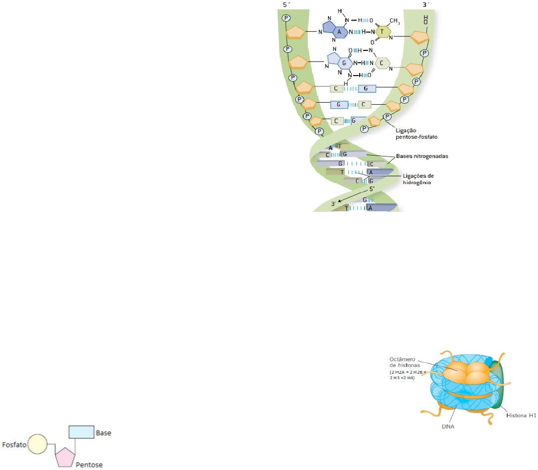 Estrutura e organização do material genético -UNIDADE 1 1.Ácidos nucleicos SÃO MOLÉCULAS INFORMACIONAIS QUE CONTROLAM OS PROCESSOS BÁSICOS DO METABOLISMO CELULAR, A SÍNTESE DE MACROMOLÉCULAS, DIFERENCIAÇÃO CELULAR E TRANSMISSÃO DA INFORMAÇÃO GENÉTICA DE UMA CÉLULAS PARA AS SUAS DESCENDENTES. •DNA: DEPÓSITO DA INFORMAÇÃO GENÉTICA •RNA: CODIFICAÇÃO GENÉTICA, E A DESCODIFICAÇÃO DURANTE A TRADUÇÃO DE PROTEÍNAS, REGULAÇÃO E EXPRESSÃO DOS GENES. OS ÁCIDOS NUCLEICOS (DNA E RNA) SÃO FORMADOS POR NUCLEOTÍDEOS: UM RESÍDUO DE ÁCIDOS FOSFÓRICO, UMA DESOXIRRIBOSE (DNA)/RIBOSE (RNA) E UMA BASE NITROGENADA. AS BASES NITROGENADAS SÃO DE DOIS TIPOS: •PÚRICAS: ADENINA (A) E GUANINA (G). •PIRIMÍDICAS: CITOSINA (C), TIMINA (T) PRESENTE SOMENTE NO DNA E URACILA (U) SOMENTE NO RNA. 1.1Ácido desoxirribonucleico (DNA) A MOLÉCULA DE DNA CONSISTE EM DUAS CADEIAS DE NUCLEOTÍDEOS (ANTIPARALELA, SENTIDO 5’ -> 3’) UNIDAS POR LIGAÇÕES DE HIDROGÊNIO ENTRE OS PARES DE BASES NITROGENADAS (A-T; C-G). 1.2Ácido ribonucleico (RNA) É FORMADO POR UMA ÚNICA CADEIA DE NUCLEOTÍDEOS. EXISTEM TRÊS TIPOS PRINCIPAIS DE RNA, ONDE ATUAM NA SÍNTESE PROTEICA: •RNA MENSAGEIRO (RNAm): CONTÉM A INFORMAÇÃO GENÉTICA (COPIADA DO DNA), QUE DETERMINA A SEQUÊNCIA DE AMINOÁCIDOS DA PROTEÍNA. •RNA DE TRANFERÊNCIA/TRANSPORTADOR (RNAt): IDENTIFICA E TRANSPORTA OS AMINOÁCIDOS ATÉ O RIBOSSOMO NO PROCESSO DE SÍNTESE PROTEICA. •RNA RIBOSSÔMICO (RNAr):ASSOCIADO A PROTEÍNA, COMPÕE O RIBOSSOMO, QUE GUIA A MONTAGEM DA CADEIA DE AMINOÁCIDOS PELOS RNAm E RNAt. 2.Compactação do DNA 2.1Cromatina A CROMATINA É UMA ESTRUTURA HELICOIDAL DE DUAS FITAS DE DNA. •O DNA ASSOCIADO COM AS HISTONAS (PROTEÍNAS) PARA FORMAR NUCLEOSSOMOS. •CADA NUCLEOSSOMO É COMPOSTO POR OITO PROTEÍNAS HISTONA AO REDOR DAS QUAIS O DNA SE ENROLA 1,65 VEZES. •OS NUCLEOSSOMOS SE DOBRAM PARA PRODUZIR UMA FIBRA DE 30NM (SOLENOIDE), QUE FORMA ALÇAS COM 300NM DE COMPRIMENTO EM MÉDIA. AS FIBRAS DE 300NM SÃO COMPRIMIDAS E DOBRADAS PARA PRODUZIR UMA FITA DE 250NM DE LARGURA. •O ENROLAMENTO APERTADO DA FIBRA DE 250NM PRODUZ A CROMÁTIDE DE UM CROMOSSOMO. A CROMATINA SE CONFIGURA EM ALÇAS MAIS CONDENSADAS (HETEROCROMATINA) TRANSCRICIONALMENTE INATIVA E MENOS CONDENSADAS (EUROCROMATINA) QUE TEM O DNA TRANSCRICIONALMENTE ATIVO. É NA FORMA DE CROMATINA ATIVA QUE O DNA SE EXPRESSA NA CÉLULAS, POIS NESSA FORMA ELE PODE SER TRNSCRITO NOS DIFERENTES TIPOS DE RNA. DURANTE A DIVISÃO CELULAR, A CROMATINA É CONDENSADA, FORMANDO UMA ESTRUTURA CHAMADA CROMOSSOMO. 2.2Cromossomos O GRAU MÁXIMO DE COMPACTAÇÃO DO DNA (CROMOSSOMO) É ATINGINDO NA FASE DA MITOSE DENOMINADA METÁFASE. A CROMATINA COMPACTADA DESSA FORMA NÃO PODE MAIS SER USADA COMO MOLDE PARA A SÍNTESE DE RNA, DE MODO QUE A TRANSCRIÇÃO CESSA DURANTE A MITOSE. O CROMOSSOMO METAFÁSICO É FORMADO POR UM ESQUELETO CENTRAL DE PROTEÍNAS NÃO HISTÔNICAS, AO QUAL A FIBRA CROMATÍNICADE 30NM SE ASSOCIAS COMO ALÇAS. PERTENCEM A ESSE ESQUELETO PROTEICO AS CONDENSINAS. AS CONDENSINAS SE ASSOCIAM EM DÍMEROS QUE, POR SUA VEZ, SE ASSOCIAM À FIBRA DE CROMATINA, COMPACTANDO-A. A DUPLICAÇÃO DO DNA FAZ COM QUE A CÉLULA ENTRE EM DIVISÃO, LOGO, O CROMOSSOMO METAFÁSICO É COMPOSTO POR DUAS MOLÉCULAS DE DNA, CADA QUAL PRESENTE EM UMA DAS DUAS CROMÁTIDES QUE CONSTITUEM O CROMOSSOMO. CADA CROMÁTIDE É RESULTANTE DA COMPACTÇÃO DA FIBRA CROMATÍNICA DE 30NM. A PARTICIPAÇÃO DE DÍMEROS DE PROTEÍNAS NÃO HISTONAS, DENOMINADAS COESINA, AS DUAS CROMÁTIDES DE UM CROMOSSOMO SE UNEM POR MEIO DE UMA REGIÃO DE ESTRANGULAMENTO, DENOMINADA CONSTRIÇÃO PRIMÁRIA OU CENTRÔMERO. A POSIÇÃO DO CENTRÔMERO PERMITE A CLASSIFICAÇÃO MORFOLÓGICA: 1.METACÊNTRICOS: CENTRÔMERO EM UMA POSIÇÃO MAIS OU MENOS CENTRAL, DE MODO QUE AS CROMÁTIDES TÊM BRAÇOS DE MESMO TAMANHO. 2.SUBMETACÊNTRICOS: CENTRÔMERO DESLOCADO DO CENTRO, AS CROMÁTIDES TÊM UM BRAÇO CURTO E UM LONGO. 3.ACROCÊNTRICOS: CENTRÔMERO SUBTERMINAL, DESLOCADO PARA UMA DAS EXTREMIDADES, OS BRAÇOS CURTOS DAS CROMÁTIDES SÃO MUITO PEQUENOS. 4.TELOCÊNTRICOS: CENTRÔMERO TERMINAL, AS CROMÁTIDES TÊM APENAS BRAÇOS LONGOS (NÃO ENCONTRADOS NA ESPÉCIE HUMANA). NAS EXTREMIDADES DO CROMOSSOMO METAFÁSICO, SÃO ENCONTRADAS SEQUÊNCIAS REPETITIVAS DE DNA, OS TELÔMEROS. OS TELÔMEROS MANTÊM A ESTABILIDADE DOS CROMOSSOMOS, IMPEDINDO A SUA ADESÃO. 2.3Organição cromossômica do genoma humano AS CÉLULAS HUMANA CONTÊM 46 MOLÉCULAS DE DNA, CONSEQUENTEMENTE, 46 CROMOSSOMOS, OS QUAIS CONSTAM DE 23 PARES, SENDO QUE 22 DELES ESTÃO PRESENTES TANTO NA MULHER COMO NO HOMEM E RECEBEM O NOME DE AUTOSSOMOS OU AUTOSSÔMICOS. O PAR RESTANTE, CONHECIDO COMO PAR SEXUAL, NA MULHER, É COMPOSTO POR DOIS CROMOSSOMOS IDÊNTICOS, OS CROMOSSOMOS X, E NO HOMEM, POR DOIS CROMOSSOMOS, O X E UM PEQUENO CROMOSSOMO Y. O CONJUNTO COMPLETO DE CROMOSSOMOS DE UM ORGANISMO É CHAMADO DE CARIÓTIPO. CADA CROMOSSOMO CARREGA UM SUBCONJUNTO DE GENES QUE SÃO ARRANJADOS LINEARMENTE AO LONGO DO DNA. OS MEMBROS DE UM PAR DE CROMOSSOMOS (CROMOSSOMOS HOMÓLOGOS) CARREGAM INFORMAÇÕES GENÉTICAS EQUIVALENTES, ISTO É, ELES POSSUEM OS MESMOS GENES NA MESMA SEQUÊNCIA. EM QUALQUER LOCUS (LOCALIZAÇÃO FÍSICA DE UM GENE EM UM CROMOSSOMO) ESPECÍFICO, NO ENTANTO, ELES PODEM TER FORMAS IDÊNTICAS OU LEVEMENTE DIFERENTES NO MESMO GENE, CHAMADOS DE ALELOS. 3.Expressão gênica A INFORMAÇÃO CODIFICADA NO GENOMA É UTILIZADA PARA ESPECIFICAR FUNÇÕES CELULARES, NA FORMA DE PROTEÍNAS. A LIGAÇÃO MOLECULAR ENTRE O CÓDIGO GENÉTICO DOS GENES E O CÓDIGO DE AMINOÁCIDOS DAS PROTEÍNAS É O RNA. 3.1Duplicação do DNA A DUPLICAÇÃO OU REPLICAÇÃO DO DNA, É O PROCESSO DE SÍNTESE DE DUAS MOLÉCULAS DE DNA IDÊNTICAS ENTRE SI A PARTIR DE UMA MOLÉCULA DE DNA MOLDE. OCORRE SOMENTE SE AS CÉLULAS FOR SE DIVIDIR E É PRIMORDIAL PARA QUE CADA CÉLULA-FILHA CONTENHA TODO O MATERIAL GENÉTICO QUE ESTAVA PRESENTE NA CÉLULA-MÃE, SEM ALTERAÇÕES. ESSE PROC