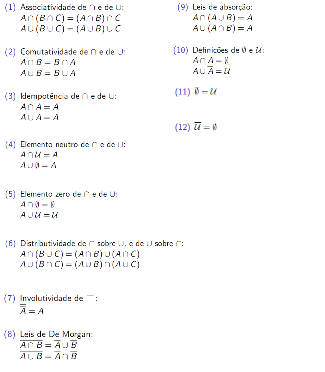 Matemática Discreta 2011.2/Álgebra de Conjuntos/Provas Algébricas Identidades Básicas Envolvendo Conjuntos Existem muitas igualdades entre conjuntos envolvendo as operações de união, interseção, diferença e complementação que são verdadeiras para todos os subconjuntos de um dado conjunto U. Como elas são independentes dos subconjuntos particulares utilizados, essas igualdades são chamadas identidades básicas envolvendo conjuntos. A seguir listamos algumas dessas identidades básicas: 1 Matemática Discreta 2011.2/Álgebra de Conjuntos/Provas Algébricas Relembremos outras propriedades básicas da Igualdade (para quaisquer conjuntos A, B, C). (1) Reflexividade: A=A. (2) Simetria: Se A=B então B=A. (3) Transitividade: Se A=B e B=C então A=C. (4) Substitutividade: Se A=B então se substituirmos qualquer ocorrência de A por uma ocorrência de B em uma expressão, esta continuará sendo verdadeira Exemplo de (4): Se A=B então A∩C=B∩C Relembremos algumas propriedades básicas da inclusão (para quaisquer conjuntos A, B, C). (1) Reflexividade:A A. (2) Antissimetria: Se A B e B A então A=B. (3) Transitividade: Se A B e B C então A C. (4) A∩B A (5) A AUB 2