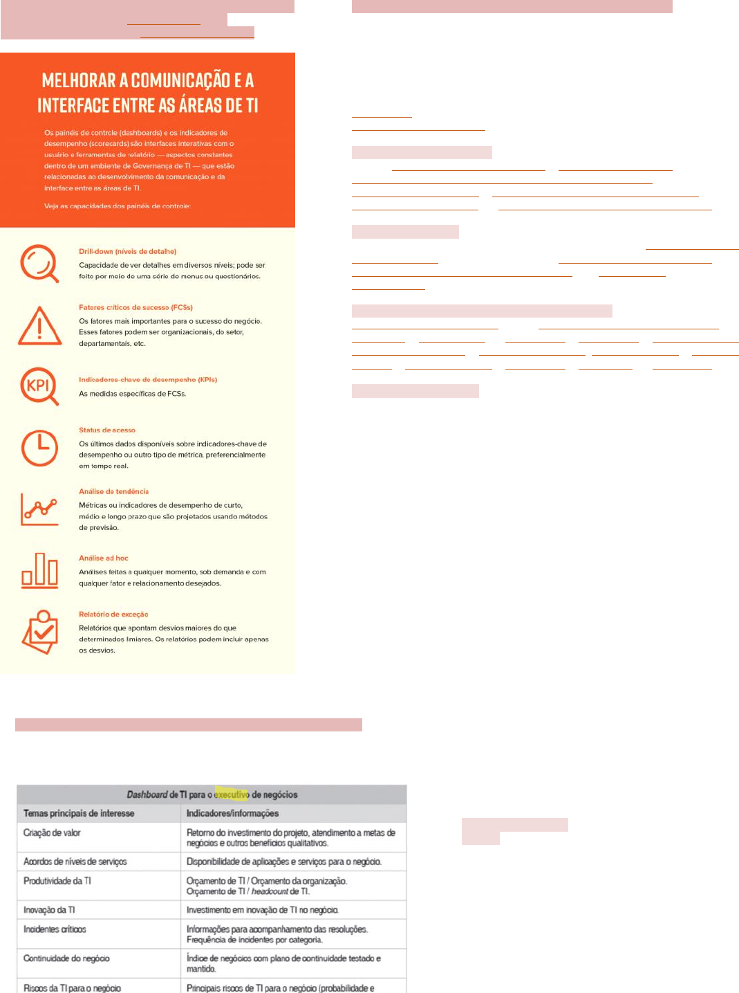 Recursos tecnológicos que são utilizados no desenvolvimento da comunicação e, consequentemente, na Governança de TI. Recursos para a comunicação entre as áreas de TI A comunicação é crítica para a governança de TI. Portanto, a comunicação, além de ser imperativa para a tomada de decisão, também é um meio de a TI fazer o seu marketing e mudar essa percepção. A forma mais eficiente de comunicação do desempenho é um dashboard (painéis de controle) que permita ao executivo consultar e entender, de forma rápida, o desempenho da TI. Executivos de negócio: São preocupados com informações sobre retorno do investimento, níveis de serviço, benefícios dos projetos e serviços ao negócio, produtividade da TI, informações sobre tratamento de incidentes críticos e status de projetos prioritários. Governança de TI: As informações tratadas estão relacionadas à sua função, que é promover o alinhamento da TI ao negócio, a compliance, o gerenciamento de riscos, o monitoramento da entrega de valor, o desempenho e a comunicação. Executivos de cada área funcional da TI: Têm preocupações estratégicas e táticas como administração dos níveis de serviços, incidentes e problemas, orçamento, gerenciamento da sua estratégia, recursos humanos, fornecedores, demanda, custos, produtividade, qualidade, inovação e processos… Balanced scorecard → É uma técnica de planejamento empresarial, que facilita o alinhamento das iniciativas(projetos, ações, serviços) de TI aos objetivos estratégicos do negócio, considerando 4 perspectivas: Financeira;1. Cliente (usuário);2. Processos internos (gestão de projetos, desenvolvimento, gestão de incidentes,…) 3. Aprendizagem e crescimento.4. Como a tecnologia auxilia nos processos empresariais O que deve ser informado em cada dashboard? Para os executivos de negócios: Tipo do dashboard → Estratégico; Visões → Não são necessárias visões do tipo BSC (balanced scorecard) Melhorar a comunicação e a interface entre as áreas de TI sexta-feira, 12 de maio de 2023 16:29 Página 1 de Semana 2 Para os executivos de negócios: Tipo do dashboard → Estratégico; Visões → Não são necessárias visões do tipo BSC (balanced scorecard) Para a governança de TI: Tipo do dashboard → Estratégico e analítico. Visões → São necessárias visões de BSC, assim como capacidade de drill-downs, tendo em vista a necessidade de análise. Para os gestores de TI: Tipo do dashboard → Estratégico e analítico; Visões → São necessárias visões de BSC, assim como capacidade de drill-downs. Para os CIOs: Página 2 de Semana 2 Para os CIOs: Tipo do dashboard → Estratégico; Visões → São necessárias visões de BSC, assim como a execução de drill-downs específicos. Aspectos fundamentais para uma comunicação harmoniosa entre as áreas de TI Os administradores utilizam ferramentas de TI com o objetivo estratégico e para planejar e alcançar 3 objetivos: Aumentar a continuidade(integração funcional, automação intensificada, resposta rápida); 1. Melhorar o controle (precisão, acuidade, previsibilidade, consistência, certeza); 2. Proporcionar maior compreensão das funções produtivas (visibilidade, análise, síntese). 3. A comunicação pode conter alguns componentes: Elementos → A estrutura comunicacional possui 4 características: Emissor: está ligado à organização, é quem inicia a mensagem. ○ Meio ou canal pelo qual é transmitida a mensagem.○ Receptor: Público interno, a quem a mensagem é dirigida. ○ Respostas ou feedback: São os resultados obtidos.○ ▪ Obstáculos → Ruídos ou erros de decodificação.▪ Canais informais → Representam a rede de comunicação, não oficial, que complementa os canais formais. ▪ Veículos de comunicação interna → Tem como função transmitir aos funcionários mudanças operacionais e estratégias feitas na empresa, informações administrativas, ações da empresa… ▪ Questões: Dentro do contexto corporativo temos diversos processos ocorrendo simultaneamente. Assinale a alternativa que traz os principais pilares desse contexto e que também estão envolvidos com a comunicação existente entre as diferentes áreas. 1. As pessoas, as atividades e a tecnologia. São os pilares mais importantes pois trazem consigo a mão de obra, os processos e ferramentas para executar todas as atividades da empresa. Executivos, Governança de TI, governança corporativa. Podemos citá-los como aspectos fundamentais para uma Página 3 de Semana 2 Podemos citá-los como aspectos fundamentais para uma empresa, porém, não para a comunicação, tendo em vista que não são meios de comunicação, e sim participam da comunicação existente referente aos processos da empresa. Dashboard, documentação, scorecards. São meios de comunicar aos envolvidos nos processos dados importantes referentes a execução das atividades. Gestão de TI, executivos e Governança de TI. São aspectos do contexto, porém não trazem outros fatores que também fazem parte de uma empresa, como processos, recursos pessoais, dentre outros. Documentação, scorecards e executivos. São aspectos importantes para uma empresa, porém não abrangem todas as áreas, as quais são primordiais para que tudo seja executado de maneira harmoniosa. Estes aspectos trazem apenas questões de exposição de dados e são responsáveis pelos principais comandos dentro da empresa. A comunicação é primordial para que haja um relacionamento dentro de uma sociedade, e no âmbito dos negócios é importante para que haja compreensão dos processos que devem ser executados por aqueles que estão envolvidos na produção. Assinale a alternativa que traz uma maneira eficiente de realizar o tipo de comunicação sobre o desempenho. 2. Dashboard. Permite que o executivo ou qualquer outro membro da empresa consulte e entenda de maneira prática e rápida as informações sobre determinado contex