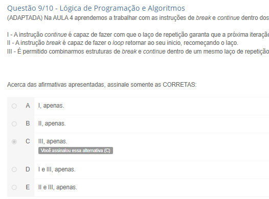 Na AULA 4 aprendemos a trabalhar com as instruções de break e continue dentro dos I - - A instrução continue é capaz de fazer com que 0 laço de repetição garanta que a próxima iteração II - - A instrução break é capaz de fazer 0 loop retornar ao seu inicio, recomeçando 0 laço. III - - É permitido combinarmos estruturas de break e continue dentro de um mesmo laço de repetição Acerca das afirmativas assinale somente as CORRETAS: