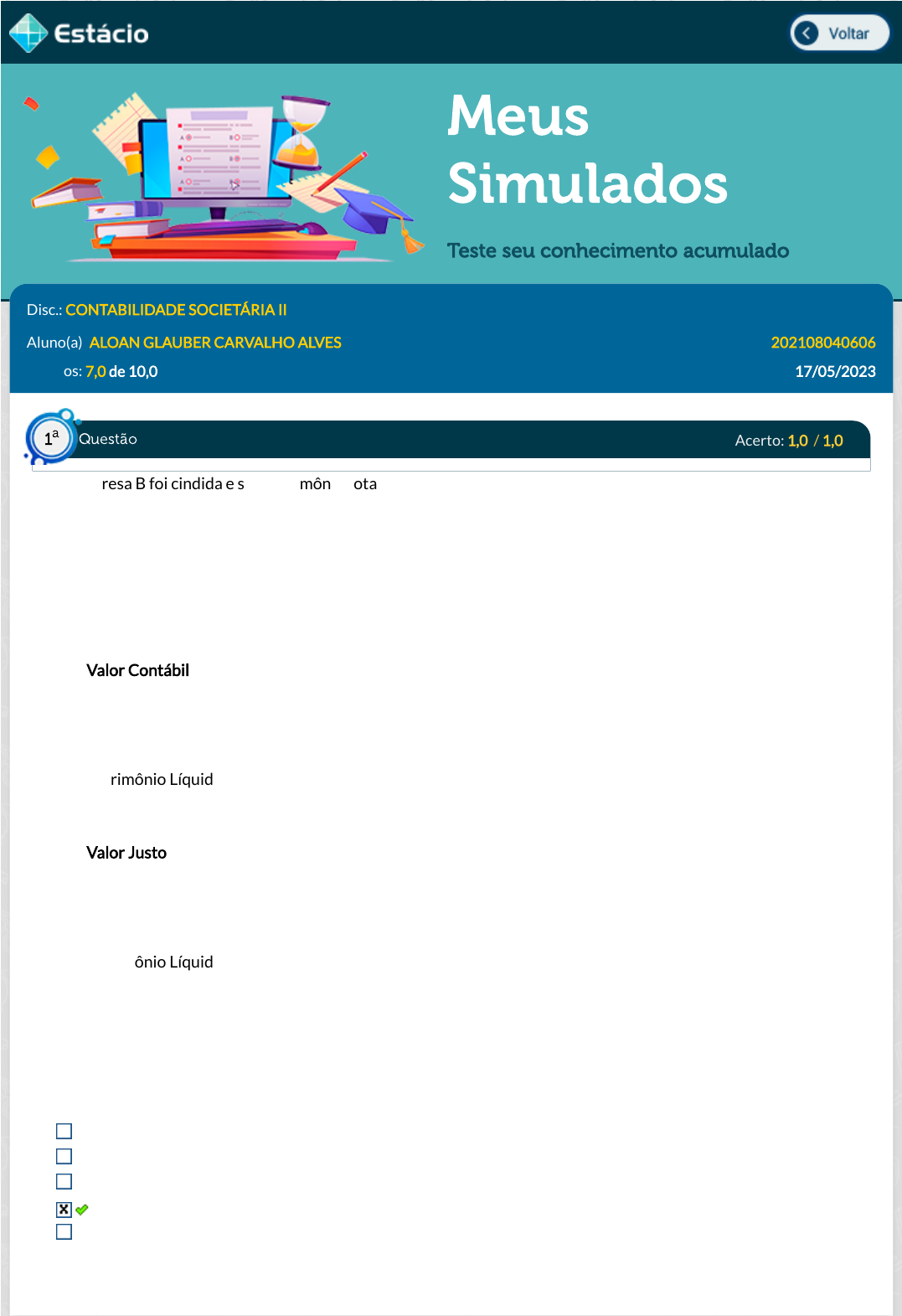 17/05/23, 15:09 Estácio: Alunos https://simulado.estacio.br/alunos/ 1/7 Meus Simulados Teste seu conhecimento acumulado Disc.: CONTABILIDADE SOCIETÁRIA II Aluno(a): ALOAN GLAUBER CARVALHO ALVES 202108040606 Acertos: 7,0 de 10,0 17/05/2023 Acerto: 1,0 / 1,0 A empresa B foi cindida e seu patrimônio total foi para uma nova empresa - a empresa C, ao qual foi criada para recebê-la. Diante dessa situação se levantou o valor contábil e o valor justo referente as contas da empresa cindida e os saldos são apresentados a seguir. Valor Contábil Ativo R$ 1.000 Passivo R$ 200 Patrimônio Líquido R$ 800 Valor Justo Ativo R$ 1.500 Passivo R$ 200 Patrimônio Líquido R$ 1.300 De acordo com os dados apresentados da empresa cindida e considerando que a operação se enquadra na NBC TG15, assinale a alternativa que corresponde o valor a ser registrado como Passivo na nova empresa. 500 1.300 1.500 200 1.000 Respondido em 17/05/2023 14:46:06 Questão1 a https://simulado.estacio.br/alunos/inicio.asp javascript:voltar(); 17/05/23, 15:09 Estácio: Alunos https://simulado.estacio.br/alunos/ 2/7 Explicação: Quando uma empresa é cindida e sua operação é considerada uma combinação de negócios, ou seja, é possível utilizar a NBC TG 15 o valor a ser lançado será o valor justo. Logo, nessa situação o valor do passivo a ser registrado na nova empresa será de R$ 200. Acerto: 1,0 / 1,0 (CESGRANRIO, 2015). Uma Sociedade Anônima de médio porte, por decisão unânime dos acionistas, aprovou a mudança da forma de sua constituição societária, passando de Sociedade Anônima para Sociedade de Responsabilidade Limitada, atendendo a todas as determinações legais que regem a matéria e regulam a constituição e o registro de sociedades nos órgãos competentes. A mudança aprovada pelos acionistas indica que ocorreu uma operação de modi�cação societária denominada: fusão. transformação. cisão parcial. incorporação. cisão total. Respondido em 17/05/2023 14:46:29 Explicação: Transformação representa quando a empresa realiza alteração no seu tipo jurídico, independente de liquidação e dissolução. Acerto: 1,0 / 1,0 Os pedidos de falências e recuperações judiciais aumentaram em abril, na comparação com março. E a avaliação é que o volume de processos deverá disparar nos próximos meses, diante da perspectiva de um forte tombo da economia brasileira e mundial em 2020 e das di�culdades �nanceiras das empresas em meio à pandemia de coronavírus. Disponível em: https://g1.globo.com/economia/noticia/2020/05/19/pedidos-de-recuperacao-judicial-e- falencia-crescem-no-pais-e-atingem-mais-as-pequenas-empresas.ghtml. Acesso em: 28 janeiro de 2022. Diante das informações apresentadas na reportagem assinale a alternativa que representa corretamente o tipo de dissolução referente a falência. Dissolução por término do prazo de vigência. Dissolução por incorporação. Dissolução por decisão administrativa. Dissolução por decisão judicial. Dissolução de pleno direito. Respondido em 17/05/2023 14:52:35 Explicação: Dissolução por decisão judicial ocorre decorrente de decisão judicial, como falência. Questão2 a Questão3 a 17/05/23, 15:09 Estácio: Alunos https://simulado.estacio.br/alunos/ 3/7 Acerto: 0,0 / 1,0 (COPS-UEL, 2012 - adaptada). De acordo com a NBC TG 36 "a controladora deve elaborar demonstrações consolidadas utilizando políticas contábeis uniformes para transações similares e outros eventos em circunstâncias similares". Disponível em: https://www1.cfc.org.br/sisweb/SRE/docs/NBCTG36(R3).pdf. Acesso em 30/01/2022. Sendo assim, quando do procedimento de consolidação das demonstrações contábeis, a participação dos não controladores deve ser apresentada no balanço patrimonial consolidado dentro do passivo não circulante, separadamente do exigível a longo prazo da controladora e da controlada. patrimônio líquido, conjuntamente com o patrimônio líquido dos proprietários da controladora. patrimônio líquido, separadamente do patrimônio líquido dos proprietários da controladora. passivo não circulante, separadamente do patrimônio líquido dos proprietários da controladora. passivo circulante, separadamente do patrimônio líquido dos proprietários da controladora. Respondido em 17/05/2023 15:15:48 Explicação: Quando do procedimento de consolidação das demonstrações contábeis, a participação dos não controladores deve ser apresentada no balanço patrimonial consolidado dentro do patrimônio líquido, separadamente do patrimônio líquido dos proprietários da controladora. Alternativa correta: "patrimônio líquido, separadamente do patrimônio líquido dos proprietários da controladora." Acerto: 1,0 / 1,0 (FUNDATEC, 2014). A Joia do Nilo, encerrou o ano de 2011 apresentando os seguintes valores em seu ativo: Caixa e Equivalentes de Caixa .................R$ 80.000,00 Clientes ¿ Terceiros ................................R$ 250.000,00 Clientes ¿ Subsidiária ..............................R$ 150.000,00 Estoques ................................................R$ 100.000,00 Investimentos em Subsidiária ..................R$ 225.000,00 Imobilizado ............................................R$ 400.000,00 TOTAL DO ATIVO............................. R$ 1.205.000,00 Sabe-se que a empresa possui uma subsidiária integral que encerrou o ano de 31/dez/2011 com os seguintes saldos. Caixa e Equivalentes de Caixa .............R$ 50.000,00 Clientes ¿ Terceiros .............................R$ 150.000,00 Questão4 a Questão5 a 17/05/23, 15:09 Estácio: Alunos https://simulado.estacio.br/alunos/ 4/7 Estoques............................................. R$ 40.000,00 Imobilizado......................................... R$ 400.000,00 TOTAL DO ATIVO............................ R$ 640.000,00 Sabendo que a empresa Joia do Nilo irá consolidar seu ativo com o da subsidiária, podemos a�rmar que para �ns de consolidação ser