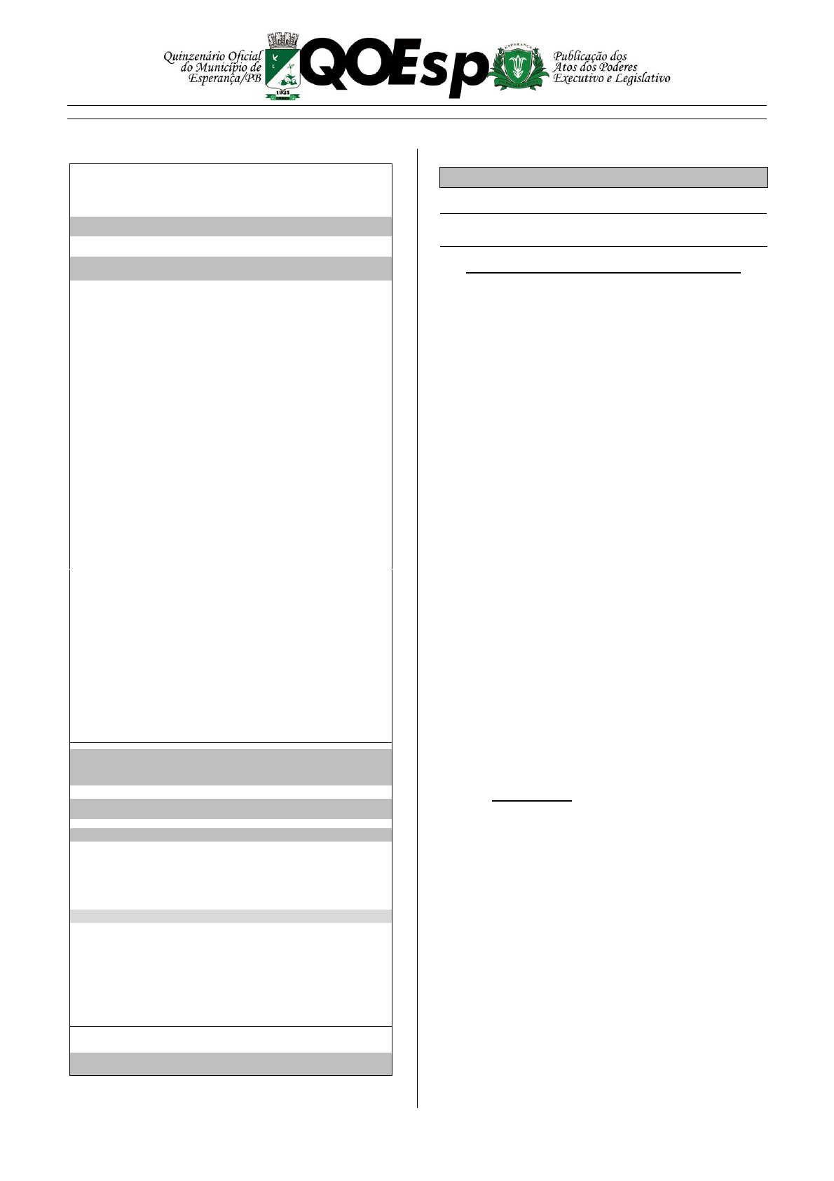 EXTRA • EXTRA • EXTRA • EXTRA • EXTRA • EXTRA • EXTRA • EXTRA • EXTRA • EXTRA • EXTRA • EXTRA • EXTRA • EXTRA • EXTRA • EXTRA • EXTRA • EXTRA • EXTRA • EXTRA • EXTRA • EXTRA • EXTRA Criada pela Lei nº 285 de 08/05/1974 • Reformulada pela Lei nº 291 de 26/05/2017 • Ano VI • Terça-feira, 16 de maio de 2023. 1 E X P E D I E N T E • PREFEITURA MUNICIPAL DE ESPERANÇA • 98º Ano da Emancipação Política do Município • PODER EXECUTIVO • PREFEITO NÓBSON PEDRO DE ALMEIDA VICE-PREFEITO EDMILSON LOPES DE MORAIS CHEFE DE GABINETE IGOR DELGADO DE ALMEIDA PROCURADOR-GERAL CHRISTENSON DIEGO VIRGOLINO SECRETÁRIA DE ADMINISTRAÇÃO ÂNGELA MARIA LIRA DE SOUZA SALES ROCHA SECRETÁRIO MUNICIPAL DE AGRICULTURA, RECURSOS HÍDRICOS E MEIO AMBIENTE THIAGO DE ASSIS MORAES SECRETÁRIA DE ASSISTÊNCIA E SERVIÇO SOCIAL TAIANA HONORATO GRANGEIRO SECRETÁRIO DE COMUNICAÇÃO, EVENTOS E TURISMO ALANNA MARIA PASSOS MEIRA DE ALMEIDA SECRETÁRIO DE EDUCAÇÃO, CULTURA E DESPORTO MICHAEL LOPES DA SILVA SECRETÁRIA MUNICIPAL DE ESPORTES E LAZER/SECMEL JOELMIR DA CUNHA RIBEIRO SECRETÁRIO DE FINANÇAS EMERSON DAVID ALVES DA COSTA SECRETÁRIO DE OBRAS, URBANISMO E TRANSPORTES PAULO SÉRGIO BARROS SECRETÁRIO DE PLANEJAMENTO AUDALÉCIO ANTONIO BEZERRA NÓBREGA SECRETÁRIA DE SAÚDE CECÍLIA ALEXANDRE DE OLIVEIRA ALMEIDA AUTARQUIA MUNICIPAL FUNPREVE PRESIDENTE: CAMILA DE OLIVEIRA CUNHA COELHO DA COSTA HOSPITAL MUNICIPAL “DR. MANUEL CABRAL DE ANDRADE” DIRETORA GERAL: MARIA DE FÁTIMA ARAÚJO SOARES Prefeitura Municipal de Esperança – Paraíba Rua Antenor Navarro, 837 - Lírio Verde - CEP 58.135.000. Fone: (83) 3502-1305 Site: www.esperanca.pb.gov.br | E-mail: prefeitura@esperanca.pb.gov.br • CÂMARA MUNICIPAL DE ESPERANÇA • “Casa de Francisco Bezerra da Silva” • PODER LEGISLATIVO • MESA DIRETORA - BIÊNIO 2023/2024 18ª Legislatura: 2021/2024 | 3ª Sessão Legislativa: 2023 RAQUEL NÚBIA GOMES SILVA (Progressistas) PRESIDENTE ADÍLIO MAIA DA SILVA (Progressistas) VICE-PRESIDENTE CARLOS ANDRÉ DE ALMEIDA (Progressistas) 1º SECRETÁRIO GENIVAL DE ANDRADE (Progressistas) 2º SECRETÁRIO DEMAIS VEREADORES ADEILSON DOS SANTOS ADIJAILSON COSTA CARLOS LUIZ DE ARRUDA CÂMARA JOELSON DIAS DE MELO JOSÉ ADEILTON DA SILVA MORENO LEONARDO BRONZEADO VIEIRA TEIXEIRA NAHIM GALILEU DOS SANTOS CAVALCANTE NIELLY DOS SANTOS DIAS RODRIGO ALVES (Progressistas) (Progressistas) (PSC) (Progressistas) (PSC) (PSC) (Progressistas) (PSC) (Progressistas) F I N A L I Z A Ç Ã O • SECRETARIA DE ADMINISTRAÇÃO • SEÇÃO I – ATOS DO PODER EXECUTIVO GABINETE | PROCURADORIA GERAL DECRETOS DECRETO Nº 2.161, DE 31 DE MARÇO DE 2023. DISPÕE SOBRE A HOMOLOGAÇÃO DO RESULTADO FINAL DOS CLASSIFICADOS E APROVADOS DO CONCURSO PÚBLICO Nº 0001/2022/2023 E DÁ OUTRAS PROVIDÊNCIAS. O PREFEITO DO MUNICÍPIO DE ESPERANÇA/PB no uso de suas atribuições que lhe são conferidas pela Lei Orgânica Municipal e de acordo com a legislação federal, estadual e municipal, e nas Leis Complementares Municipais nº 03/91, 11/94, 23/98, 24/00, 32/02, 43/07, 86/2019, 96/2022 e Leis Ordinárias Municipais nº 1.238/07, 85/12, 296/2017, 316/2018, 450/2021, Edital de Concurso Público nº 001/2022 de 10 de outubro de 2022: CONSIDERANDO a conclusão dos serviços de operacionalização e execução das fases do Concurso Público nº 001/2022/2023 e a regularidade formal dos procedimentos adotados e regrados no Edital e daqueles que compõem o processo relativo ao Concurso Público nº 001, de 10 de outubro de 2022; CONSIDERANDO que em todo o processo do Concurso Público se obedeceu às vinculações ao Edital e às normas de Direito aplicáveis à matéria, tanto na defesa do interesse público, quanto na defesa dos interesses dos concorrentes; CONSIDERANDO que em todas as fases do Concurso Público houve o respeito à garantia do direito de defesa e do contraditório das decisões adotadas e estas mereceram ampla publicidade; CONSIDERANDO o término do prazo para a interposição de recursos em face dos resultados das provas, do resultado final e da classificação; D E C R E T A: Art. 1º Fica homologado o Concurso Público do município de Esperança-PB, para os cargos de nível fundamental, nível médio e nível superior. Art. 2º O Concurso Público terá validade pelo prazo de 02 (dois) anos, com fundamento no art. 37, inc. III da Constituição da República Federativa do Brasil, podendo ser prorrogado por igual período, para atender o interesse público da administração. Art. 3º O Resultado Final em anexo, compõe o presente Decreto, consoante previsto no Capítulo VII do Edital do Concurso Público de 2022/2023. Art. 4º Este Decreto entra em vigor na data de sua publicação. Esperança/PB, 31 de março de 2023. 98° da Emancipação Política. NOBSON PEDRO DE ALMEIDA P r e f e i t o CONCURSO PÚB RESULTADOGERAL A LISTA DO RESULTADO GERAL CANDIDATOS QUE OBTIVERAM RESULTADO SUPERIOR A 50(CINQUENTA)PONTOS,EDESTAFORMAS ORDOCOMASVAGASESTABELECIDASPELOEDITALPARACADACARGOEDEVER RESCENTEAPRESENTADANESTERESULTADO. AGENTE ADMINISTRATIVO APROVADOS E CLASSIFICADOS NUM NOME 5495 RENAN FREITAS FIGUEIRÔA 270 ANDRESSA ALVES COSTA 1256 JOSÉ ANTONIO BARBOSA MORAES FILHO 3543 KAREN RYANNE VILLAR TORREAO LEAO 364 PATRICIA DAS DORES SILVA ALVES APROVADOS E NECESSÁRIO DESEMPATE PARA 3972 ARIELE DE FARIAS EUGENIO 6927 FRANCISCO DE ASSIS FERNANDES DE ABRANTES 5866 CANÍSIA MARINA DOS SANTOS BALBINO 6373 TAYNA ARAUJO DANTAS * OBS: Os candidatos com a mesma pontuação como os que estão na lista acima, irão se submeter aos critérios de desempate, nos termos do Edital, no período de convocação. APROVADOS 6452 RAVEL EVARISTO TORRES 6514 FRANCISCO DE ASSIS ARAUJO 1236 JACINTO DOS SANTOS SILVA 5317 JOSE JARDSON ALVES DA SILVA 219 MATEUS HERCULANO PEREIRA DE OLIVEIRA ARA 4597 MAXSUEL PAES DOS SANTOS 181 CAMILA CARDOSO LIMA 4287 ANA PAULA DA SILVA SANTOS ALVES DE LIMA 2677 CARLOS MAGNO COSTA E 