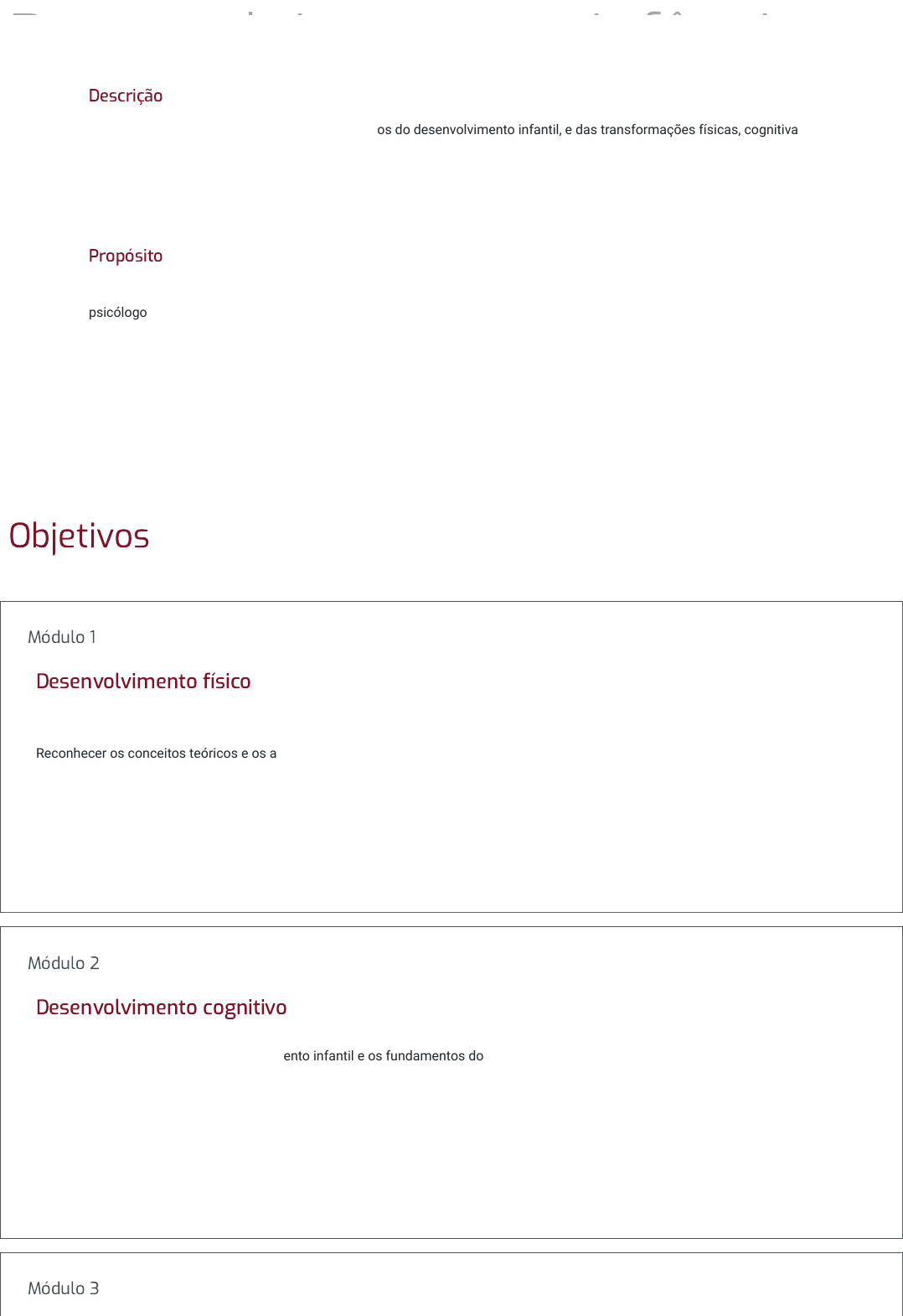 Objetivos Módulo 1 Desenvolvimento físico Reconhecer os conceitos teóricos e os aspectos do crescimento e do desenvolvimento físico, bem como as diferenças e similaridades da primeira, segunda e terceira infâncias. Acessar módulo Módulo 2 Desenvolvimento cognitivo Identificar os pensadores do desenvolvimento infantil e os fundamentos do desenvolvimento cognitivo na primeira, segunda e terceira infâncias. Acessar módulo Módulo 3 Desenvolvimento na infância Prof.ª Crismarie Hackenberg Descrição Definição e conceituação teórica dos fundamentos do desenvolvimento infantil, e das transformações físicas, cognitivas, emocionais e psicossociais envolvidas, com segmentação nos três períodos da infância e suas faixas etárias respectivas. Propósito O conhecimento sobre as teorias de desenvolvimento humano envolvidas no estudo da fase da infância amplia a visão do psicólogo em sua prática profissional clínica e institucional, tornando mais eficaz sua prática e pesquisa com profundidade. Marcos de desenvolvimento Reconhecer os marcos de desenvolvimento da infância e as características dos marcos motores, sociais e emocionais. Acessar módulo Introdução O campo do desenvolvimento humano é constituído por estudos científicos de avaliação sobre as mudanças nas pessoas, bem como a observação das características que permanecem relativamente estáveis durante toda a vida. Desde que os seres humanos existem, o interesse pelo desenvolvimento humano tem ocorrido. Contudo, o seu estudo científico formal é relativamente novo. Desde o início do século XIX, diversas tendências e especialidades acadêmicas, tanto da saúde como da educação, preparam o caminho para o estudo científico do desenvolvimento infantil. Platão, na Grécia Antiga, já mencionava os ciclos de 7 em 7 anos no desenvolvimento humano, mas foi no século XX que as mudanças puderam ser organizadas e estabelecidas em mudanças e marcos relacionados mais especificamente com o avanço da idade. Sobre a visão do ciclo da vida, Papalia, Olds e Feldman (2006) descrevem o ciclo vital em oito períodos: pré-natal; primeira infância; segunda infância; terceira infância; adolescência; jovem adulto; meia-idade; e terceira idade. De outra forma, muitos autores propuseram utilizar divisões um pouco diferentes, pensando as etapas do ciclo em forma de marcos etários distintos. O enfoque deste conteúdo será a abordagem da infância, especificamente da primeira, segunda e terceira infâncias, com a divisão etária proposta por Papalia, Olds e Feldman (2006). Essas fases serão explicadas e relacionadas dentro de três temas centrais: o desenvolvimento físico, o desenvolvimento cognitivo e a apresentação dos marcos de desenvolvimento na infância. Nosso olhar também abordará algumas considerações sobre o desenvolvimento dos repertórios emocional e social. 1 Desenvolvimento físico Ao final deste módulo, você será capaz de reconhecer os conceitos teóricos e os aspectos do crescimento e do desenvolvimento físico, bem como as diferenças e similaridades da primeira, segunda e terceira infâncias. Ligando os pontos O conceito de infância passou por transformações ao longo do tempo, até chegar na compreensão que temos atualmente. Como será que se desenvolveram esses estudos? Só a Pedagogia estudou a questão ou outras áreas também? Vamos ver o caso de Lucas. Numa creche da rede pública do interior do Rio de Janeiro, estuda Lucas, uma criança de 3 anos que ingressa pela primeira vez no processo de escolarização. Lucas mora desde seu nascimento com sua mãe e sua avó materna, ambas viúvas que trabalham cerca de 8 horas por dia. Lucas ficava na casa da vizinha todos os dias, menos aos finais de semana, para que sua mãe e sua avó pudessem trabalhar. Durante todo o tempo que Lucas estava na casa da vizinha, ficava assistindo televisão ou brincando com poucos brinquedos, não voltados para sua faixa etária. A vizinha que ficava com Lucas pouco se dirigia a ele com conversas ou estímulos, até porque ela também trabalhava em sua residência. Lucas não tinha uma alimentação adequada para sua idade, diante das dificuldades socioeconômicas que sua família estava inserida. Sua residência também não tinha saneamento básico, o que propiciava a Lucas recorrentes adoecimentos. Neste ano, Lucas conseguiu uma vaga na creche pública próxima a sua residência em período integral, para que pudesse receber os estímulos necessários para seu desenvolvimento, bem como possibilitar que sua mãe e sua avó pudessem trabalhar com mais tranquilidade. Logo nos primeiros dias de adaptação de Lucas à creche, a professora observou que Lucas apresentava uma linguagem pouco desenvolvida para sua idade, baixa estatura e não compreendia bem os comandos simples que a professora direcionava a ele. A linguagem deficitária começou a impactar a interação com os colegas, bem como a adaptação aos espaços escolares no desenvolvimento pedagógico inicial. Por isso, Lucas foi encaminhado para a equipe multidisciplinar da unidade escolar, composta por psicólogo, psicopedagogo e fonoaudiólogo, para que juntos pudessem colaborar para o melhor desenvolvimento do aluno. A equipe, em uma breve avaliação do desenvolvimento do aluno e história de vida por meio de uma reunião com a mãe e a avó do aluno, pôde sugerir que Lucas estava com seus marcos do desenvolvimento em atraso e/ou defasagem em relação a sua idade cronológica, o que demandaria maiores estímulos e possíveis acompanhamentos. Após a leitura docaso, é hora de aplicar seus conhecimentos! Vamos ligar os pontos! Após a leitura do caso, é hora de aplicar seus conhecimentos! Vamos ligar os pontos! Questão 1 Os primeiros anos de vida assumem papel importantíssimo no desenvolvimento do ser humano. No caso apresentado, o aluno Lucas teve seus primeiros anos de vida marcado por desafios e vulnerabilidade de diversas ordens