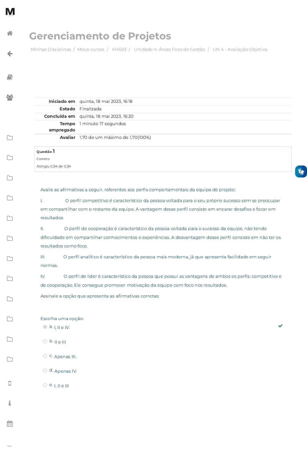 18/05/2023, 16:17 UN 4 - Avaliação Objetiva: Revisão da tentativa https://avap.multivix.edu.br/mod/quiz/review.php?attempt=3052731&cmid=1310848 1/4 Minhas Disciplinas / Meus cursos / 414593 / Unidade 4: Áreas Foco de Gestão / UN 4 - Avaliação Objetiva Gerenciamento de Projetos Iniciado em quinta, 18 mai 2023, 16:18 Estado Finalizada Concluída em quinta, 18 mai 2023, 16:20 Tempo empregado 1 minuto 17 segundos Avaliar 1,70 de um máximo de 1,70(100%) Questão 1 Correto Atingiu 0,34 de 0,34 Avalie as a�rmativas a seguir, referentes aos per�s comportamentais da equipe de projeto: I. O per�l competitivo é característico da pessoa voltada para o seu próprio sucesso sem se preocupar em compartilhar com o restante da equipe. A vantagem desse per�l consiste em encarar desa�os e focar em resultados. II. O per�l de cooperação é característico da pessoa voltada para o sucesso da equipe, não tendo di�culdade em compartilhar conhecimentos e experiências. A desvantagem desse per�l consiste em não ter os resultados como foco. III. O per�l analítico é característico da pessoa mais moderna, já que apresenta facilidade em seguir normas. IV. O per�l de líder é característico da pessoa que possui as vantagens de ambos os per�s: competitivo e de cooperação. Ele consegue promover motivação da equipe com foco nos resultados. Assinale a opção que apresenta as a�rmativas corretas: Escolha uma opção: a. I, II e IV. b. II e III c. Apenas III. d. Apenas IV. e. I, II e III https://avap.multivix.edu.br/my/ https://avap.multivix.edu.br/course/view.php?id=20094 https://avap.multivix.edu.br/course/view.php?id=20094§ion=5 https://avap.multivix.edu.br/mod/quiz/view.php?id=1310848 https://avap.multivix.edu.br/my/ https://avap.multivix.edu.br/course/view.php?id=20094 https://avap.multivix.edu.br/user/index.php?id=20094 https://avap.multivix.edu.br/course/view.php?id=20094§ion=1 https://avap.multivix.edu.br/course/view.php?id=20094§ion=2 https://avap.multivix.edu.br/course/view.php?id=20094§ion=3 https://avap.multivix.edu.br/course/view.php?id=20094§ion=4 https://avap.multivix.edu.br/course/view.php?id=20094§ion=5 https://avap.multivix.edu.br/course/view.php?id=20094§ion=6 https://avap.multivix.edu.br/course/view.php?id=20094§ion=7 https://avap.multivix.edu.br/course/view.php?id=20094§ion=8 https://avap.multivix.edu.br/course/view.php?id=20094§ion=9 https://avap.multivix.edu.br/course/view.php?id=20094§ion=10 https://avap.multivix.edu.br/course/view.php?id=20094§ion=11 https://avap.multivix.edu.br/course/view.php?id=20094§ion=12 https://avap.multivix.edu.br/hooks/portal/ https://avap.multivix.edu.br/mod/page/view.php?id=1252%2F%22%20target%3D%22_blank https://avap.multivix.edu.br/calendar/view.php/ https://avap.multivix.edu.br/local/staticpage/view.php?page=biblioteca https://avap.multivix.edu.br/ 18/05/2023, 16:17 UN 4 - Avaliação Objetiva: Revisão da tentativa https://avap.multivix.edu.br/mod/quiz/review.php?attempt=3052731&cmid=1310848 2/4 Questão 2 Correto Atingiu 0,34 de 0,34 Questão 3 Correto Atingiu 0,34 de 0,34 Em relação ao gerenciamento da qualidade, avalie as a�rmações a seguir e a relação proposta entre elas: I) A qualidade tem sua de�nição voltada para o adequado atendimento às necessidades do cliente porque II) Permite a identi�cação dos índices de qualidade estabelecidos no projeto e a segurança de alcança-los. A respeito dessas asserções, assinale a opção correta. Escolha uma opção: a. Ambas as asserções são falsas. b. A primeira asserção é uma proposição falsa e a segunda é verdadeira. c. As duas asserções são proposições verdadeiras, mas a segunda não é uma justi�cativa correta da primeira. d. As duas asserções são proposições verdadeiras e a segunda é uma justi�cativa correta da primeira. e. A primeira asserção é uma proposição verdadeira, e a segunda é falsa. Intuitivamente percebemos que as pessoas que compõem uma equipe é o principal recurso de um projeto, tendo in�uência direta em seu sucesso. O planejamento da gestão de pessoas tem como objetivo de�nir as responsabilidades e apresentar as relações hierárquicas do projeto. Avalie as a�rmativas a seguir, no que se refere aos fatores que devem ser considerados na elaboração do planejamento da equipe. I. De�nição para cada função o grau de autoridade; responsabilidades e competências esperadas. II. Elaboração do plano de cargos e salários, além dos aspectos de ascensão entre níveis hierárquicos; de�nição de horários, condições de hora extra, liberação e folgas. III. Incentivo em treinamentos. IV. De�nição de critérios para premiações. Assinale a opção que apresenta as a�rmativas corretas: Escolha uma opção: a. Apenas a I b. II e IV c. I, II, III e IV d. I, III e IV e. II, III e IV https://avap.multivix.edu.br/my/ https://avap.multivix.edu.br/course/view.php?id=20094 https://avap.multivix.edu.br/user/index.php?id=20094 https://avap.multivix.edu.br/course/view.php?id=20094§ion=1 https://avap.multivix.edu.br/course/view.php?id=20094§ion=2 https://avap.multivix.edu.br/course/view.php?id=20094§ion=3 https://avap.multivix.edu.br/course/view.php?id=20094§ion=4 https://avap.multivix.edu.br/course/view.php?id=20094§ion=5 https://avap.multivix.edu.br/course/view.php?id=20094§ion=6 https://avap.multivix.edu.br/course/view.php?id=20094§ion=7 https://avap.multivix.edu.br/course/view.php?id=20094§ion=8 https://avap.multivix.edu.br/course/view.php?id=20094§ion=9 https://avap.multivix.edu.br/course/view.php?id=20094§ion=10 https://avap.multivix.edu.br/course/view.php?id=20094§ion=11 https://avap.multivix.edu.br/course/view.php?id=20094§ion=12 https://avap.multivix.edu.br/hooks/portal/ https://avap.multivix.edu.br/mod/page/view.php?id=1252%2F%22%20target%3D%22_blank https://avap.multivix.edu.br/calendar/view.php/ https://avap.multivix.edu.br/local/staticpage/view.php?page=bibliote
