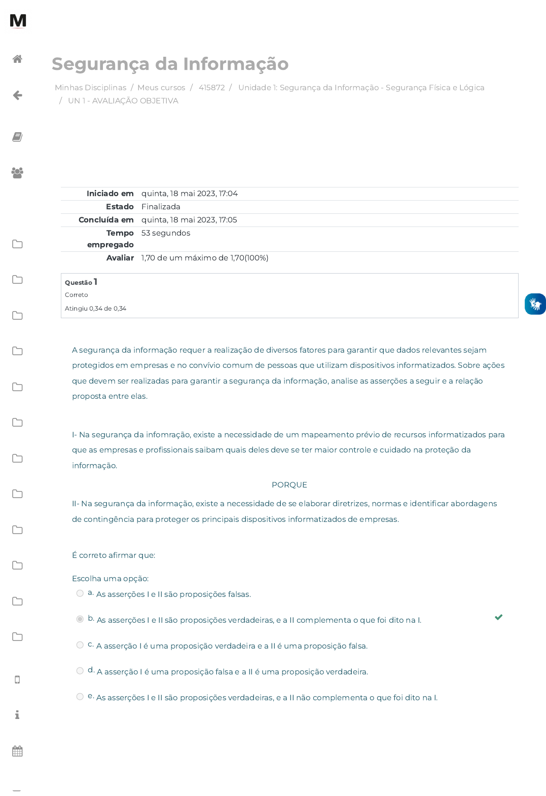 18/05/2023, 17:05 UN 1 - AVALIAÇÃO OBJETIVA: Revisão da tentativa https://avap.multivix.edu.br/mod/quiz/review.php?attempt=3053104&cmid=1306519 1/4 Minhas Disciplinas / Meus cursos / 415872 / Unidade 1: Segurança da Informação - Segurança Física e Lógica / UN 1 - AVALIAÇÃO OBJETIVA Segurança da Informação Iniciado em quinta, 18 mai 2023, 17:04 Estado Finalizada Concluída em quinta, 18 mai 2023, 17:05 Tempo empregado 53 segundos Avaliar 1,70 de um máximo de 1,70(100%) Questão 1 Correto Atingiu 0,34 de 0,34 A segurança da informação requer a realização de diversos fatores para garantir que dados relevantes sejam protegidos em empresas e no convívio comum de pessoas que utilizam dispositivos informatizados. Sobre ações que devem ser realizadas para garantir a segurança da informação, analise as asserções a seguir e a relação proposta entre elas. I- Na segurança da infomração, existe a necessidade de um mapeamento prévio de recursos informatizados para que as empresas e pro�ssionais saibam quais deles deve se ter maior controle e cuidado na proteção da informação. PORQUE II- Na segurança da informação, existe a necessidade de se elaborar diretrizes, normas e identi�car abordagens de contingência para proteger os principais dispositivos informatizados de empresas. É correto a�rmar que: Escolha uma opção: a. As asserções I e II são proposições falsas. b. As asserções I e II são proposições verdadeiras, e a II complementa o que foi dito na I. c. A asserção I é uma proposição verdadeira e a II é uma proposição falsa. d. A asserção I é uma proposição falsa e a II é uma proposição verdadeira. e. As asserções I e II são proposições verdadeiras, e a II não complementa o que foi dito na I. https://avap.multivix.edu.br/my/ https://avap.multivix.edu.br/course/view.php?id=20165 https://avap.multivix.edu.br/course/view.php?id=20165§ion=2 https://avap.multivix.edu.br/mod/quiz/view.php?id=1306519 https://avap.multivix.edu.br/my/ https://avap.multivix.edu.br/course/view.php?id=20165 https://avap.multivix.edu.br/user/index.php?id=20165 https://avap.multivix.edu.br/course/view.php?id=20165§ion=1 https://avap.multivix.edu.br/course/view.php?id=20165§ion=2 https://avap.multivix.edu.br/course/view.php?id=20165§ion=3 https://avap.multivix.edu.br/course/view.php?id=20165§ion=4 https://avap.multivix.edu.br/course/view.php?id=20165§ion=5 https://avap.multivix.edu.br/course/view.php?id=20165§ion=6 https://avap.multivix.edu.br/course/view.php?id=20165§ion=7 https://avap.multivix.edu.br/course/view.php?id=20165§ion=8 https://avap.multivix.edu.br/course/view.php?id=20165§ion=9 https://avap.multivix.edu.br/course/view.php?id=20165§ion=10 https://avap.multivix.edu.br/course/view.php?id=20165§ion=11 https://avap.multivix.edu.br/course/view.php?id=20165§ion=12 https://avap.multivix.edu.br/hooks/portal/ https://avap.multivix.edu.br/mod/page/view.php?id=1252%2F%22%20target%3D%22_blank https://avap.multivix.edu.br/calendar/view.php/ https://avap.multivix.edu.br/local/staticpage/view.php?page=biblioteca https://avap.multivix.edu.br/ 18/05/2023, 17:05 UN 1 - AVALIAÇÃO OBJETIVA: Revisão da tentativa https://avap.multivix.edu.br/mod/quiz/review.php?attempt=3053104&cmid=1306519 2/4 Questão 2 Correto Atingiu 0,34 de 0,34 Questão 3 Correto Atingiu 0,34 de 0,34 Entre os aspectos importantes relativos à segurança de sistemas de informação, incluem-se: I - A existência de um plano de recuperação de desastres associado a uma estratégia de backups frequentes; II - A utilização de �rewalls para oferecer proteção contra-ataques originados de dentro e de fora da rede que estão protegendo, associada a mecanismos de detecção de intrusão; III - A proteção de dados utilizando senhas e criptogra�a forte e algoritmos de chave simétrica que utilizam senhas diferentes para encriptação e desencriptarão. Está(ão) correto(s) o(s) item(ns): a. I e II, apenas. b. II, apenas. c. III, apenas. d. I, II e III. e. I, apenas. A segurança da informação apresenta diversos aspectos para proteger os dados em empresas e na vida das pessoas. Para tal, ela de�ne regras, auxilia na criação de softwares e técnicas para auxiliar na proteção de transmissão de dados. Uma pro�ssão importante dentro desse contexto é a do analista de sistemas, que atua com a proteção dos dados. Sobre a segurança da informação e o contexto no qual ela está envolvida, marque a alternativa correta. Escolha uma opção: a. A segurança da informação trabalha com pro�ssionais de áreas distintas, para auxiliar na violação de dados envolvidos nas decisões dos maiores cargos da empresa. b. A segurança da informação é responsável por proteger o tráfego de informações, excetuando aquelas que são fundamentais para a tomada de decisões, que devem ser feitas por analistas. c. A segurança da informação necessita de pro�ssionais quali�cados para tratar as violações de segurança da informação. d. A segurança da informação necessita de especialistas para tratar os bens da empresa, mesmo aqueles não relevantes, que estão envolvidos na transmissão dos dados. e. A segurança da informação deve optar por pro�ssionais que protejam, mas não controlem as requisições de dados nos meios informatizados. https://avap.multivix.edu.br/my/ https://avap.multivix.edu.br/course/view.php?id=20165 https://avap.multivix.edu.br/user/index.php?id=20165 https://avap.multivix.edu.br/course/view.php?id=20165§ion=1 https://avap.multivix.edu.br/course/view.php?id=20165§ion=2 https://avap.multivix.edu.br/course/view.php?id=20165§ion=3 https://avap.multivix.edu.br/course/view.php?id=20165§ion=4 https://avap.multivix.edu.br/course/view.php?id=20165§ion=5 https://avap.multivix.edu.br/course/view.php?id=20165§ion=6 https://avap.multivix.edu.br/course/view.php?id=20165§ion=7 https://avap.multivix.edu.br/course/view.php?id=20165§ion=8 https:/