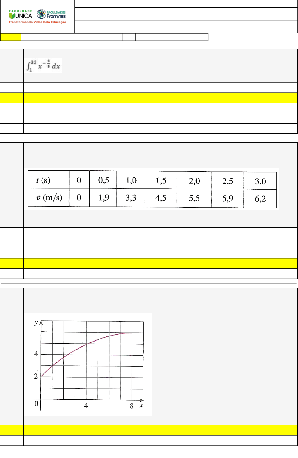 10/05/2023 20:13:40 1/3 REVISÃO DE SIMULADO Nome: PAULO SERGIO DOS SANTOS SUBTIL Disciplina: Cálculo II Respostas corretas são marcadas em amarelo X Respostas marcardas por você. Questão 001 Por meio o teorema fundamental do cálculo (parte 2) pode-se calcular o valor de Dessa forma, o valor encontrado é : A) 3/2 X B) 5/2 C) 1/2 D) 2 E) 1 Questão 002 A velocidade de um corredor aumenta regularmente durante os três primeiros segundos de uma corrida. Sua velocidade em intervalos de meio segundo é dada em uma tabela: Utilizando os extremos esquerdos de cada intervalo podemos dizer que a distância percorrida pelo atleta é A) 11,55 B) 12,55 X C) 14,55 D) 10,55 E) 13,55 Questão 003 Lendo os valores do gráfico dado da função ƒ(x), utilize o extremo esquerdo de quatro retângulos para encontrar as estimativas para a área sob o gráfico dado da função de x = 0 até x = 8. Fazendo o que se pede, podemos afirmar que a área encontrada será A) 33 X B) 31 10/05/2023 20:13:40 2/3 C) 34 D) 30 E) 32 Questão 004 Calculando a integral em termos de áreas obtemos como resultado : A) 2/3 B) 2/5 C) 5/2 D) 1 X E) 3/2 Questão 005 Utilizando a forma da definição para calcular a integral encontramos como resultado : A) 1 X B) 2/3 C) 4/3 D) 1/3 E) 5/3 Questão 006 Utilizando a forma da definição para calcular a integral encontramos como resultado : A) 13/6 B) 5/6 C) 7/6 X D) 1/6 E) 11/6 Questão 007 A velocidade de um corredor aumenta regularmente durante os três primeiros segundos de uma corrida. Sua velocidade em intervalos de meio segundo é dada em uma tabela: Utilizando os extremos direitos de cada intervalo podemos dizer que a distância percorrida pelo atleta é A) 12,65 B) 11,65 X C) 13,65 D) 10,65 E) 14,65 10/05/2023 20:13:40 3/3 Questão 008 Óleo vaza de um tanque a uma taxa de r(t) litros por hora. A taxa decresce à medida que o tempo passa e os valores da taxa em intervalos de duas horas são mostradas na tabela a seguir. Utilizando uma estimativa superior, ou seja, extremos direitos dos retângulos, podemos dizer que a quantidade total de óleo que vazou é aproximadamente A) 70. B) 71. X C) 72. D) 69. E) 73.